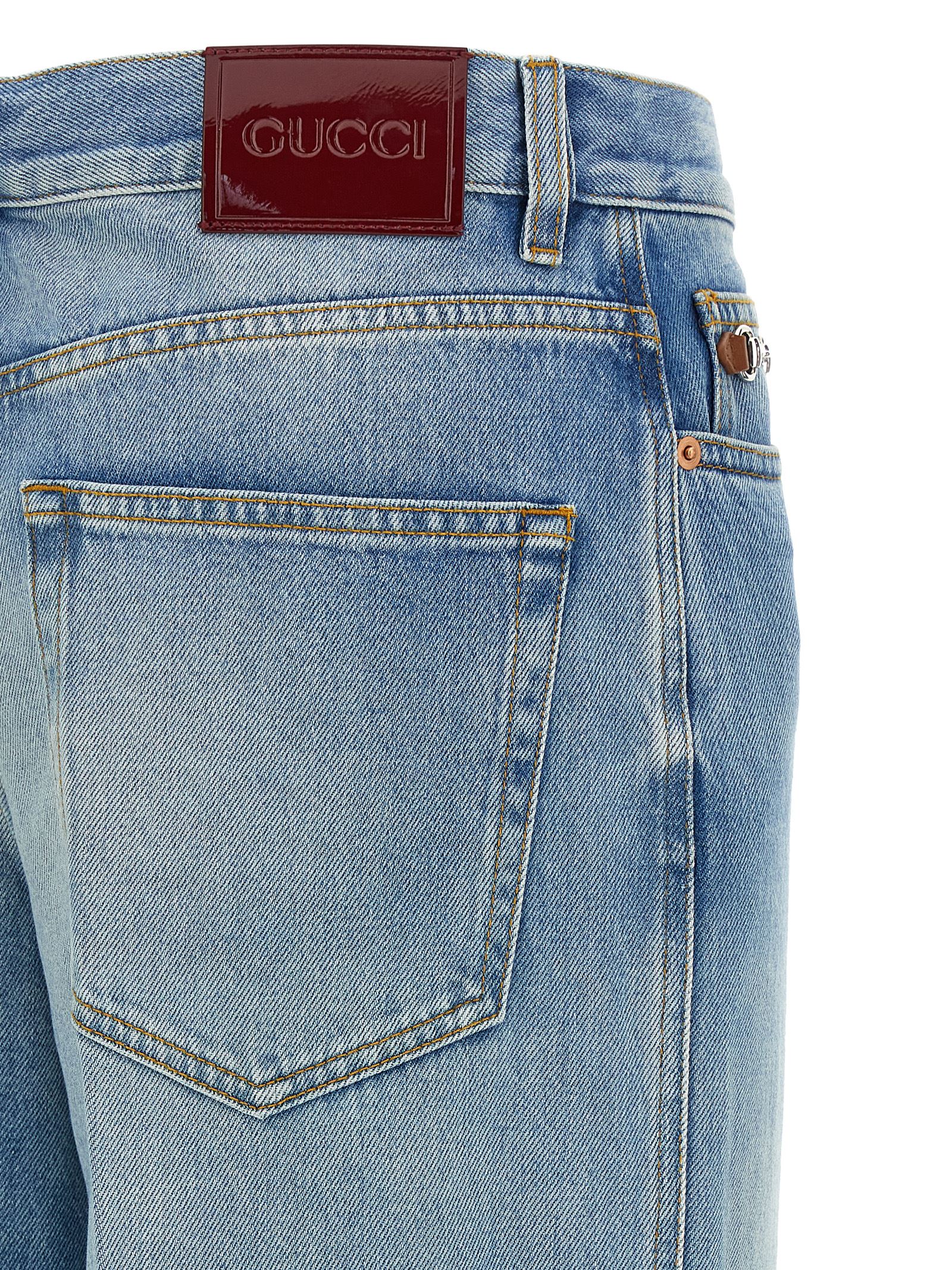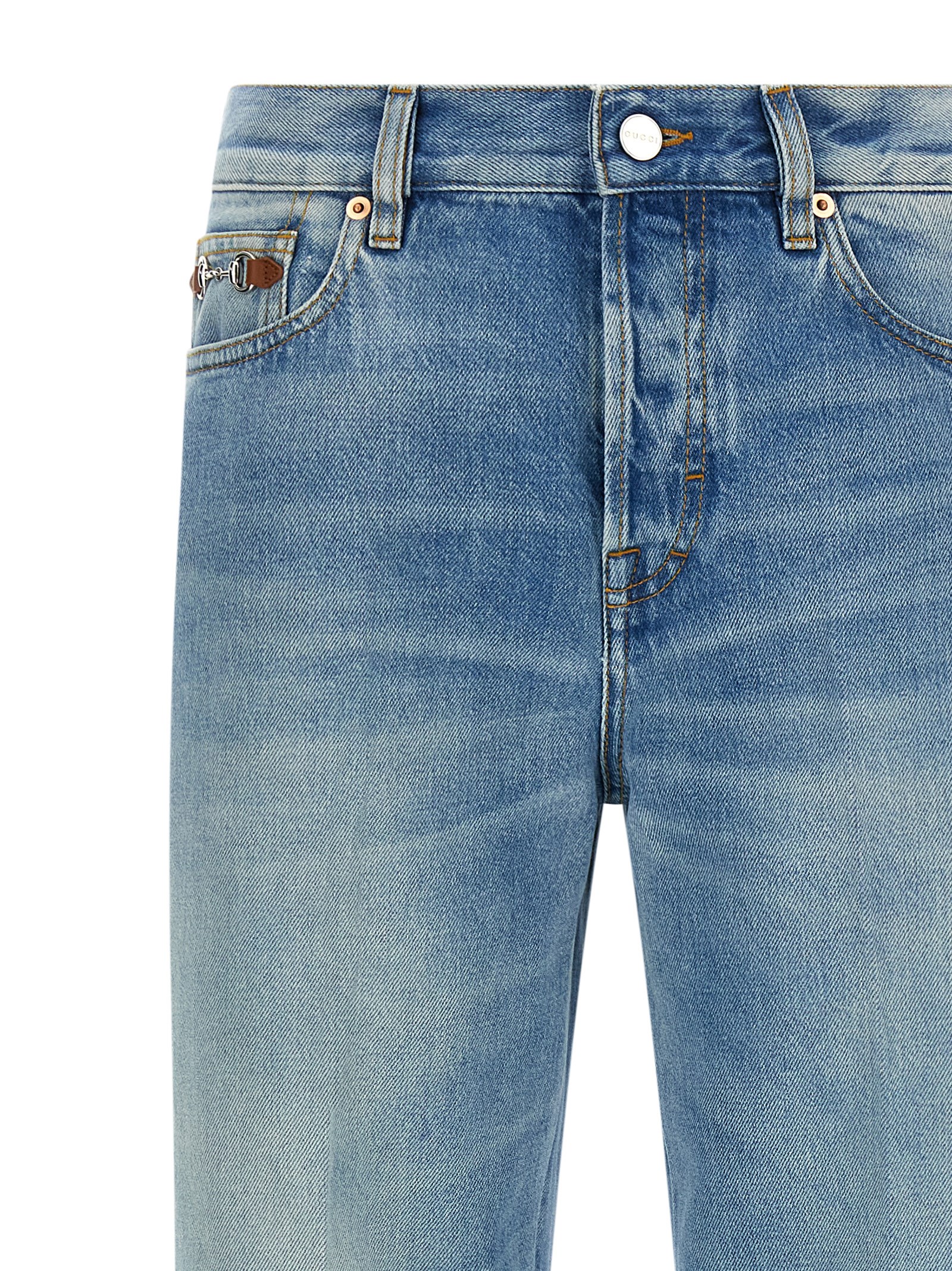 Cotton denim jeans with lightened stone-washed treatment, front leather and metal clamp detail, contrast stitching, flared leg, front button closure, five pockets, ‘Gucci Rosso Ancora’ naplak logo label at the back.