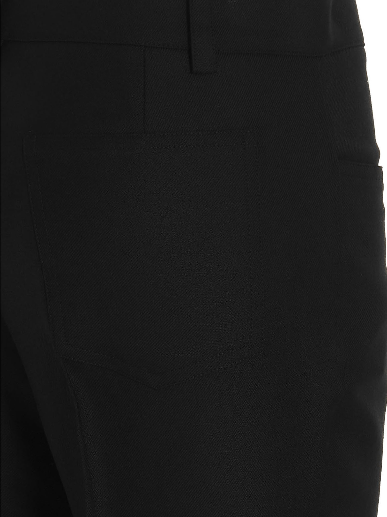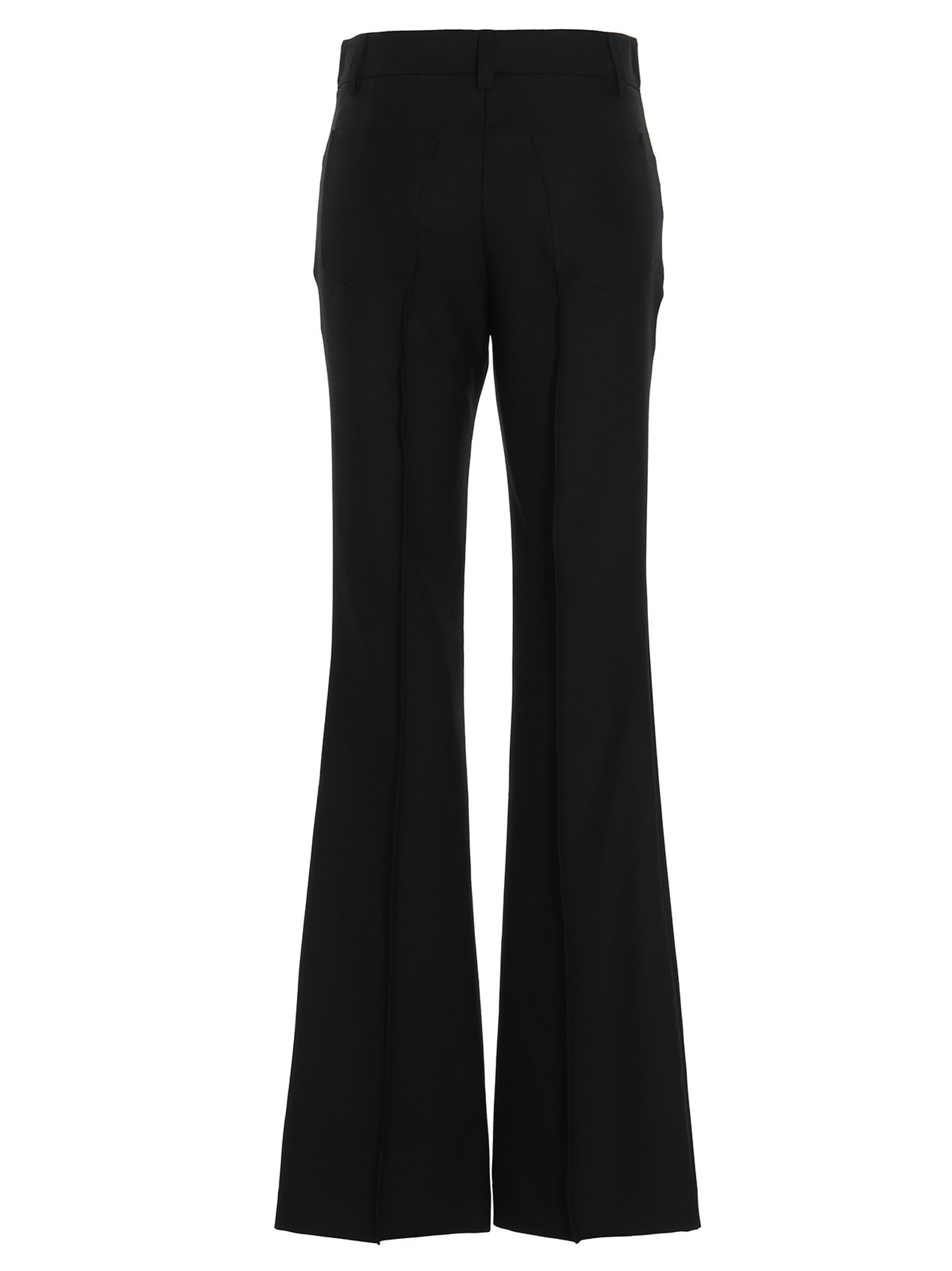 Wool pants with a wide leg, pleats and a central crease, a zip and button closure, pockets.