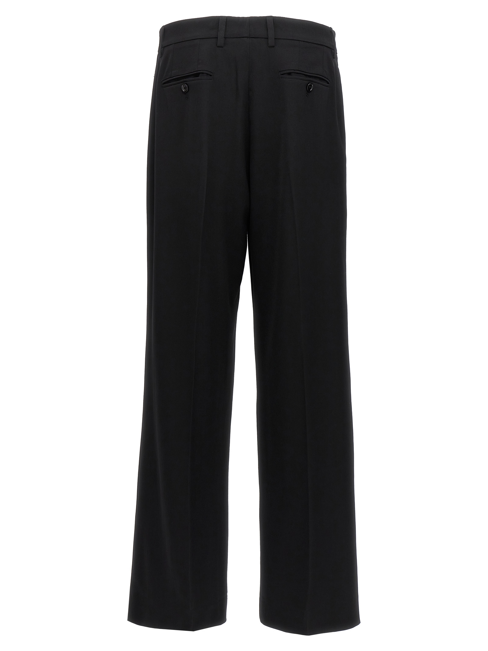 Flared pants in stretch wool canvas, pleats, zip and button closure, pockets.
