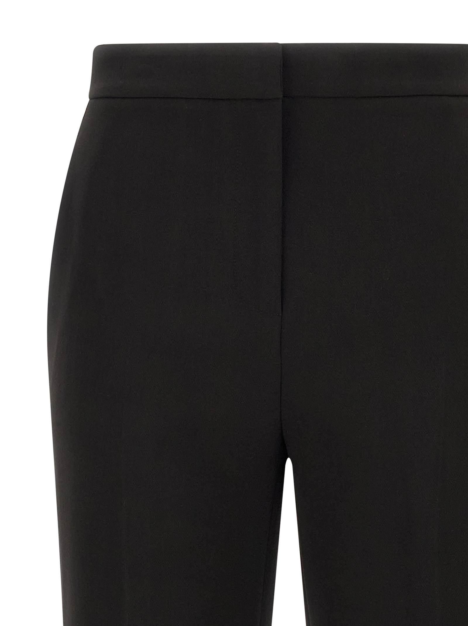 Cady pants, flared leg, metal Oval T logo plaque on the back, zip hook and front button closure, pockets.