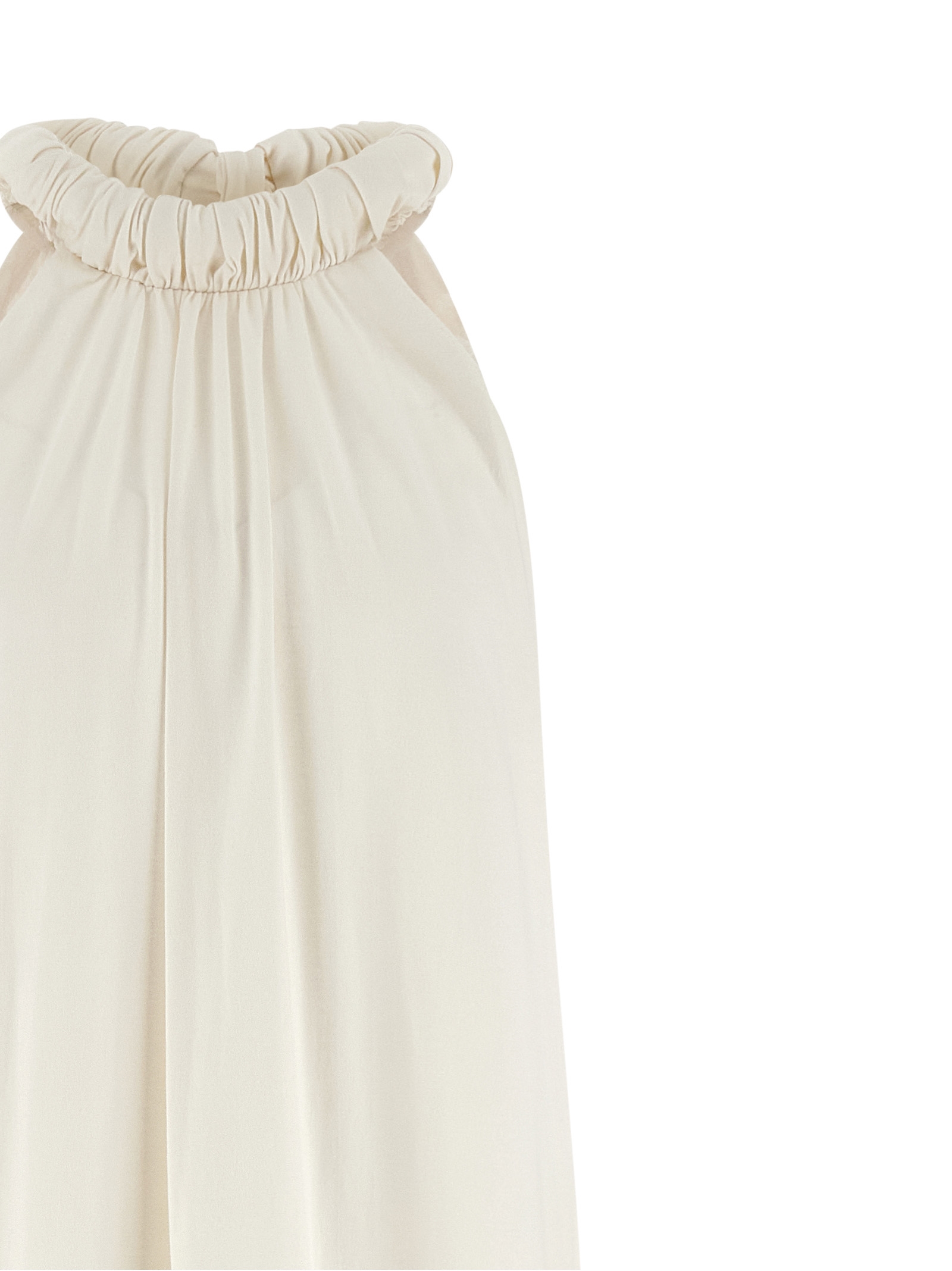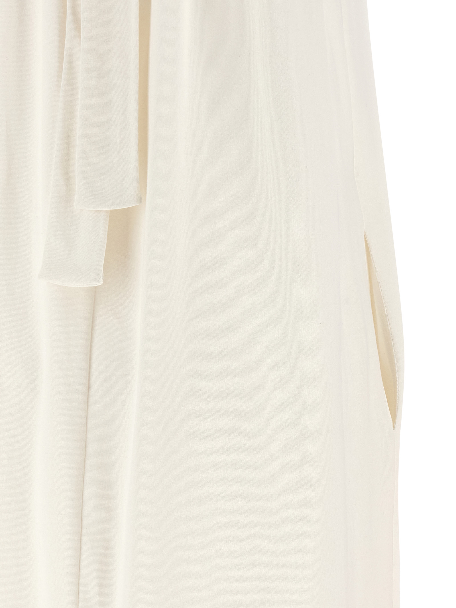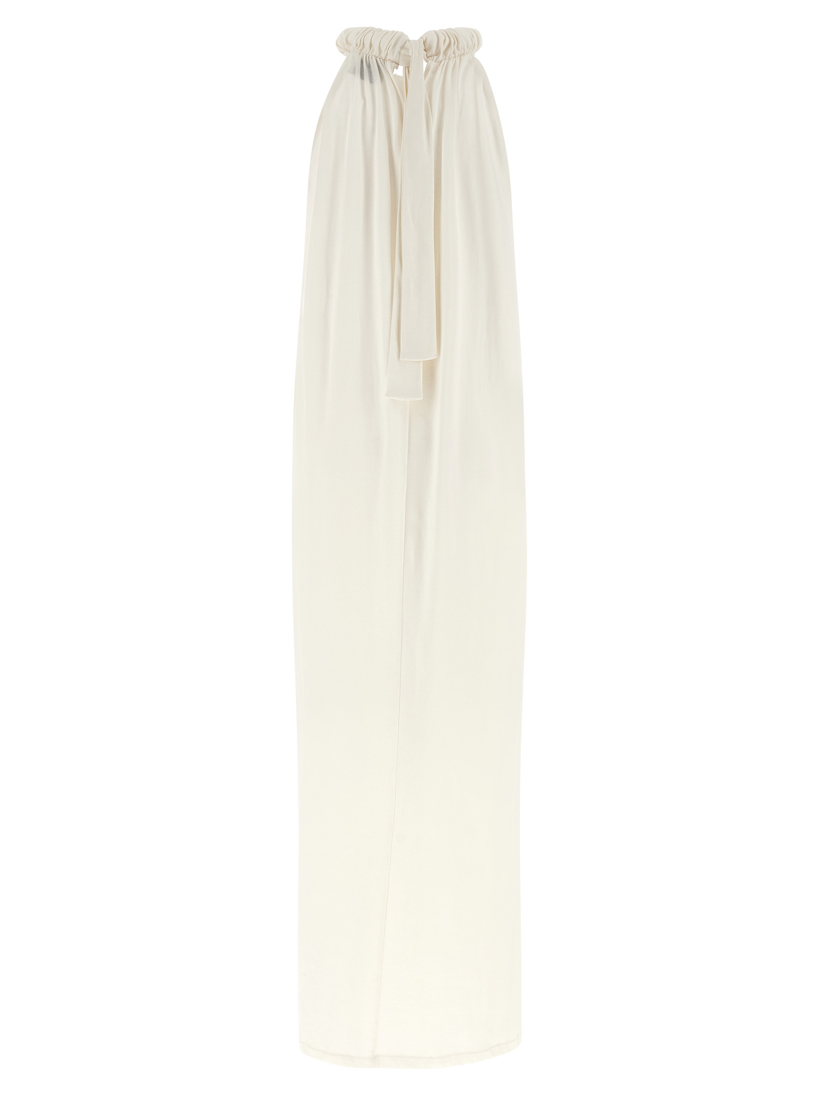 Long ‘Floor Lenght’ cotton jersey dress with American neckline with curl and jersey mazi coulisse knotted at the back, back V-neck, sleeveless.