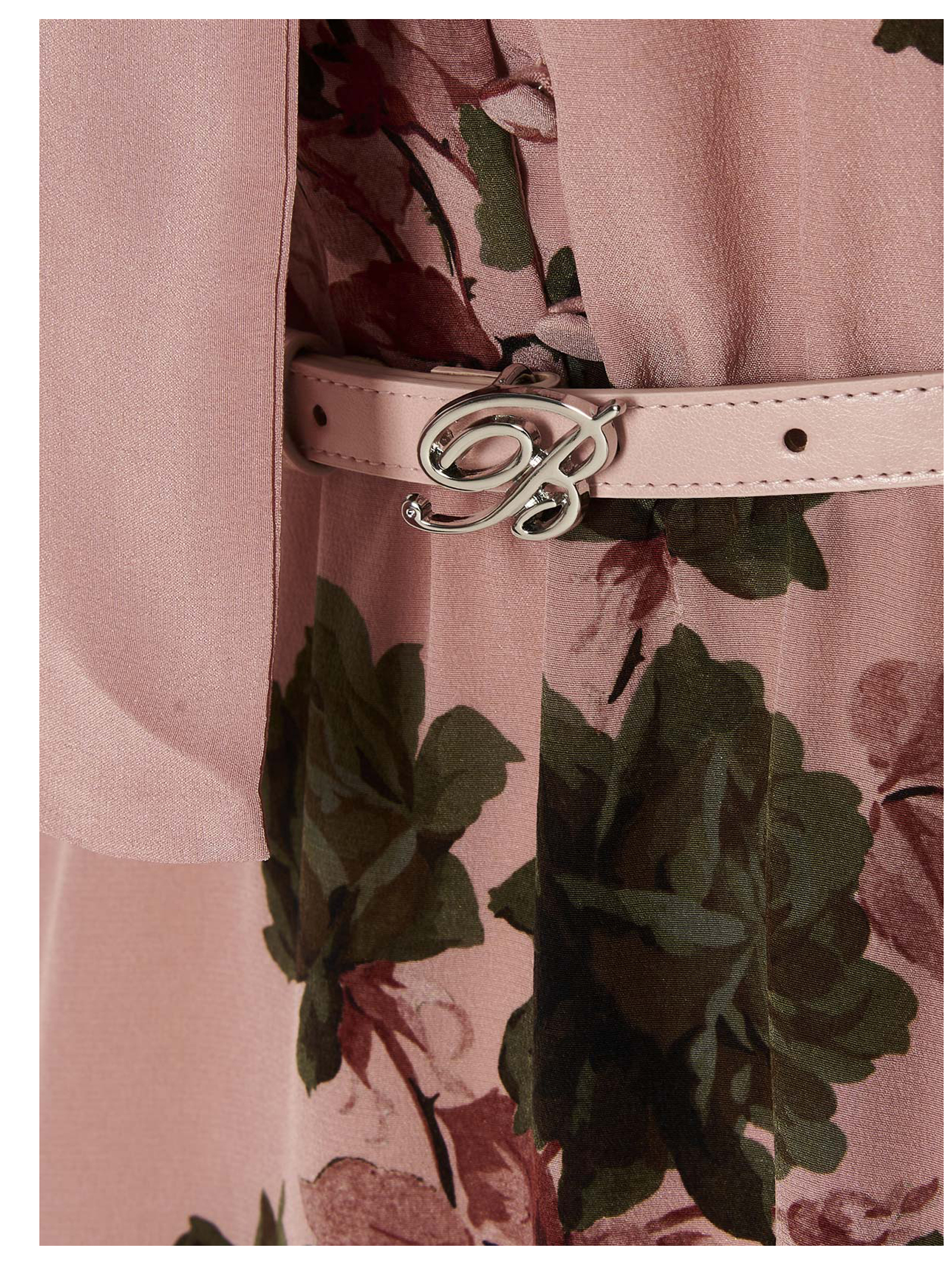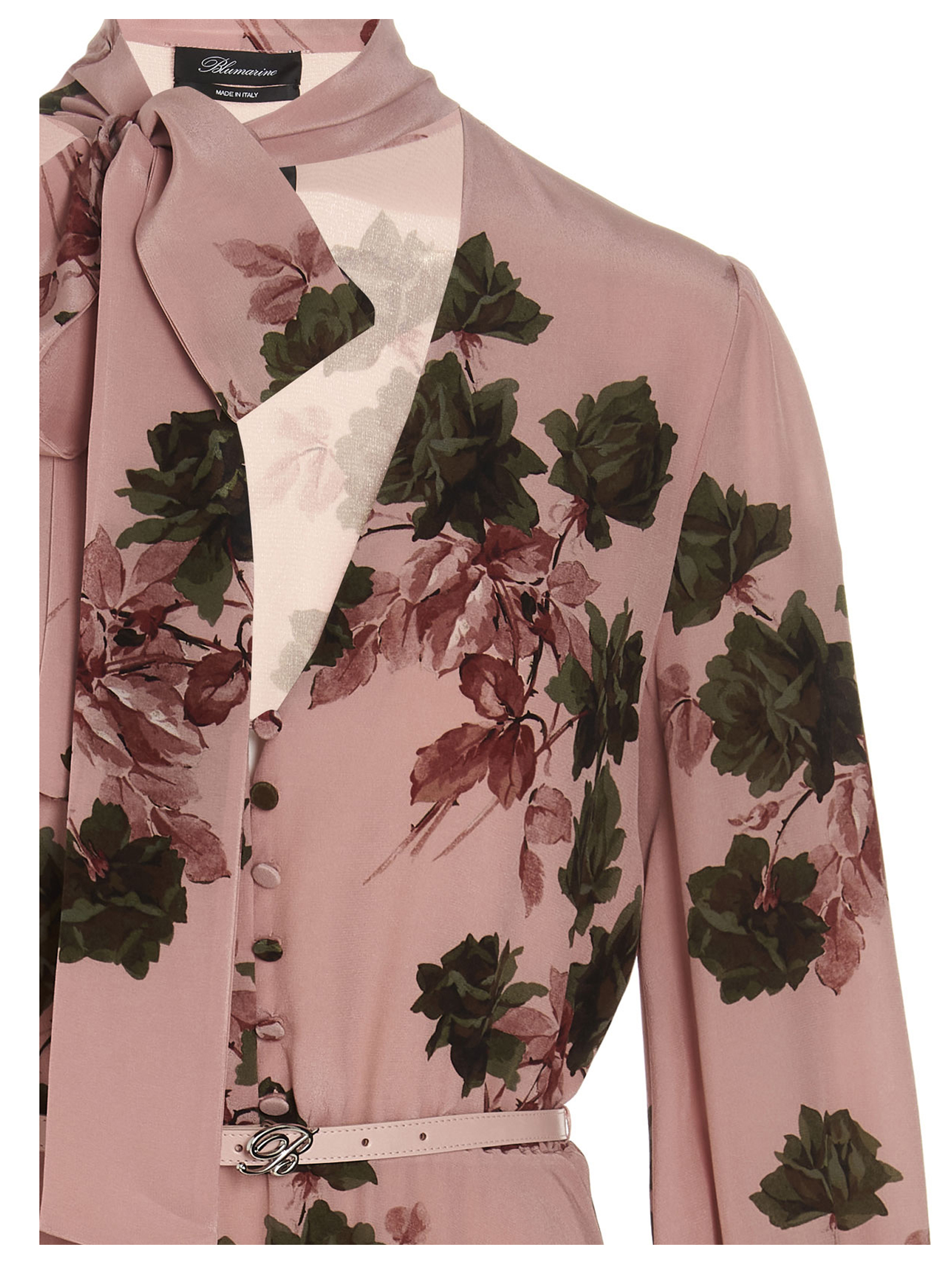 Floral printed silk dress with a V-neck and buttons, long sleeves.