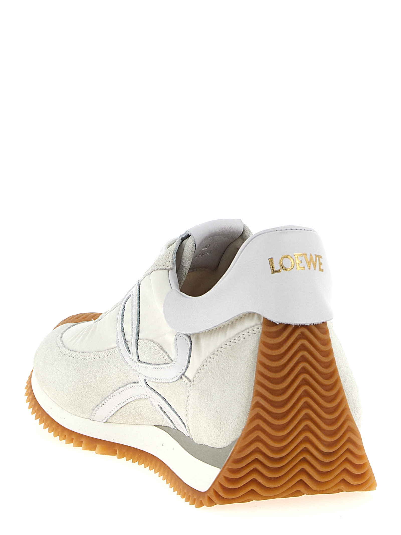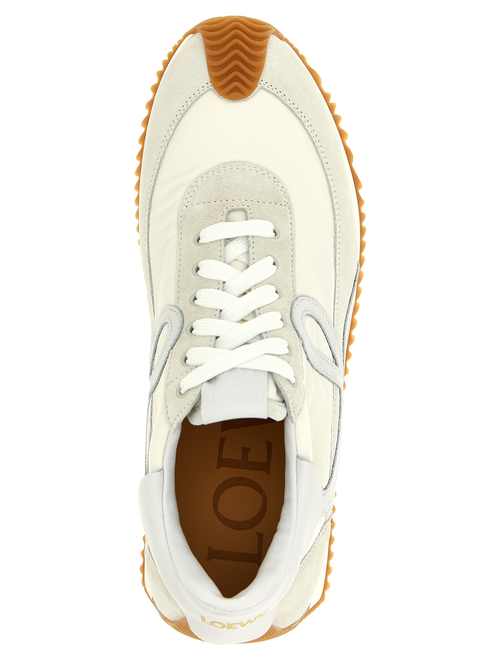 ‘Flow Runner’ suede and nylon sneakers with leather L-monogram and honey-colored rubber wave sole and lace-up closure.