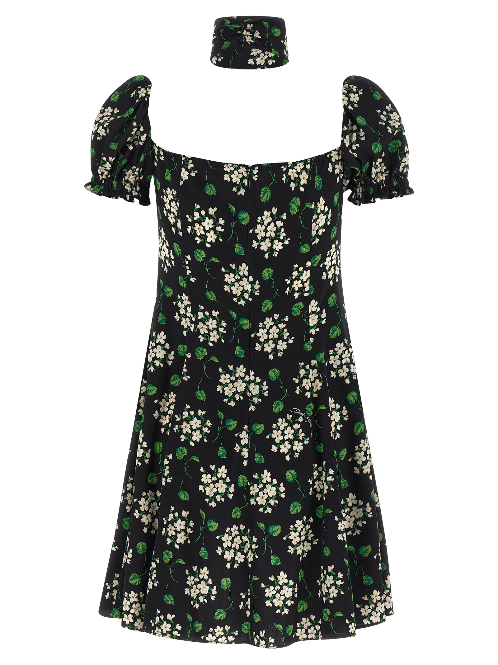 Mini dress in all-over floral print silk charmeuse, slightly flared model, sweetheart neckline, short sleeves curled with elastic, back closure with hidden zip, collar detail with buttons.