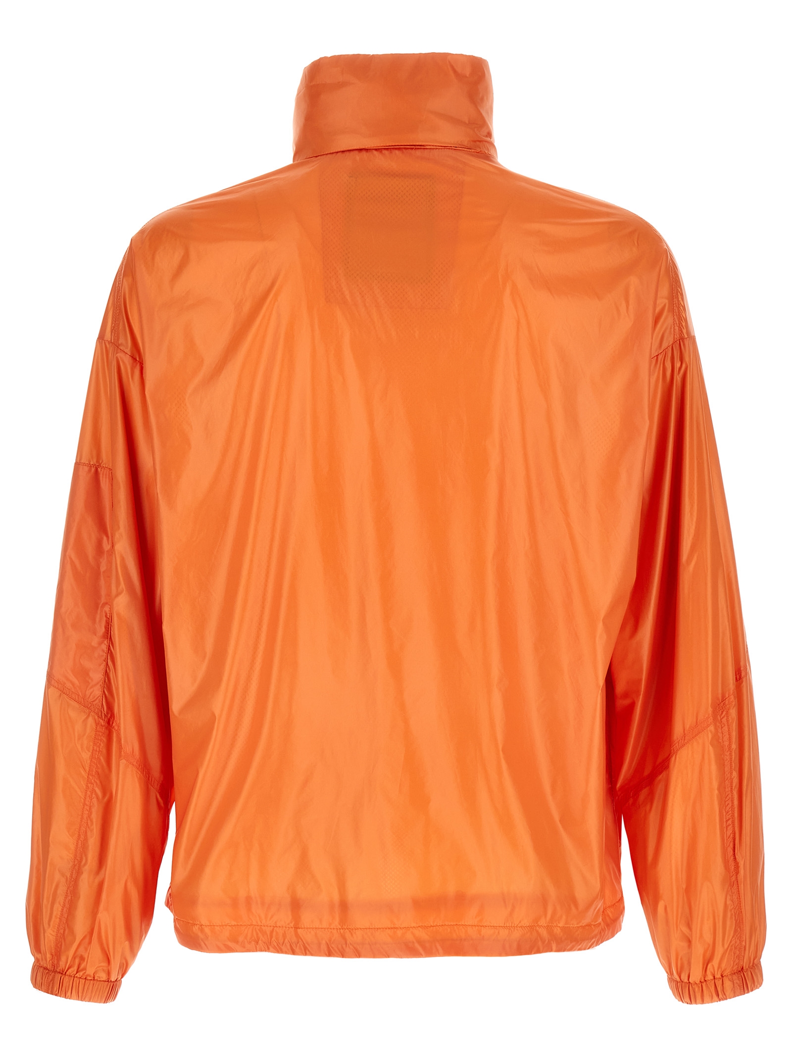 Water-repellent ultralight technical fabric jacket, mesh lining, standing collar with removable adjustable hood, front zip closure, pockets, long sleeves with elastic cuffs, drawstring on the hem, foldable into the inner pocket.