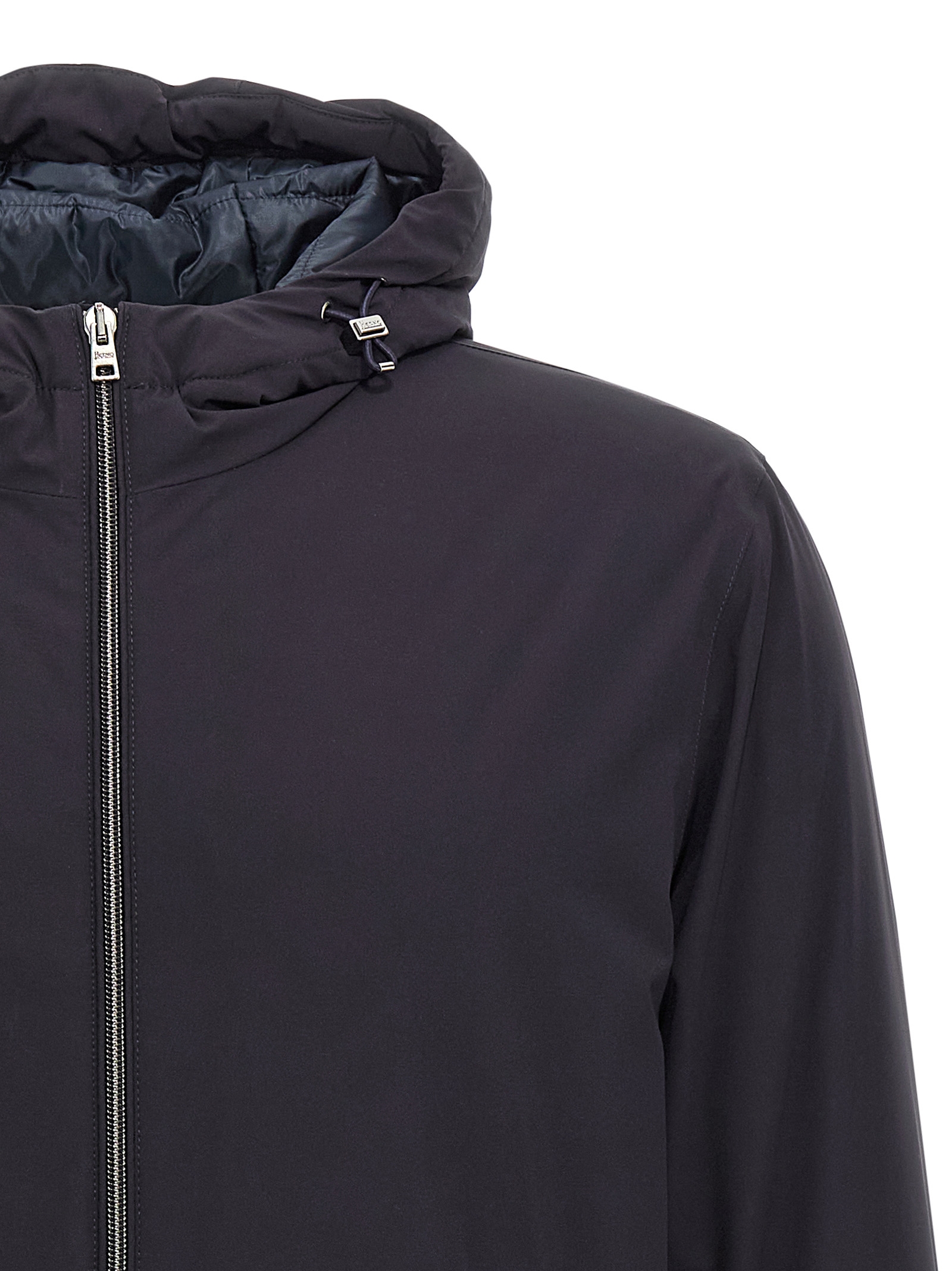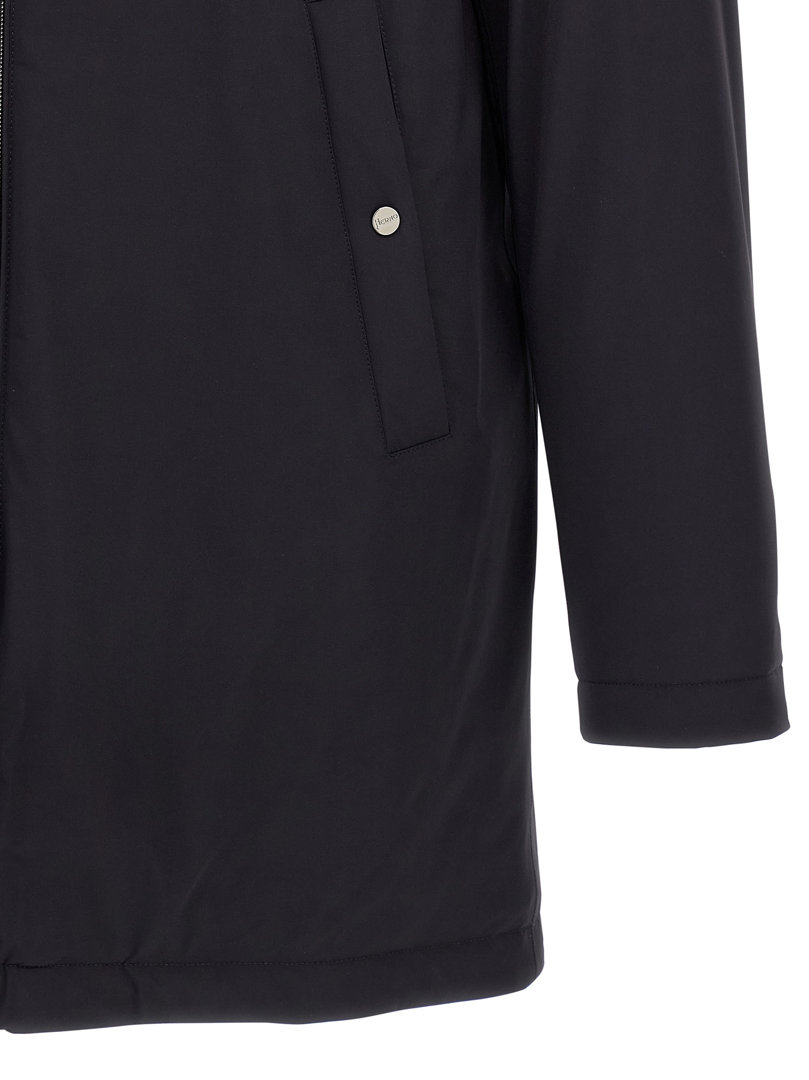 Water-repellent nylon microfiber long parka, quilted lining slightly padded with goose down, adjustable hood, front zip closure, pockets, long sleeves, foldable style.