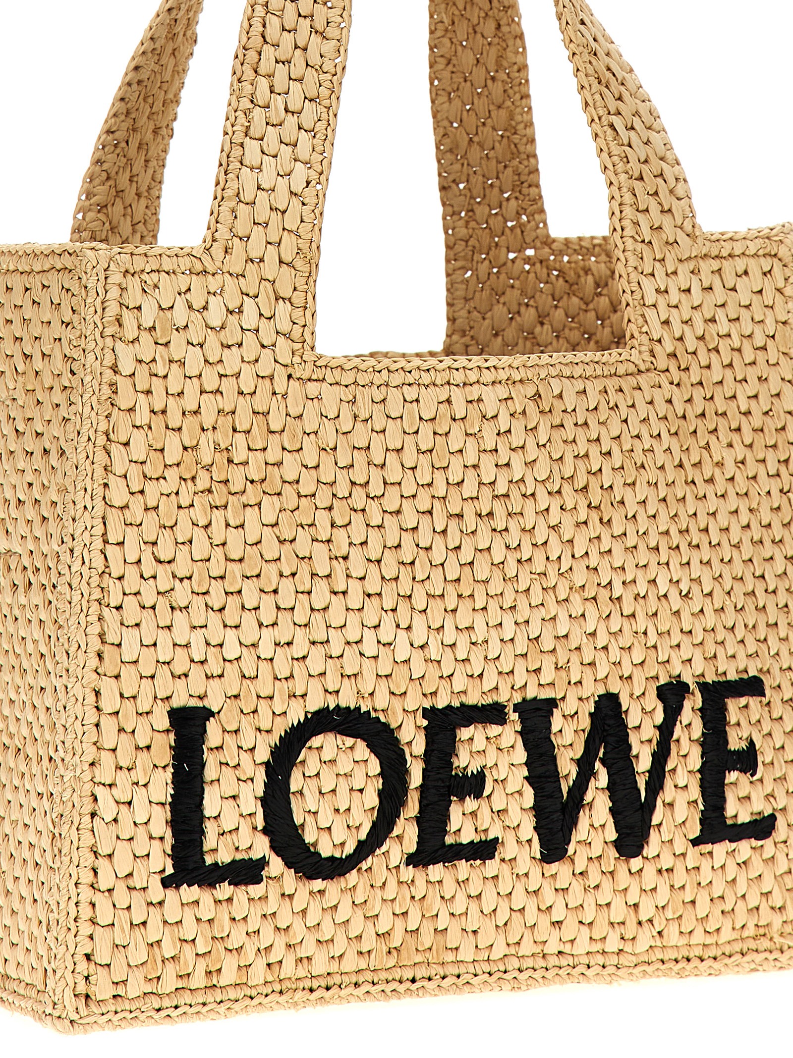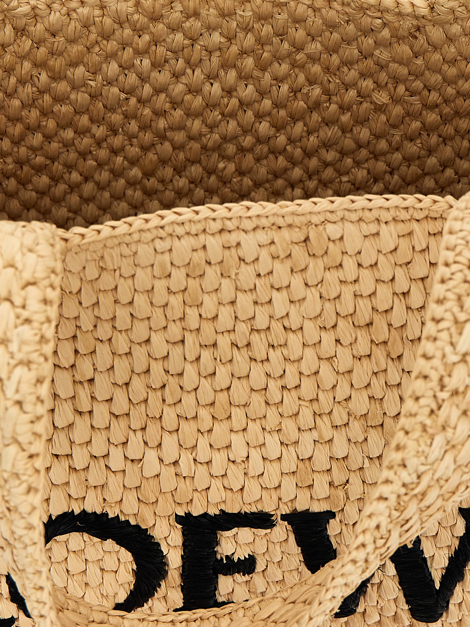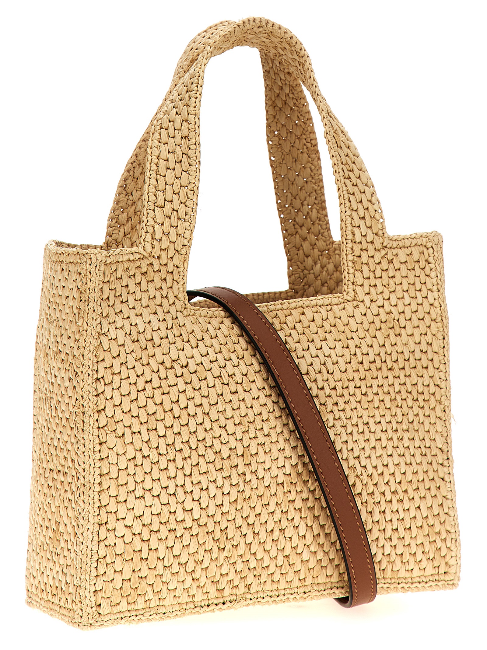 ‘Font Tote Mini’ raffia shopping bag with front logo embroidery, double handle, adjustable and removable leather shoulder strap.