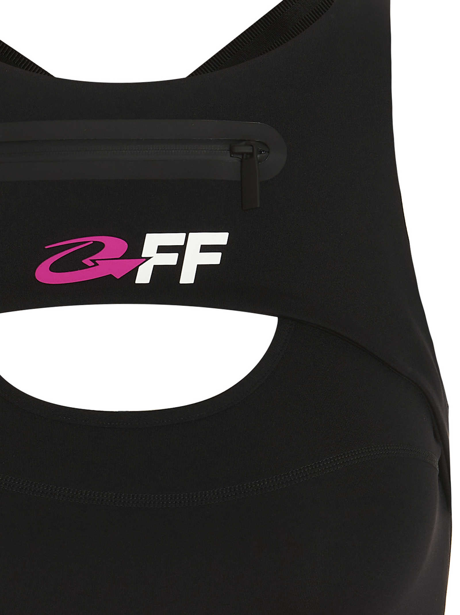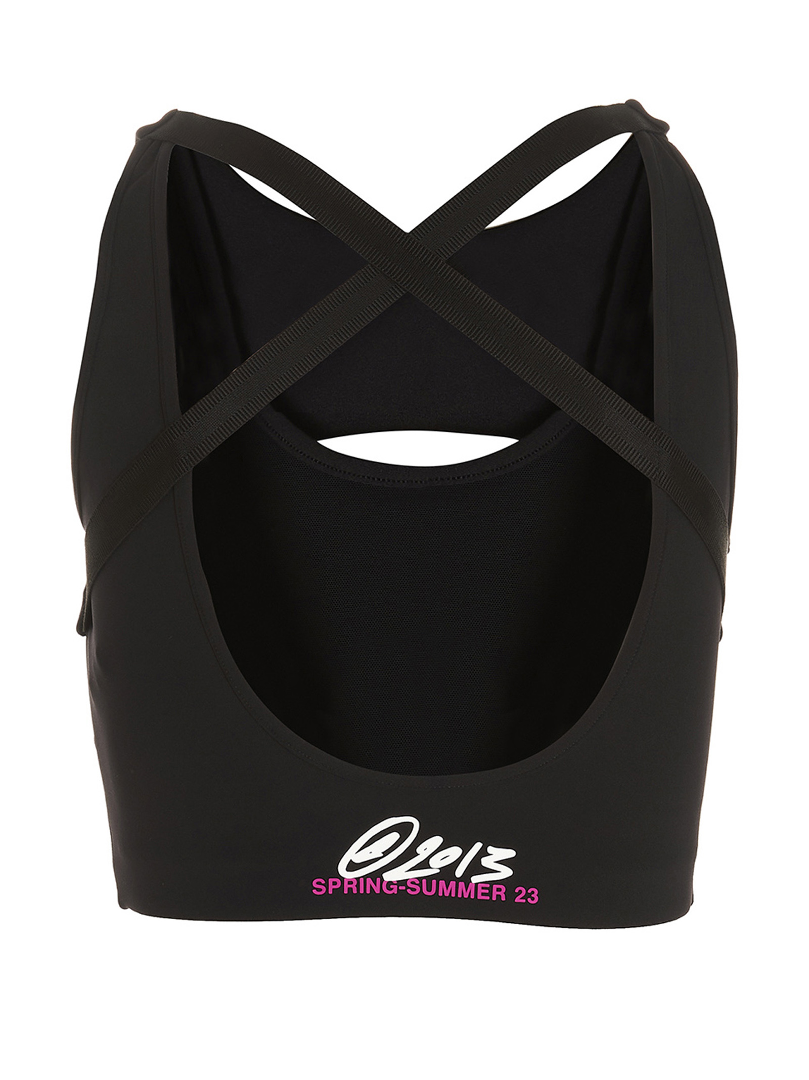 For run’ top in tech fabric with central cut out, crossed shoulder straps at the back, logo print and front zip detail.