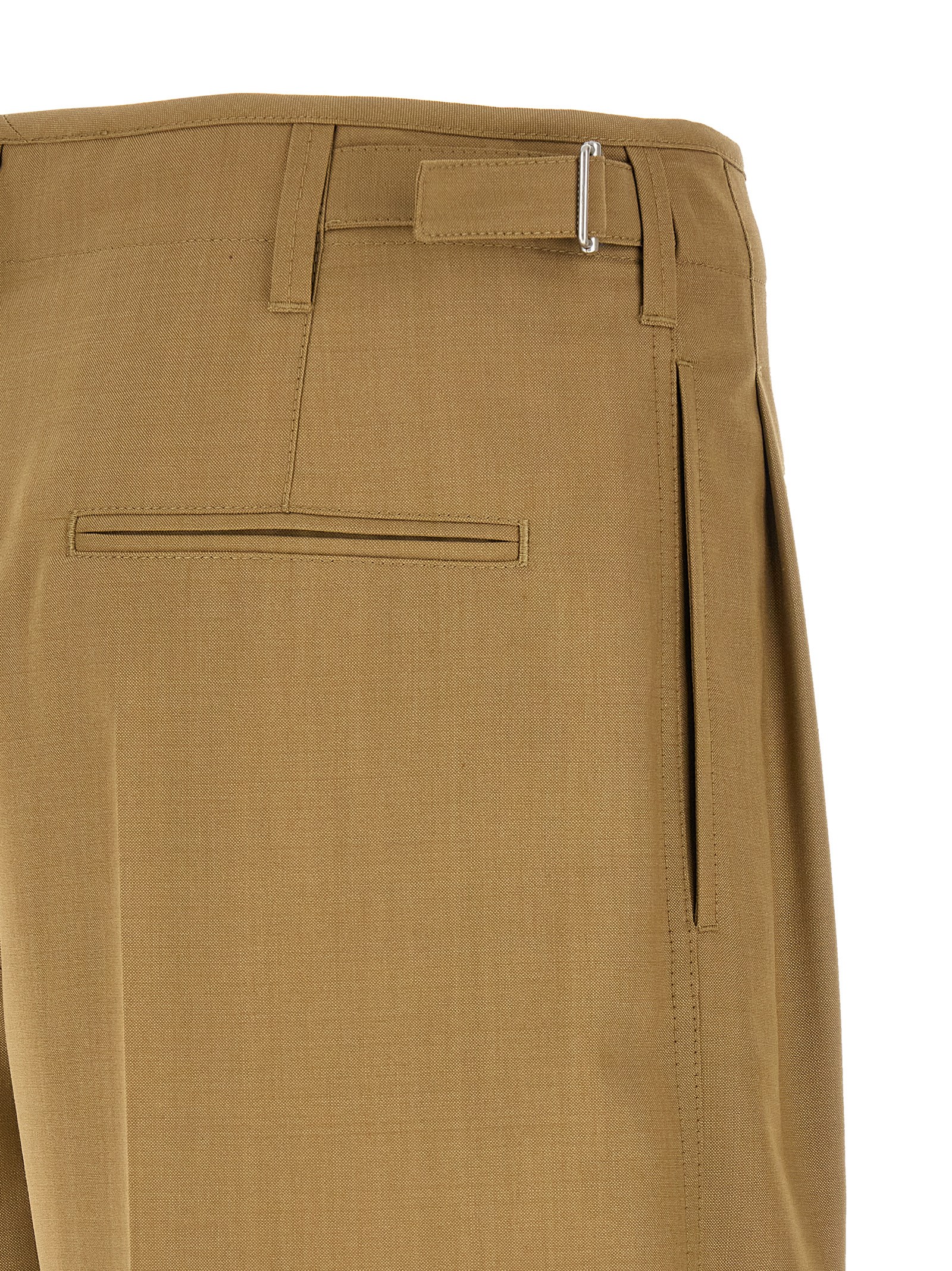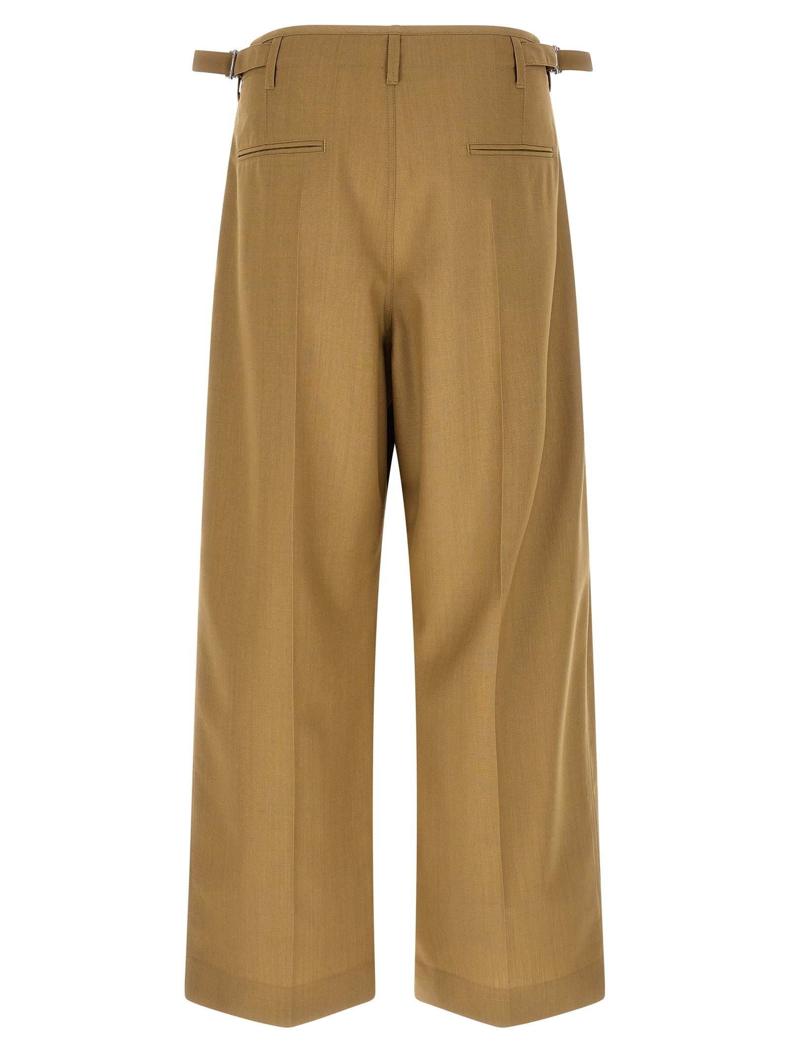 Formal wool blend trousers, double-layer belt waistband, adjustable side straps with buckle, front zip and hook closure, wide straight leg with pleats and front stretched pleat, side and back welt pockets