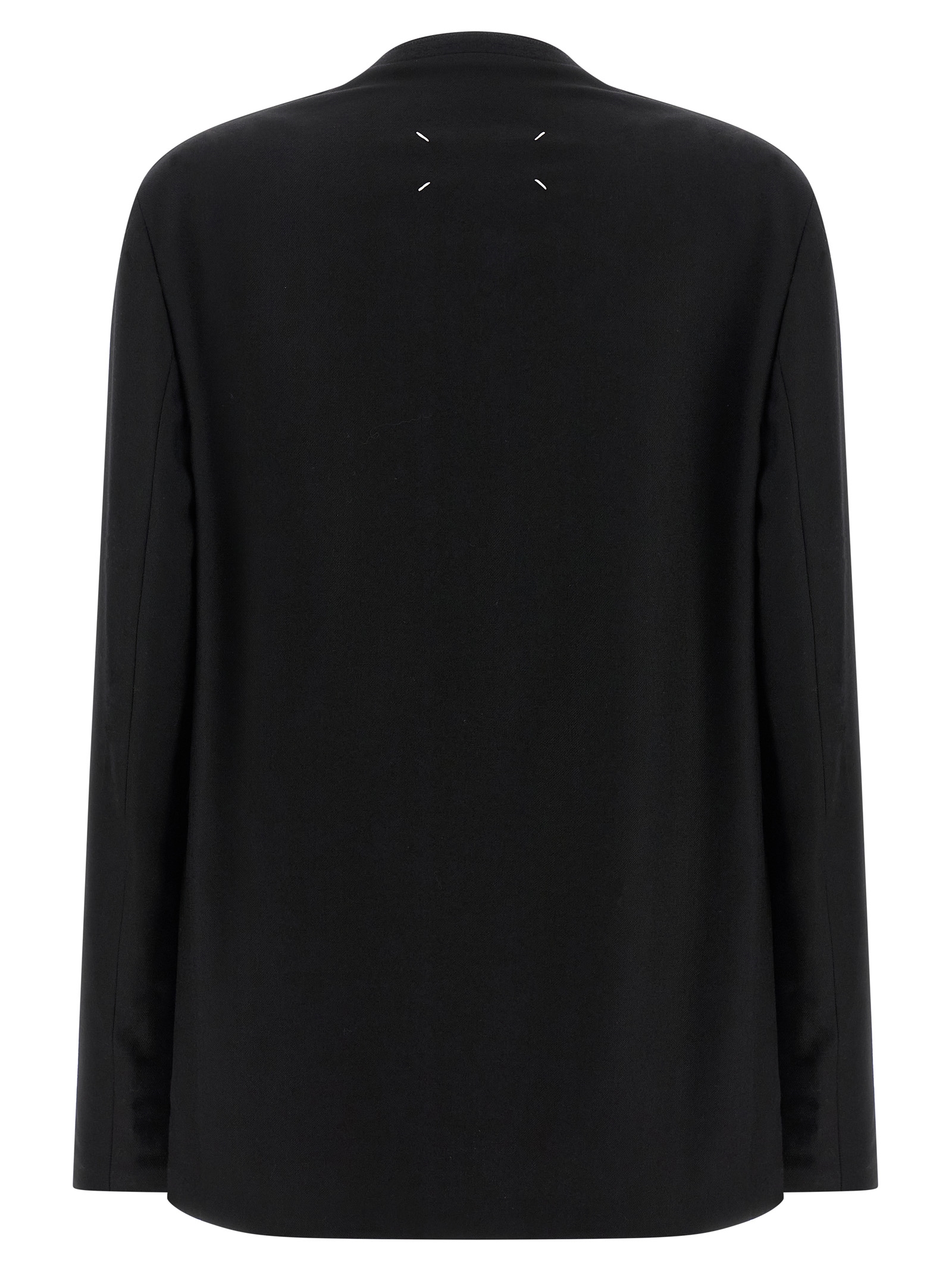Virgin wool blazer jacket, unlined, unstructured dressing gown, inside pockets, long sleeves with slightly dropped shoulder, ‘Four Stitches’ at the back.