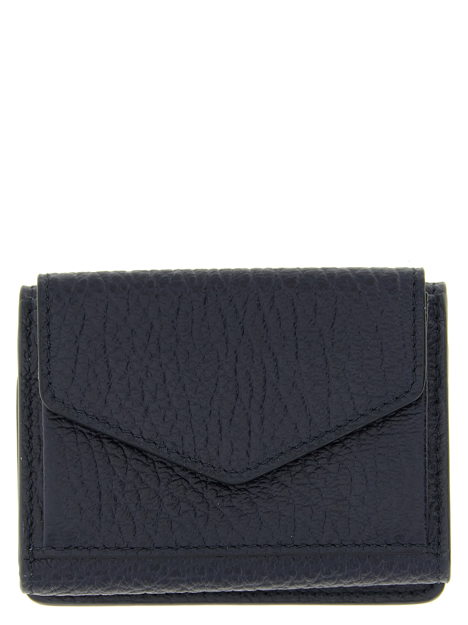 Compact grainy leather wallet, flap closure with snap button, front pocket with button, ‘Four stitches’ on the back.