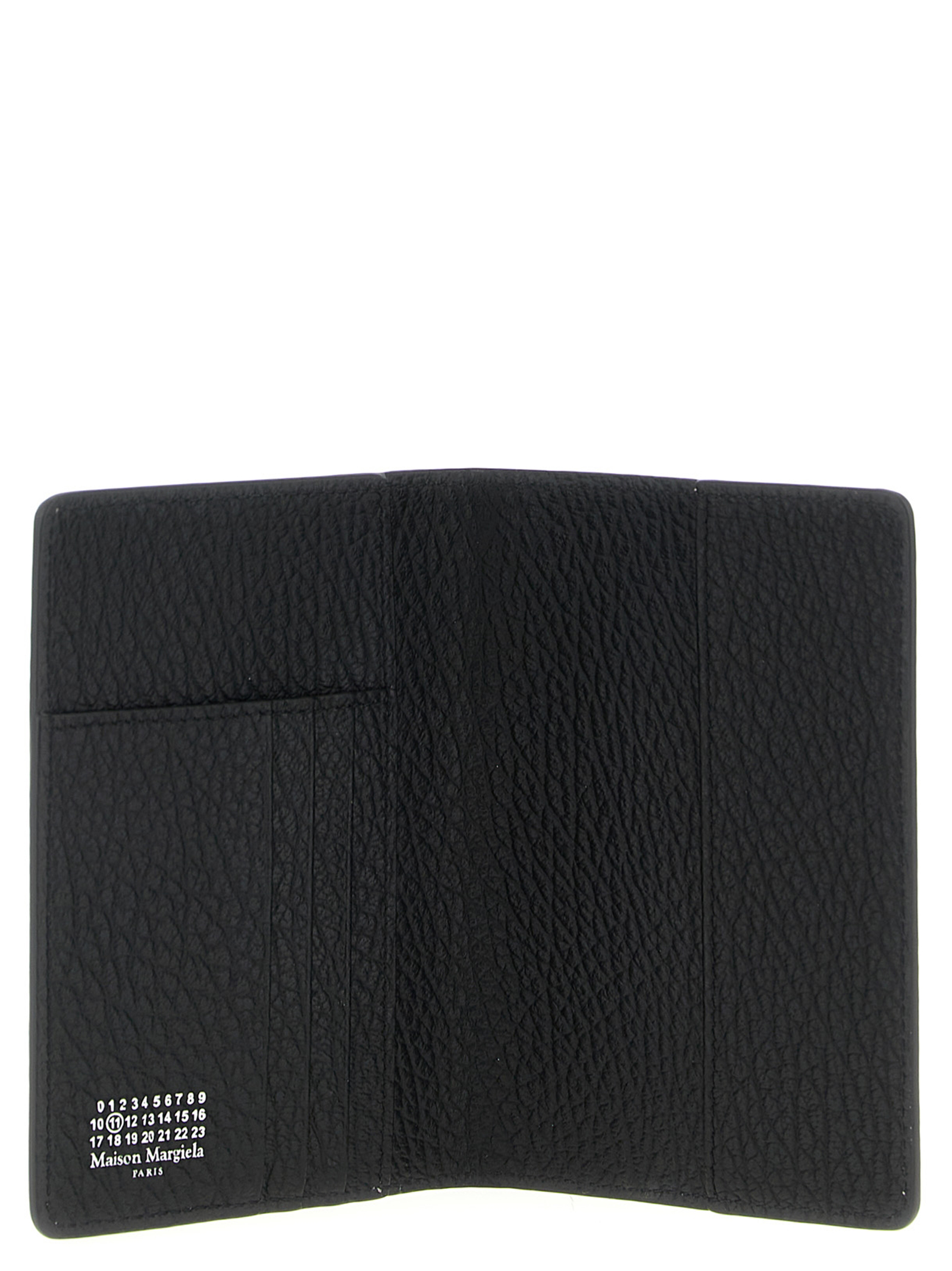 Passport holder in grainy leather, front ‘Four Stitches’ and folding opening.