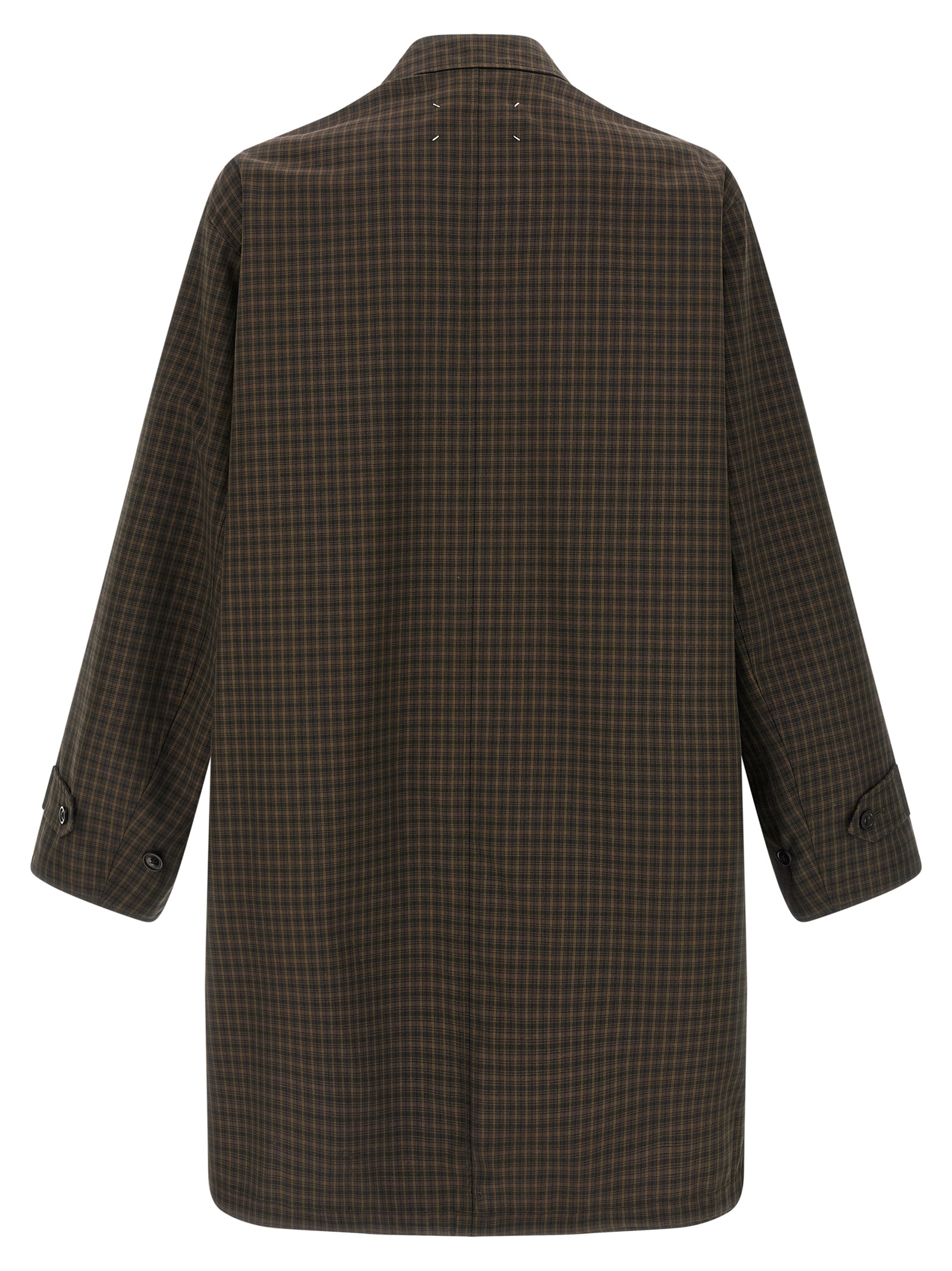 Reversible trench coat in iridescent taffeta solid color and check pattern, shirt collar, front button closure, pockets, long sleeves with adjustable cuffs and dropped shoulder, ‘Four Stitches’ at the back.