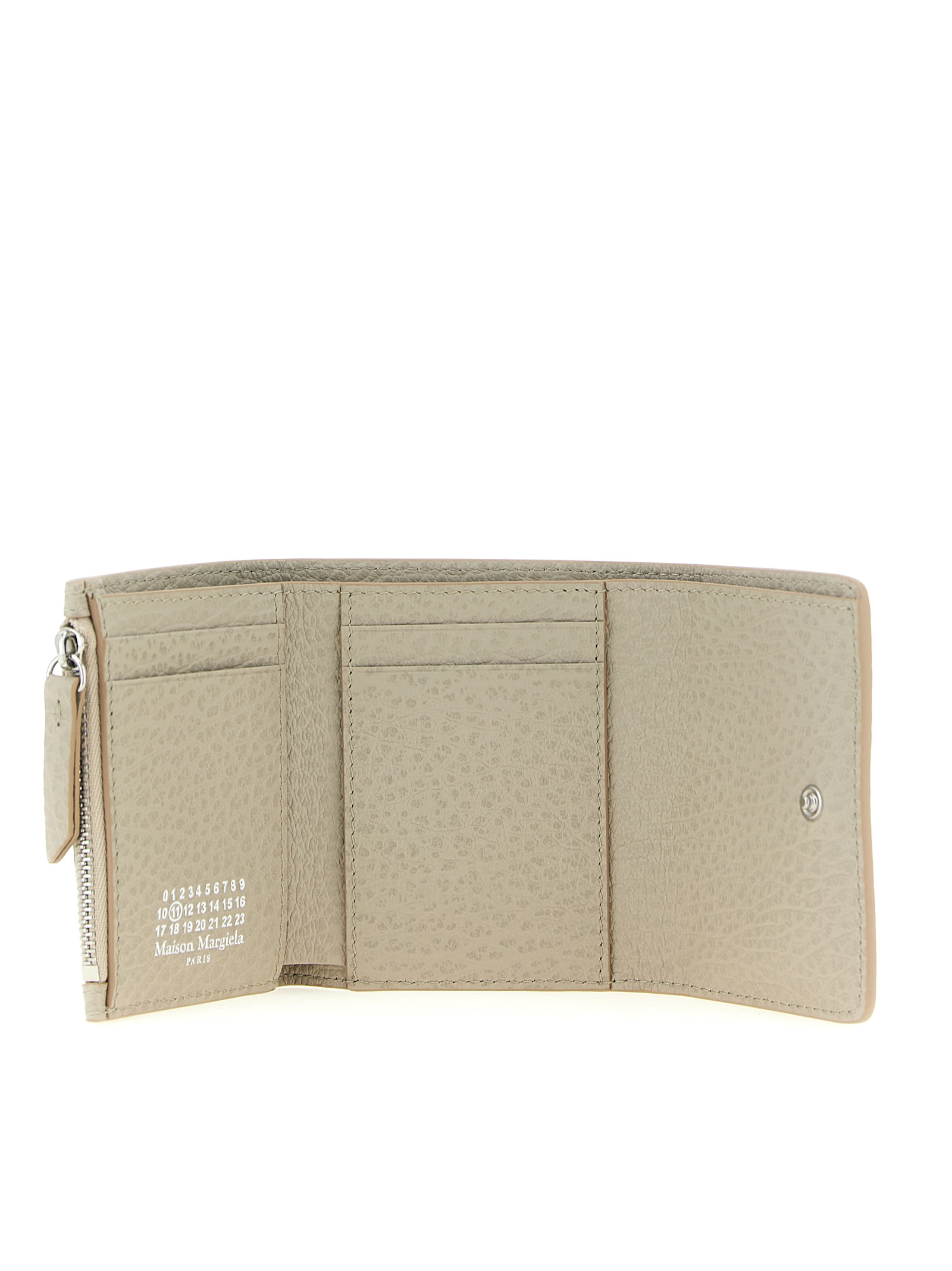 Embossed grain leather wallet, flap closure with snap button, front ‘Four Stitches’ detail, and back pocket.