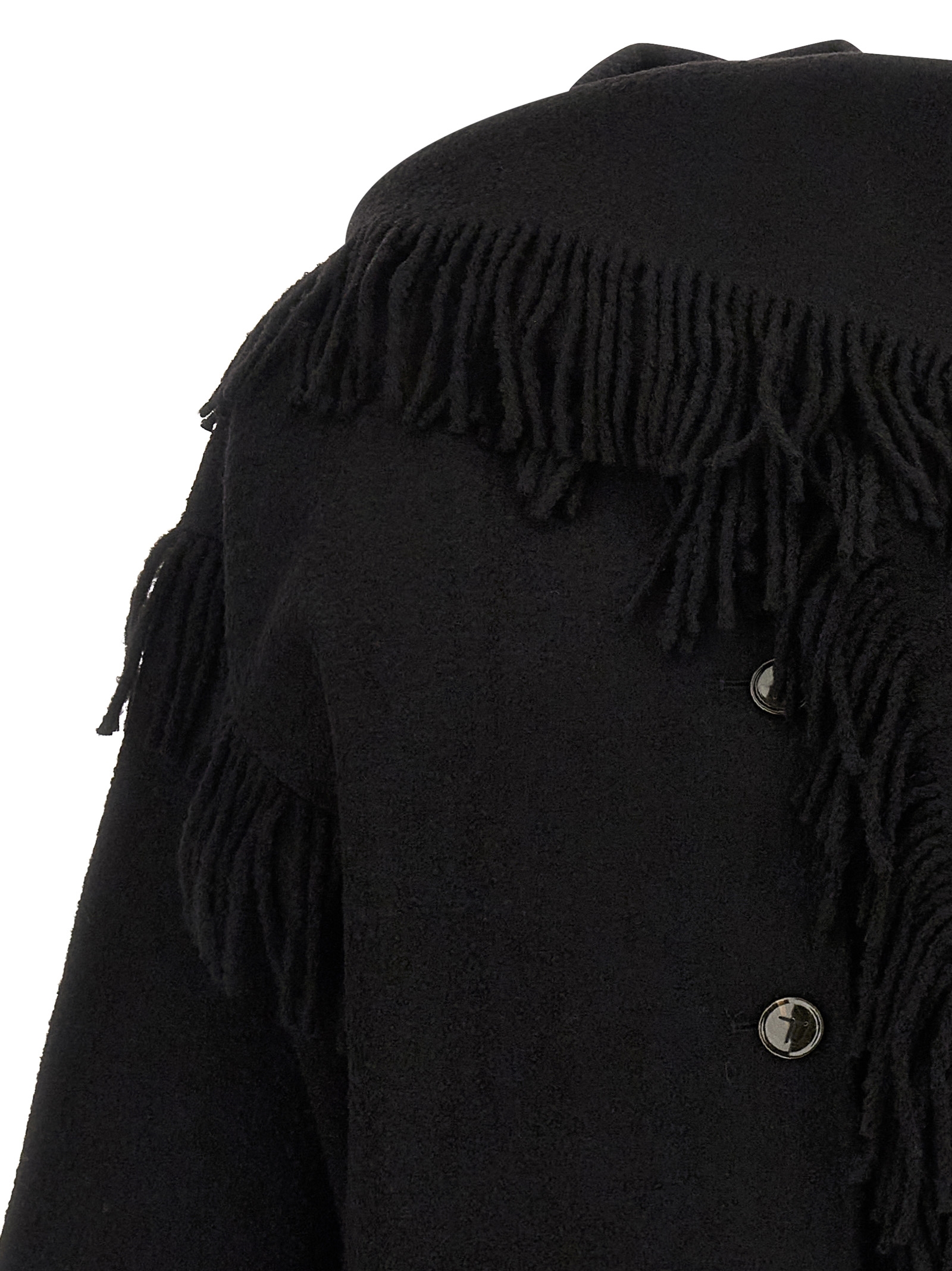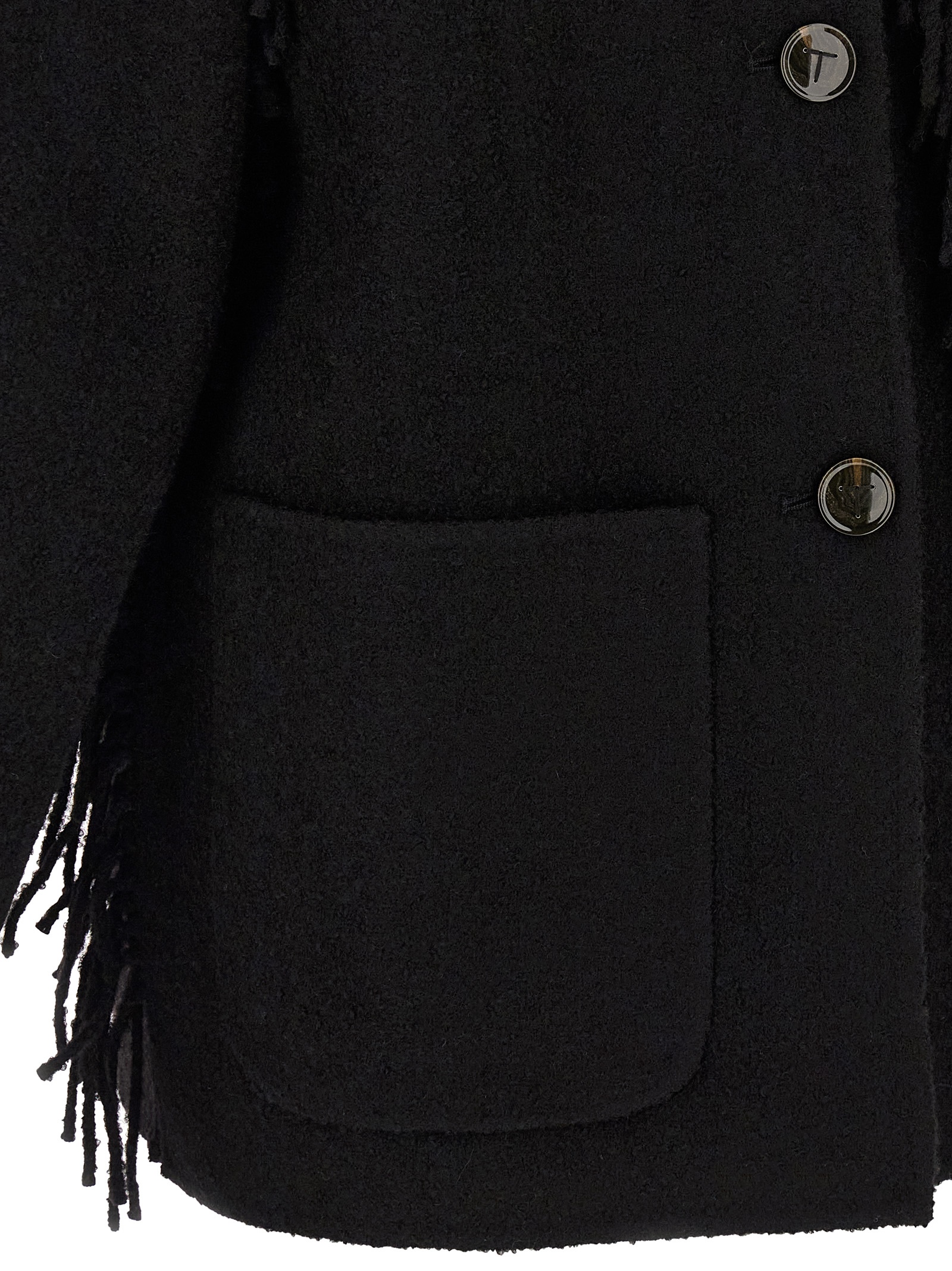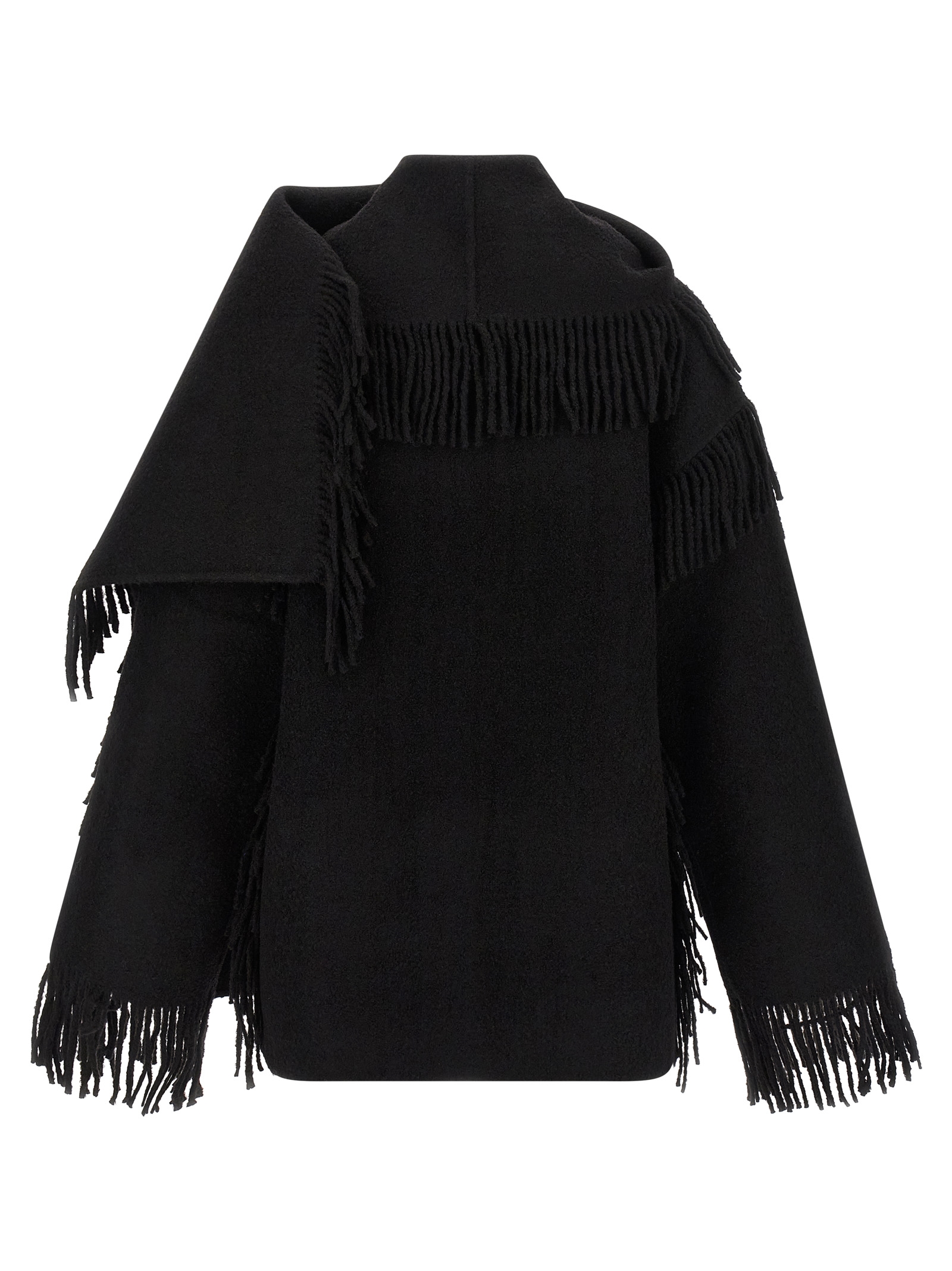 ‘Fringed Scarf’ wool blend bouclé jacket with fringes, crew neck with built-in scarf, front button closure, pockets, long sleeves with dropped shoulders, unlined.