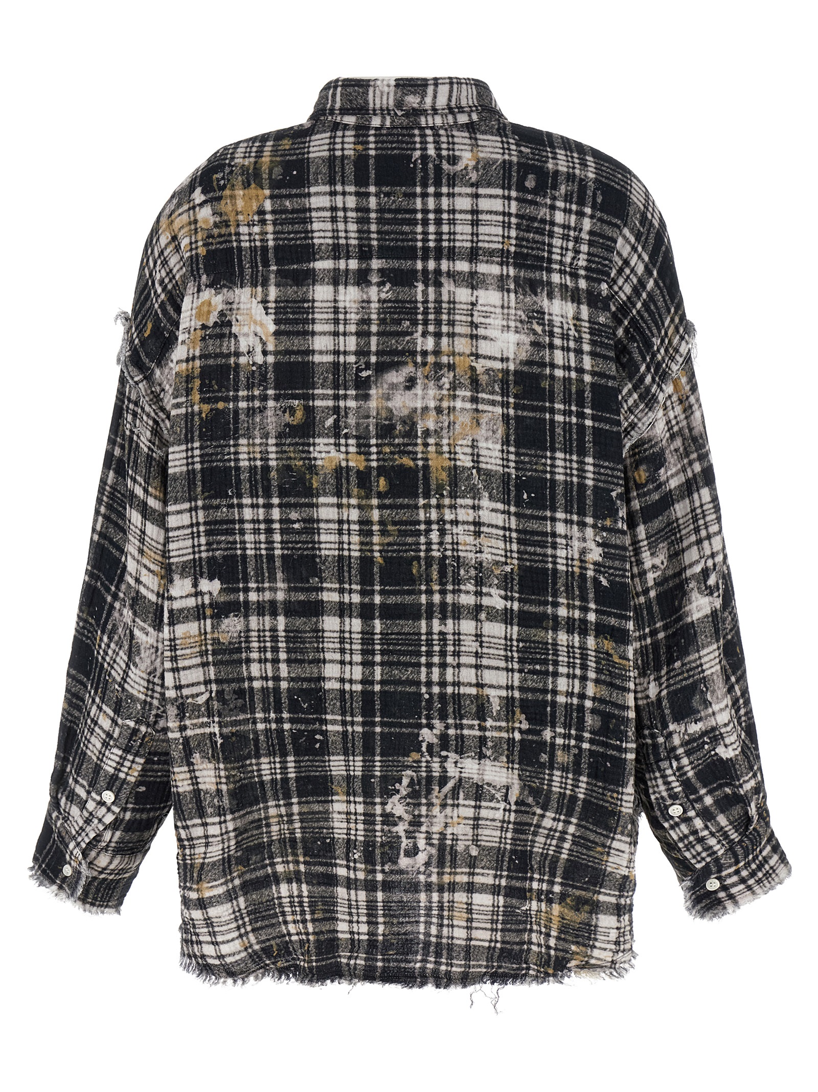 Heavy printed cotton shirt, front button closure, breast pocket, long sleeves with cuffs and dropped shoulder, frayed hem, asymmetrical hem.
