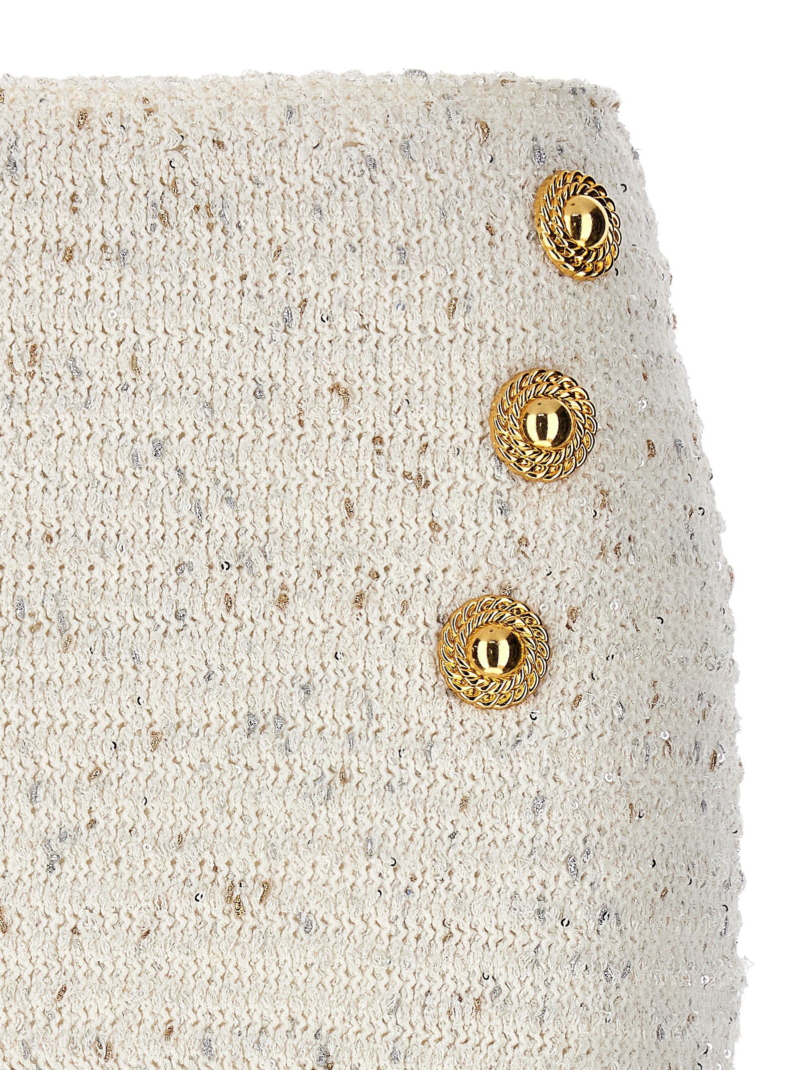 ‘Fringed Tweed’ tweed skirt with sequins and fringes on the hem, front logo buttons, back zip closure.