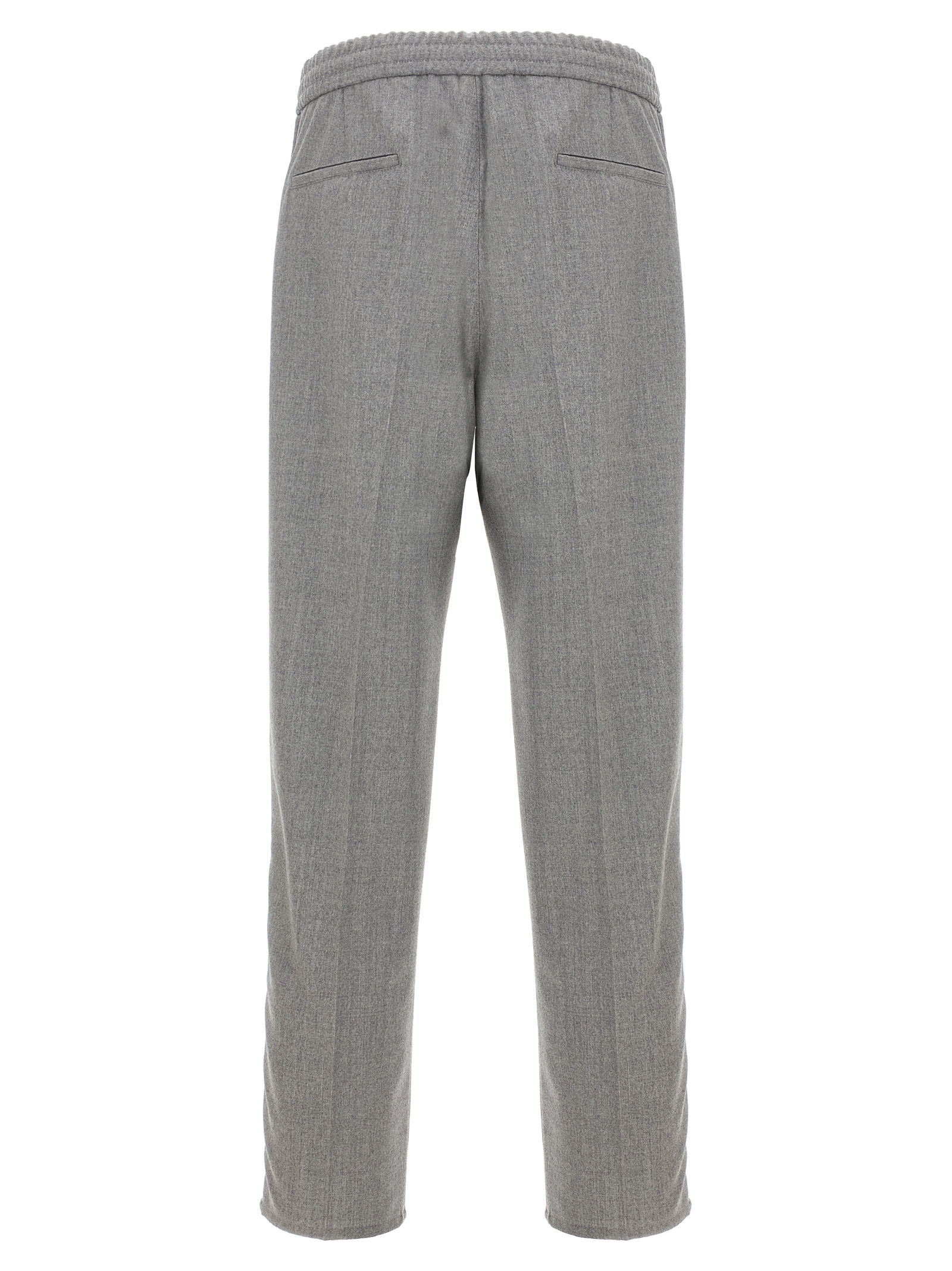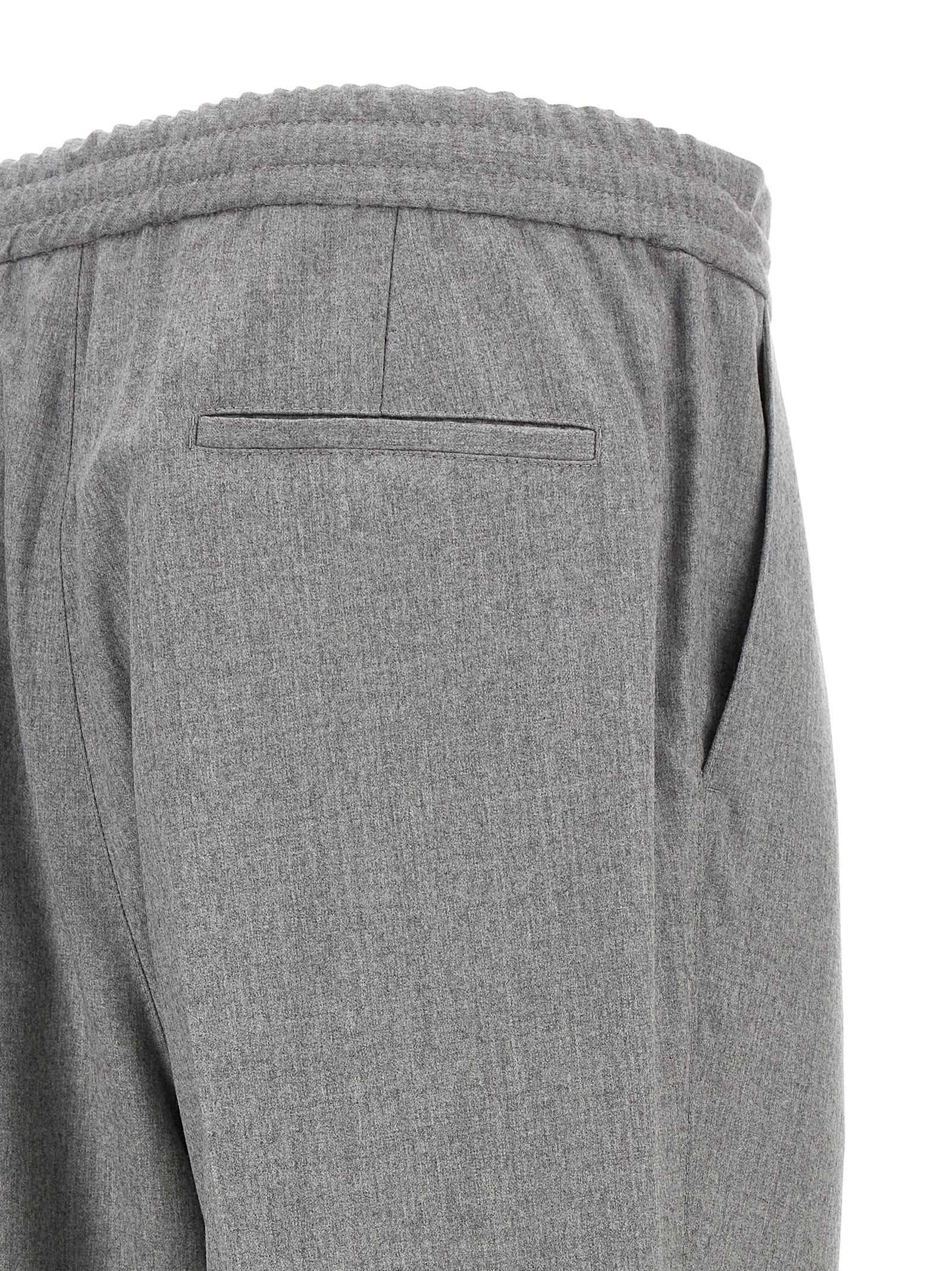 Wool pants with pin and pleat, zip, hook and button closure, elastic and drawstring waistband, pockets.