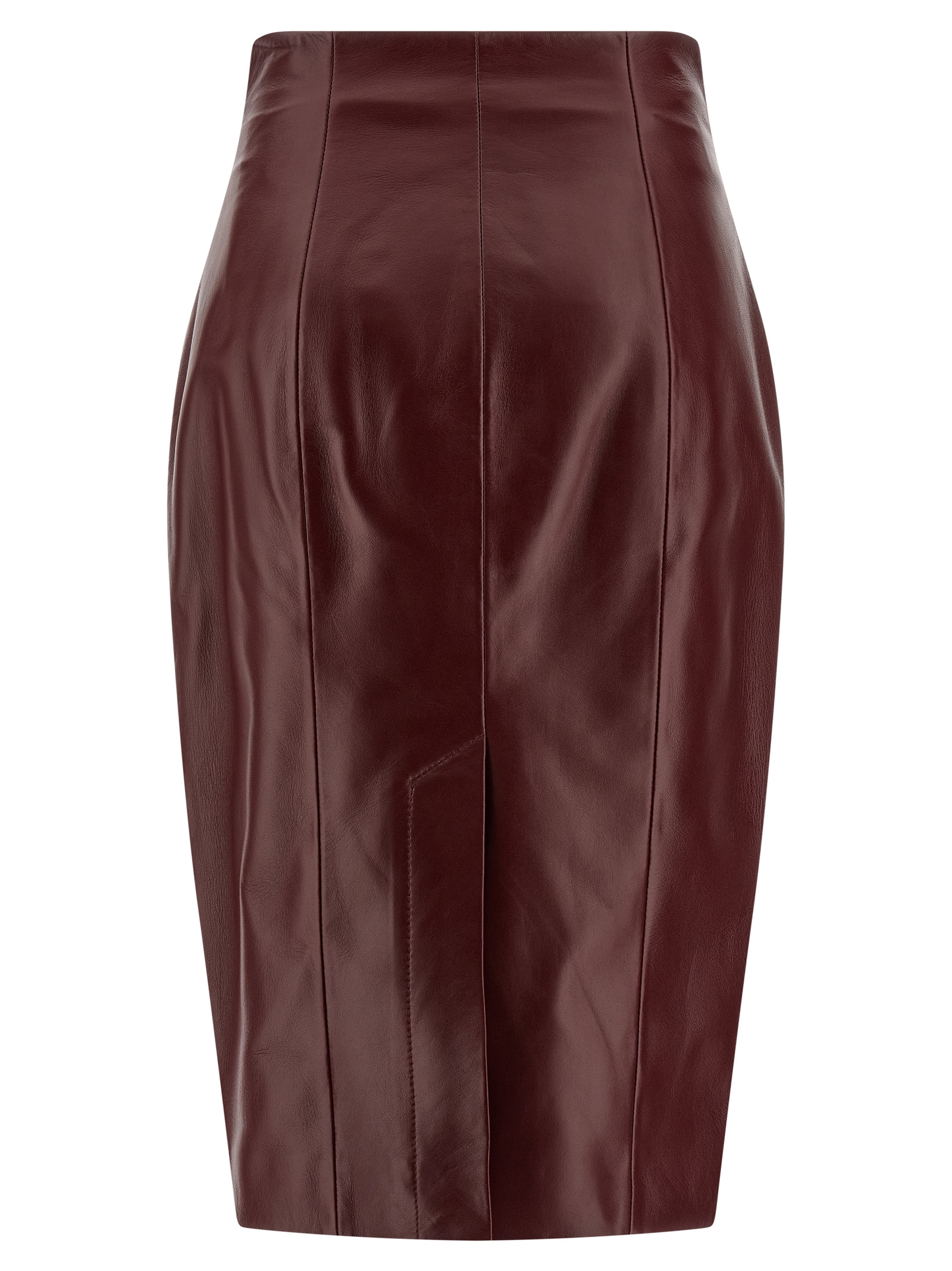 Lamb leather midi skirt, pencil design, high waist, front zip closure, back split, lining.