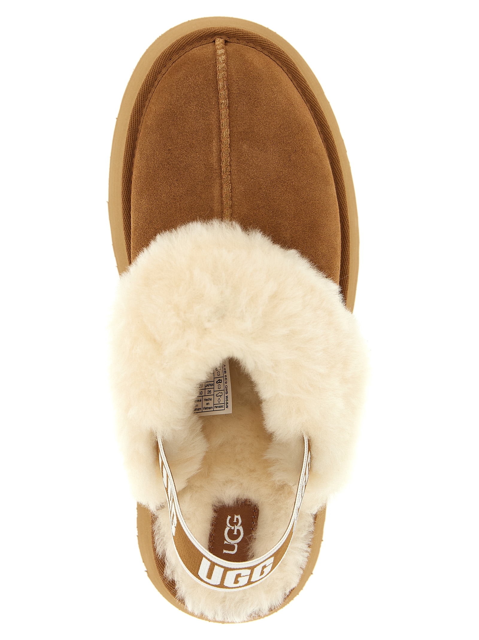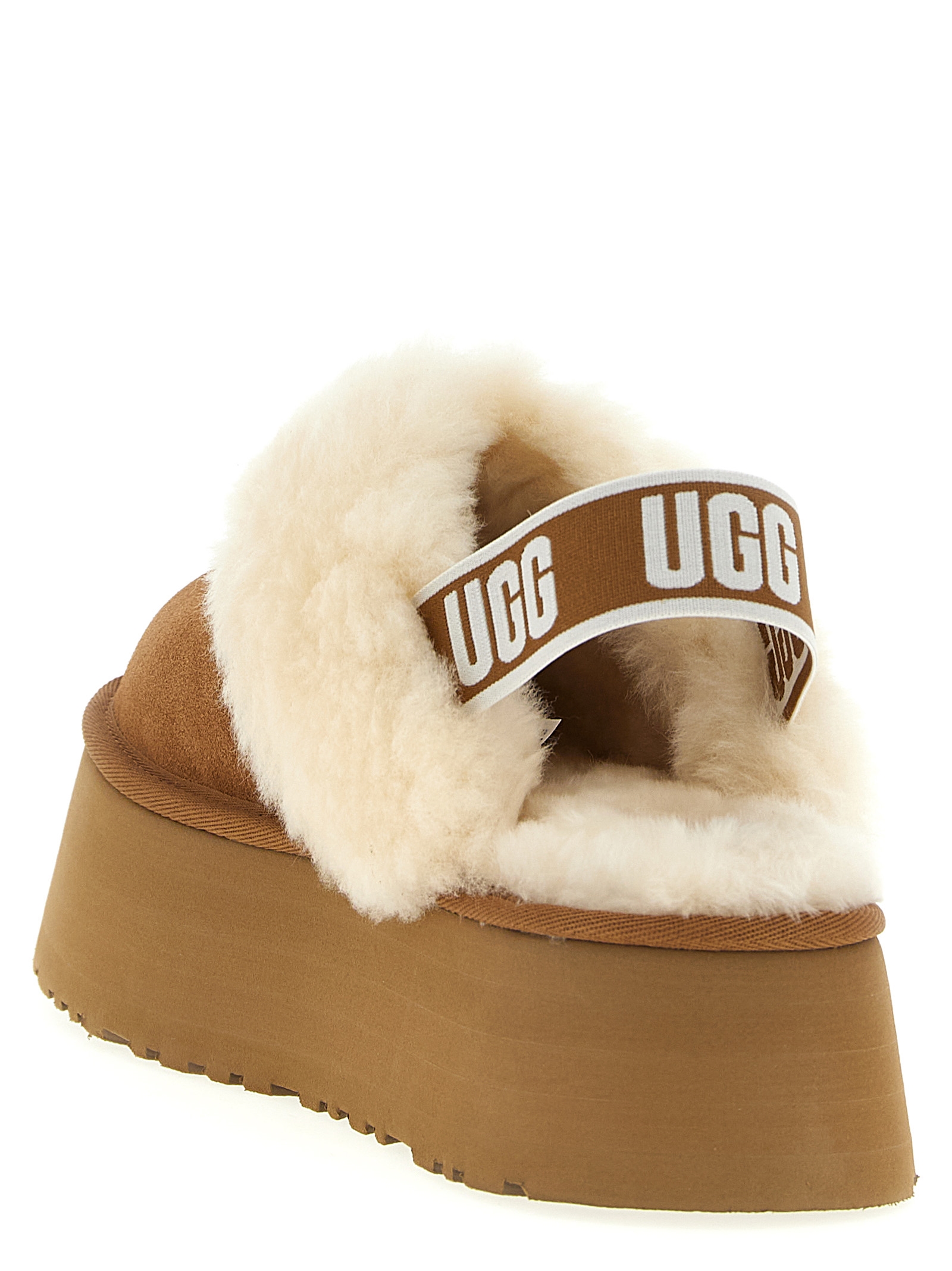 Suede Funkette sabots, sheepskin collar and insole, UGGplush™ lining, back logo elastic strap, EVA midsole, SugarSole™ or Treadlite by UGG™ platform sole.