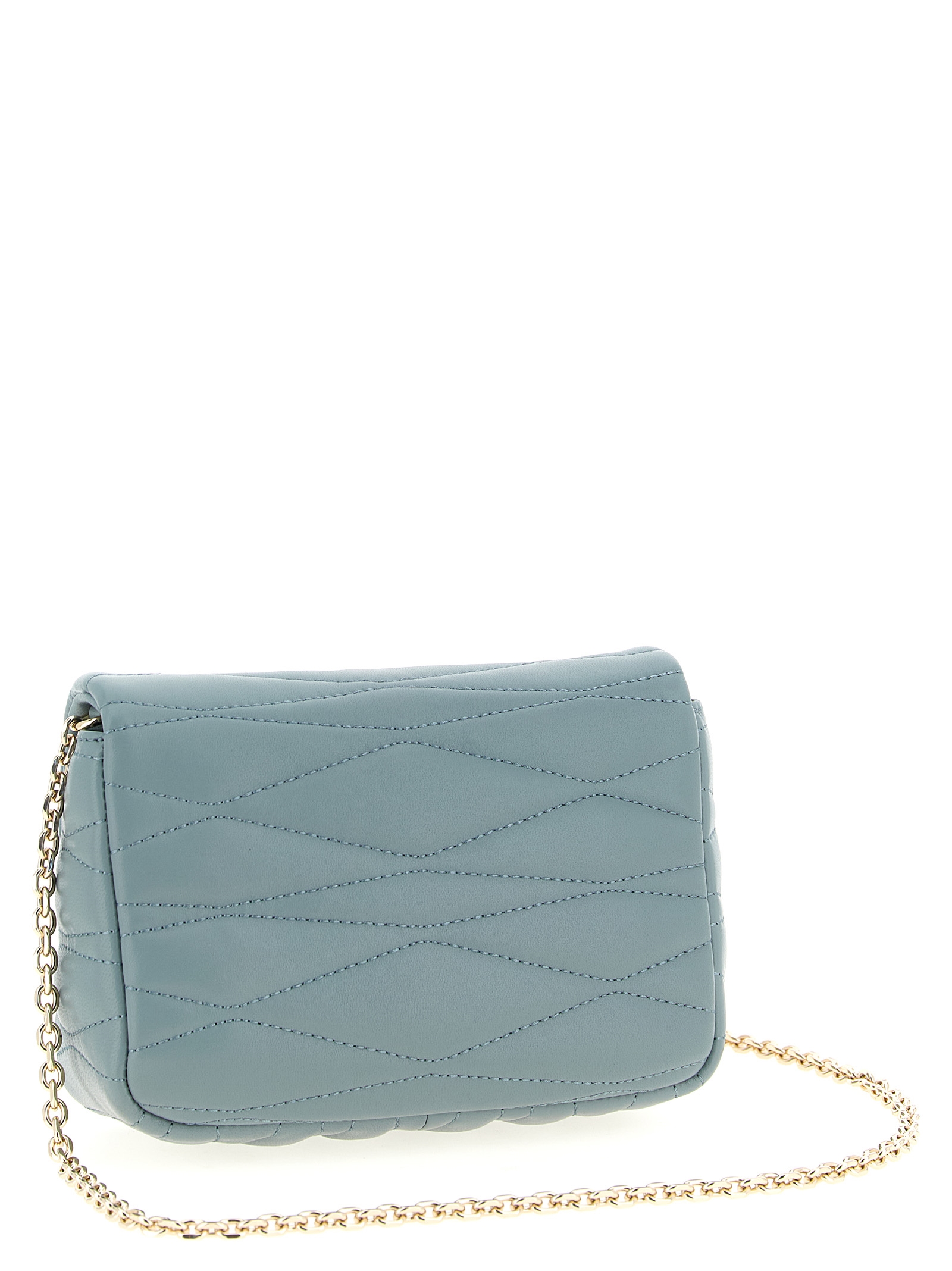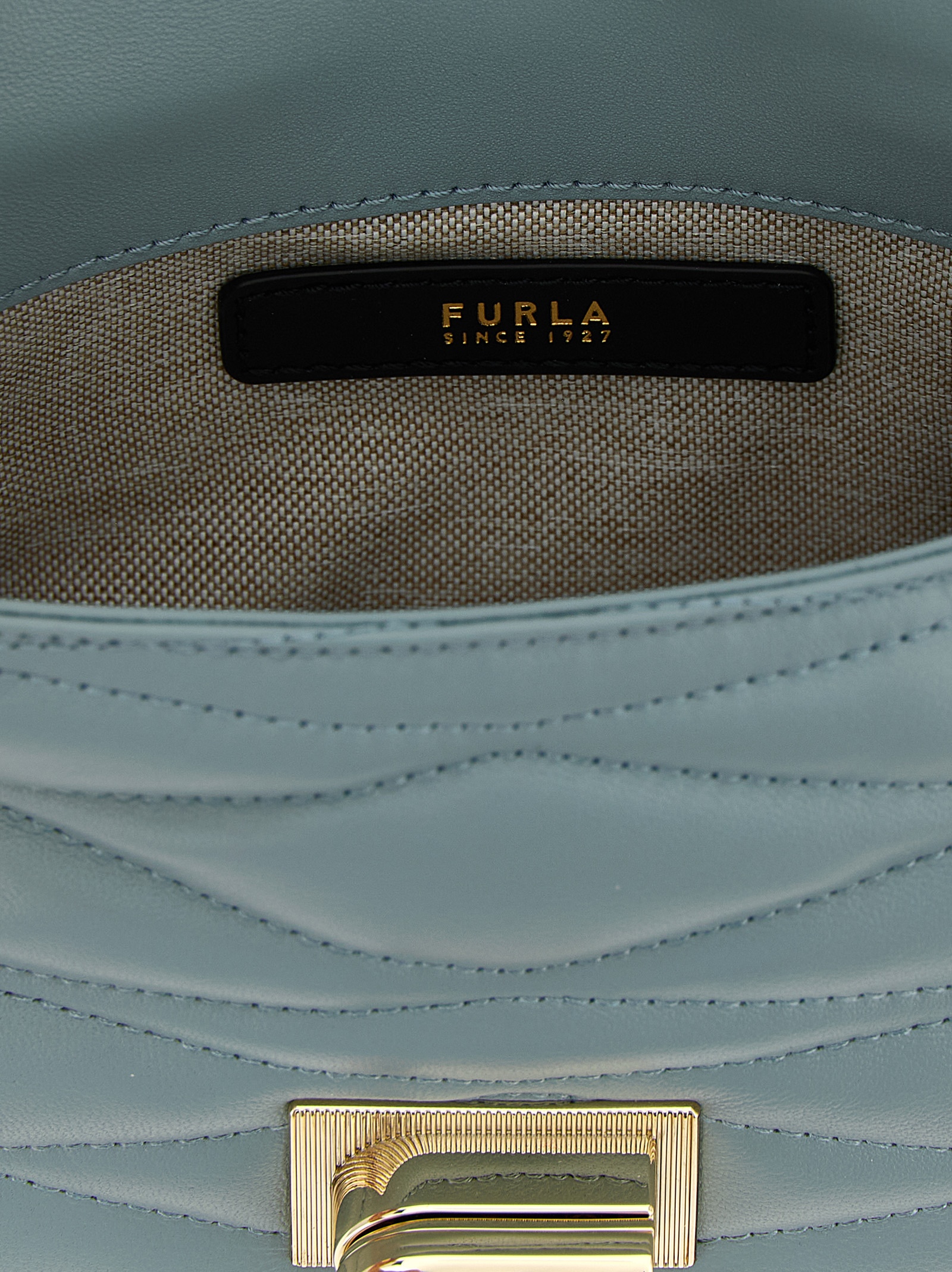 Furla 1927′ mini crossbody bag in quilted nappa leather with woven pattern, flap closure with metal spin with Arco logo, sliding chain shoulder strap with leather protection.