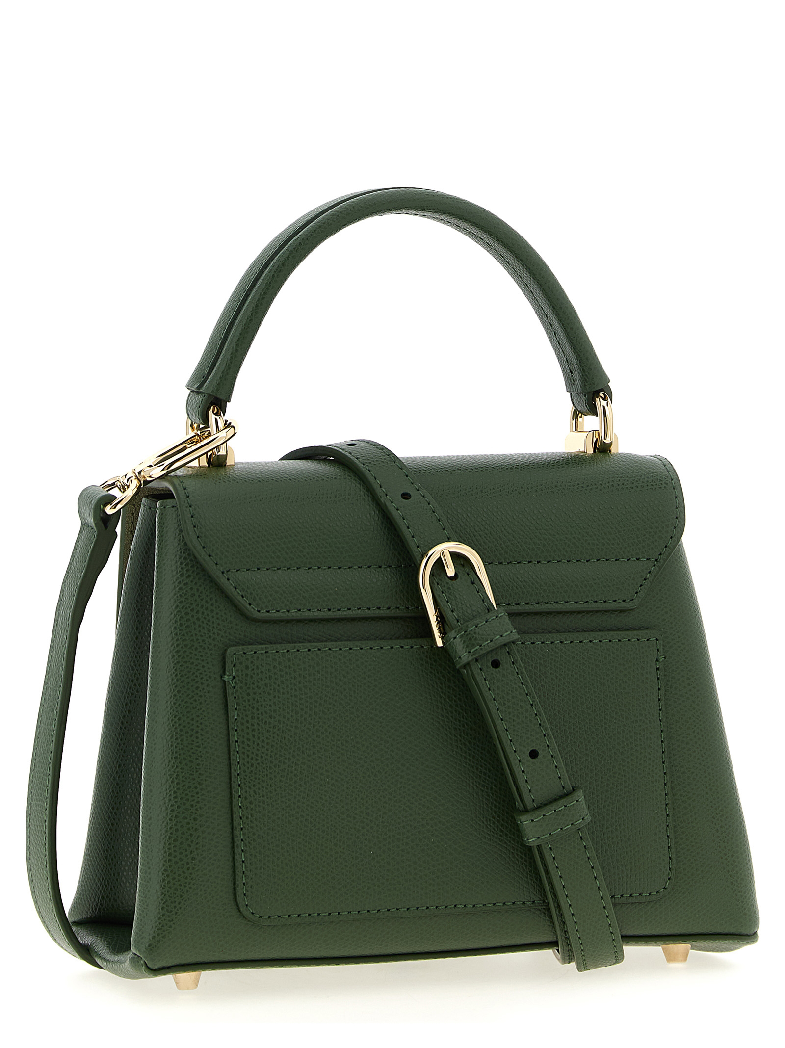 ‘Furla 1927’ mini leather handbag with a light garnet texture, interior gusset construction, flap closure with metal spin with Arco logo, fixed handle, back pocket, metal details, removable chain shoulder strap.