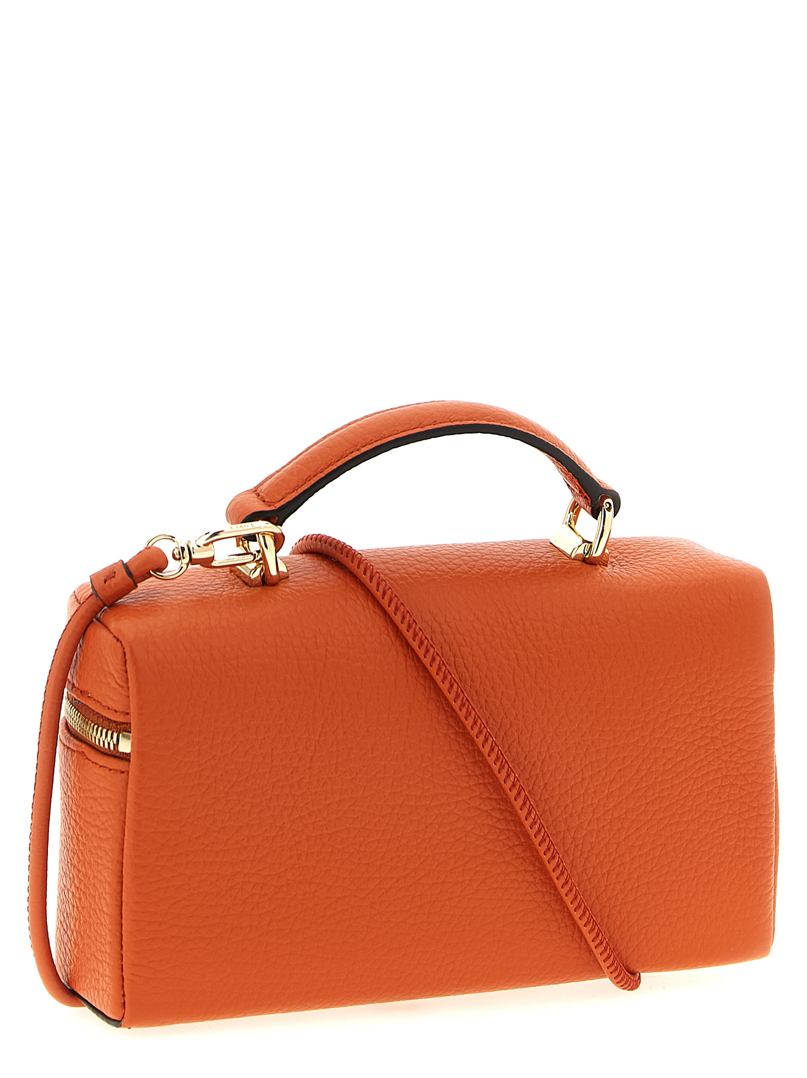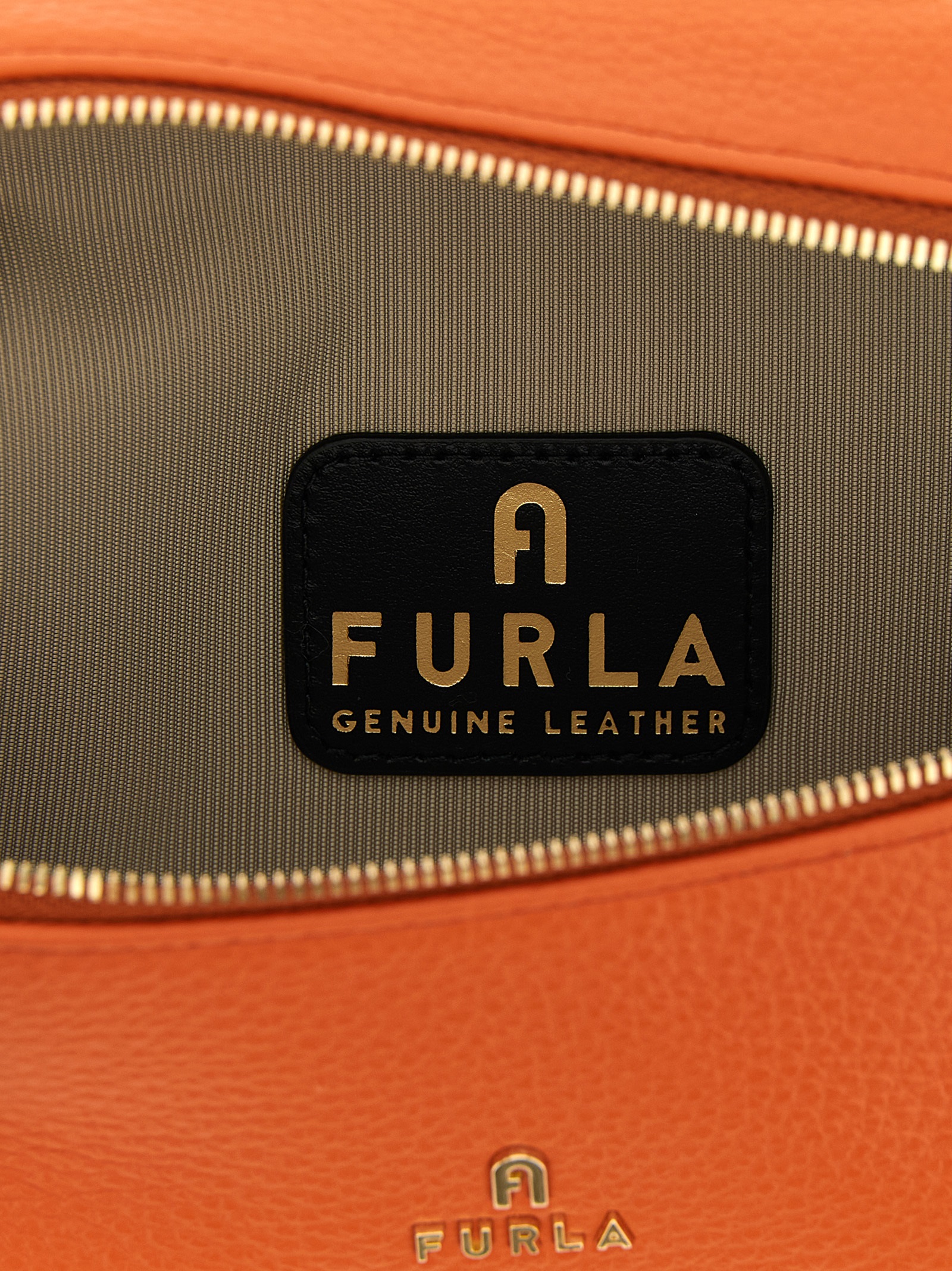 ‘Furla Camelia’ mini handbag in garnet leather with front metal lettering logo, zip closure, fixed handle, adjustable and removable shoulder strap.