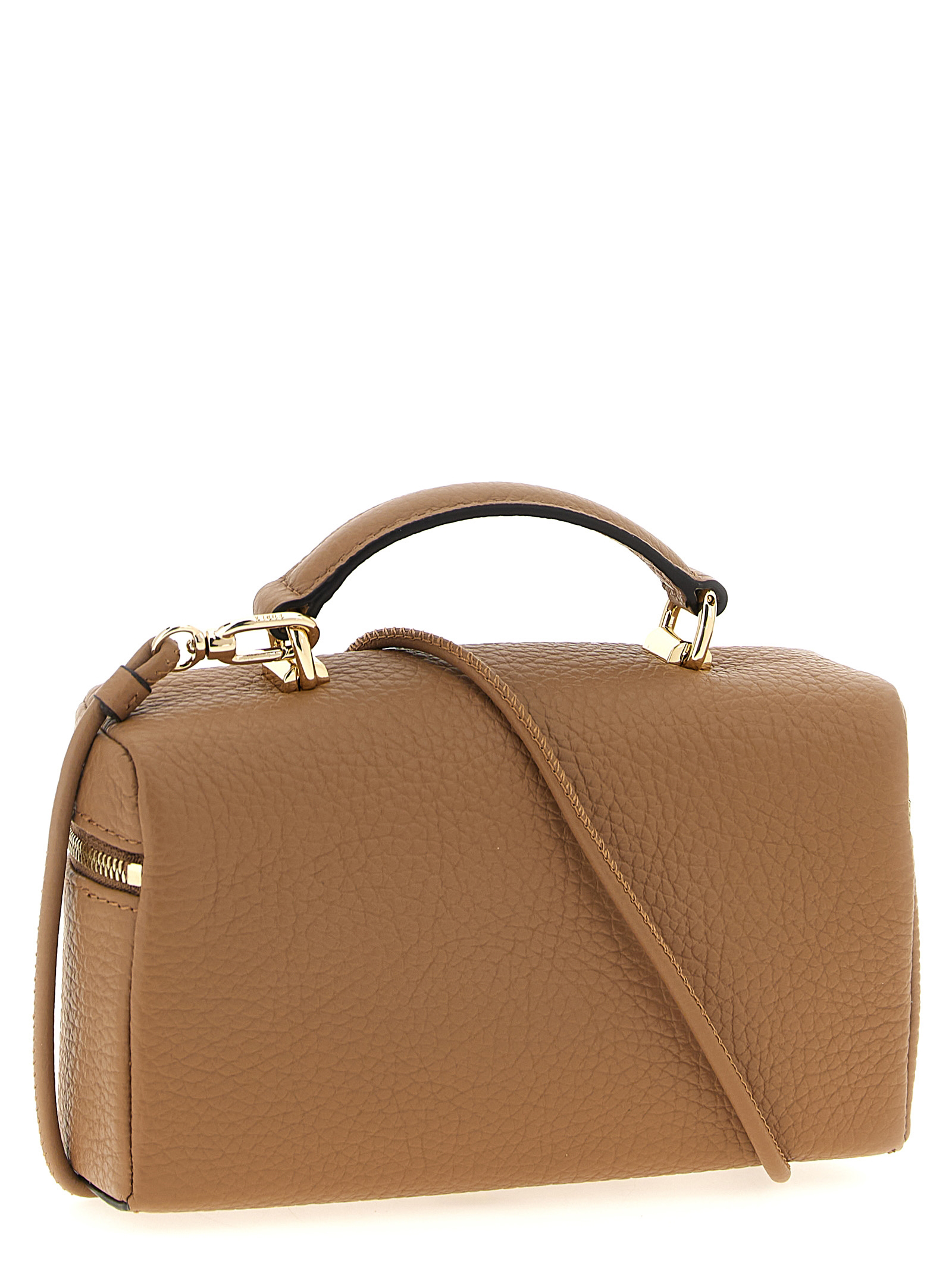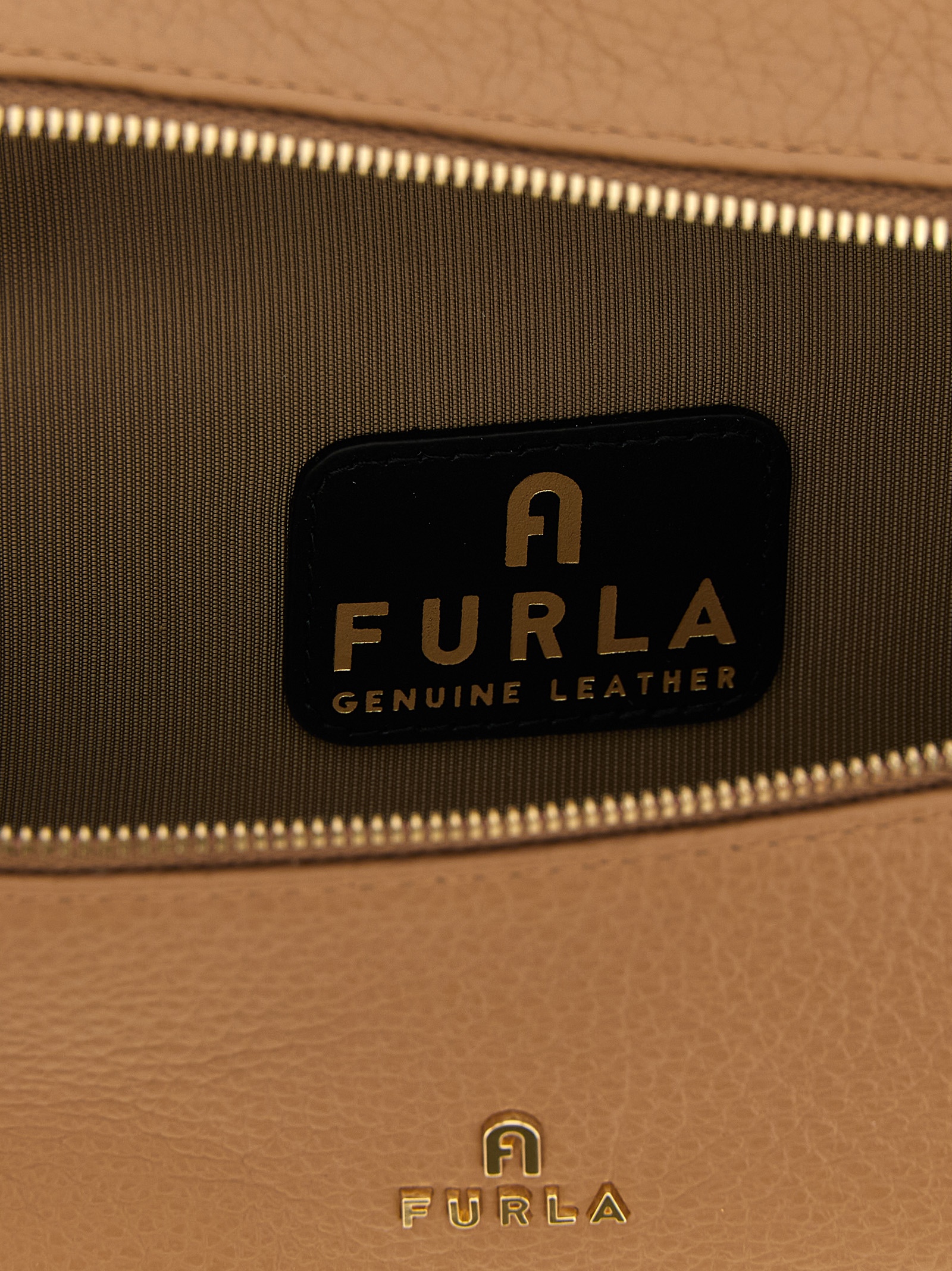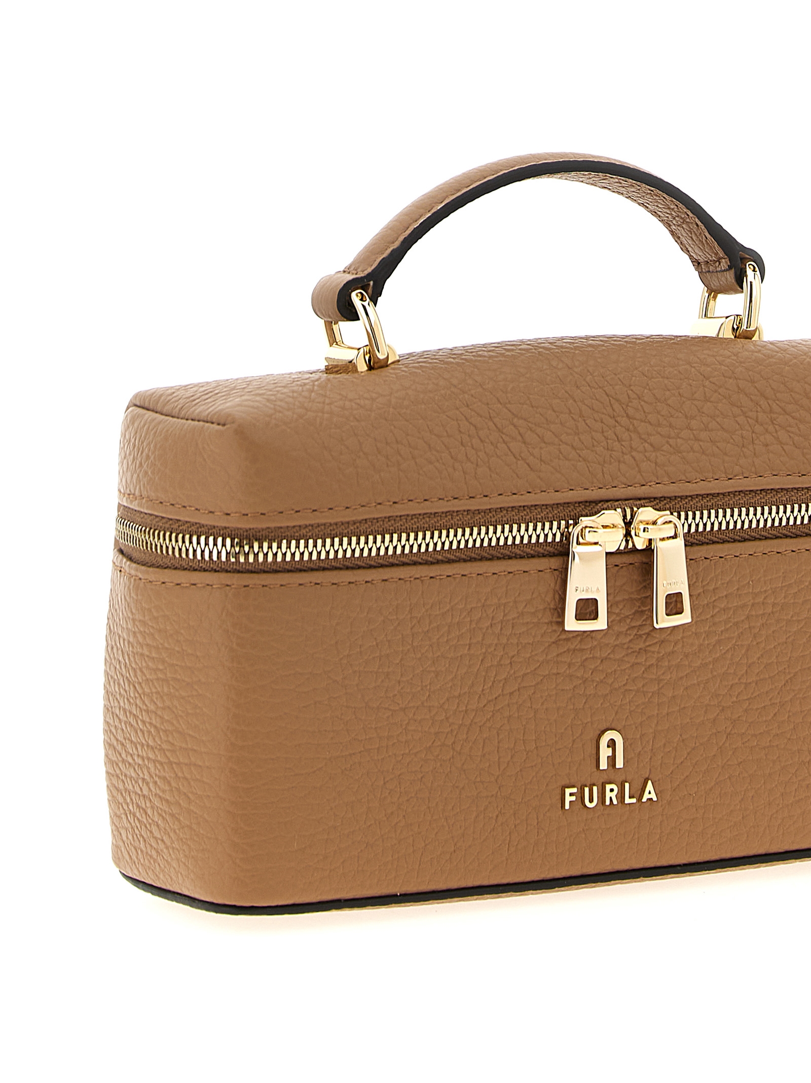 ‘Furla Camelia’ mini handbag in garnet leather with front metal lettering logo, zip closure, fixed handle, adjustable and removable shoulder strap.