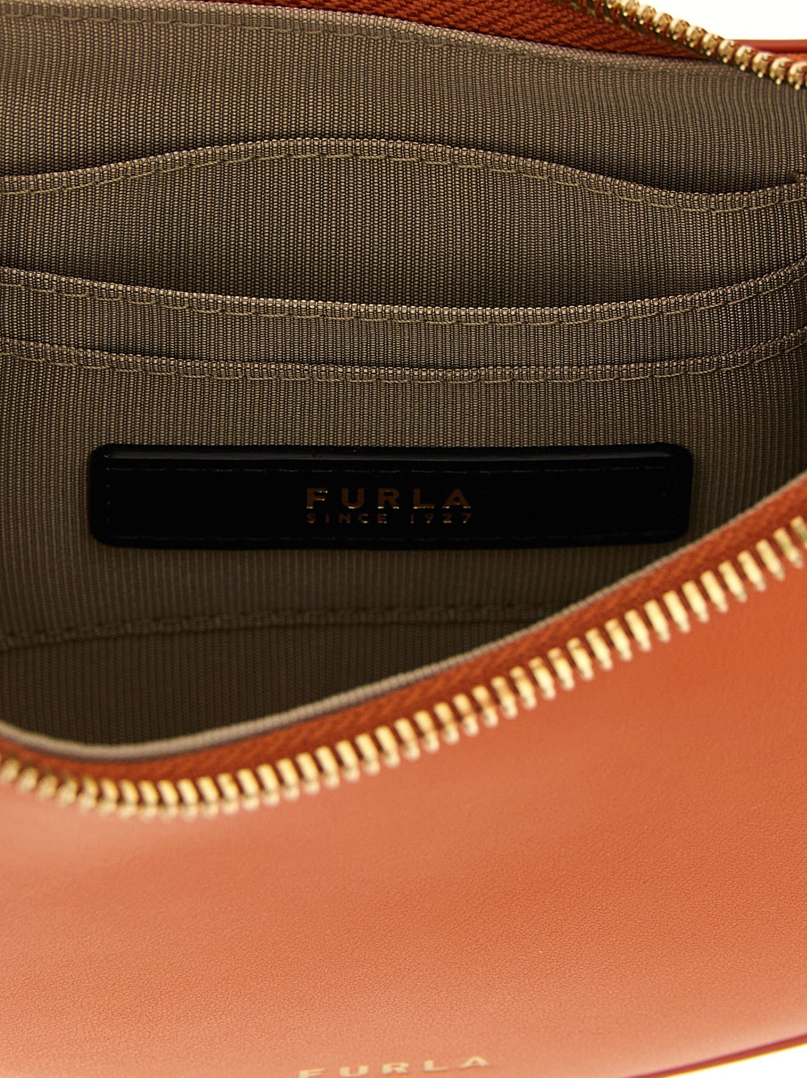 ‘Furla Delizia’ mini leather shoulder bag with a silky and smooth touch, rigid crescent structure, front embossed logo, top zip closure, adjustable handle with metal swivel mechanism.
