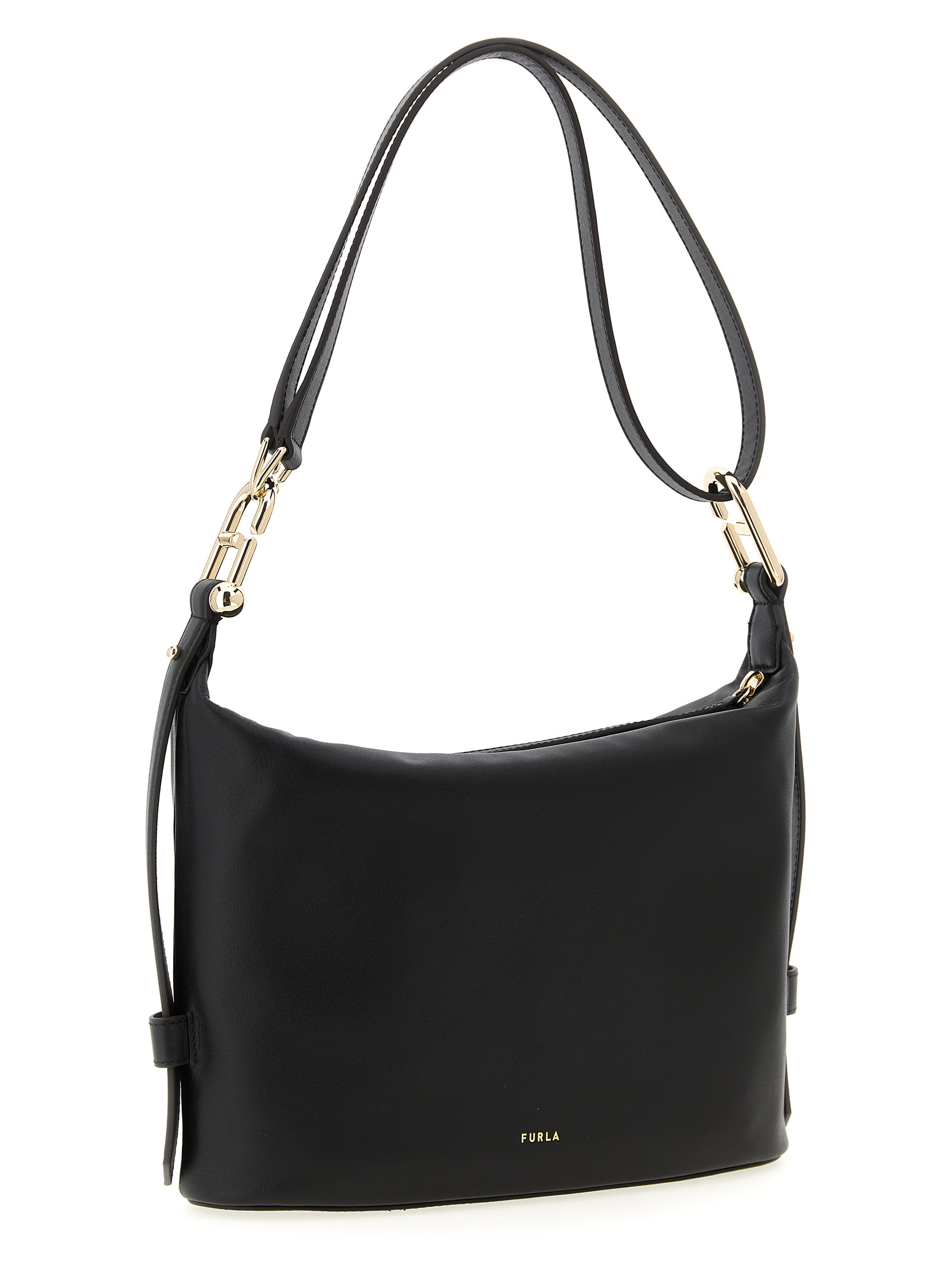 Furla Nuvola’ medium shoulder bag in grainy leather, adjustable and removable handle composed of two woven Arcosfera hardware that combine the iconic Arco Furla logo, top zip closure, and front embossed logo.