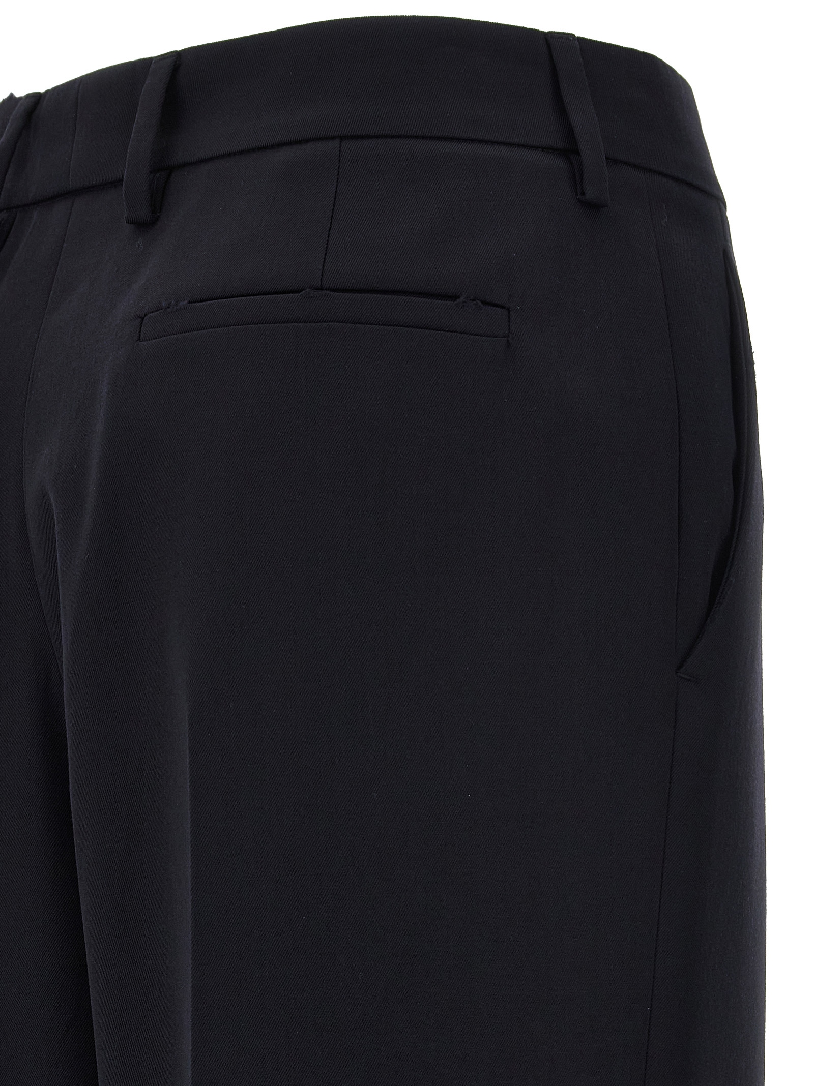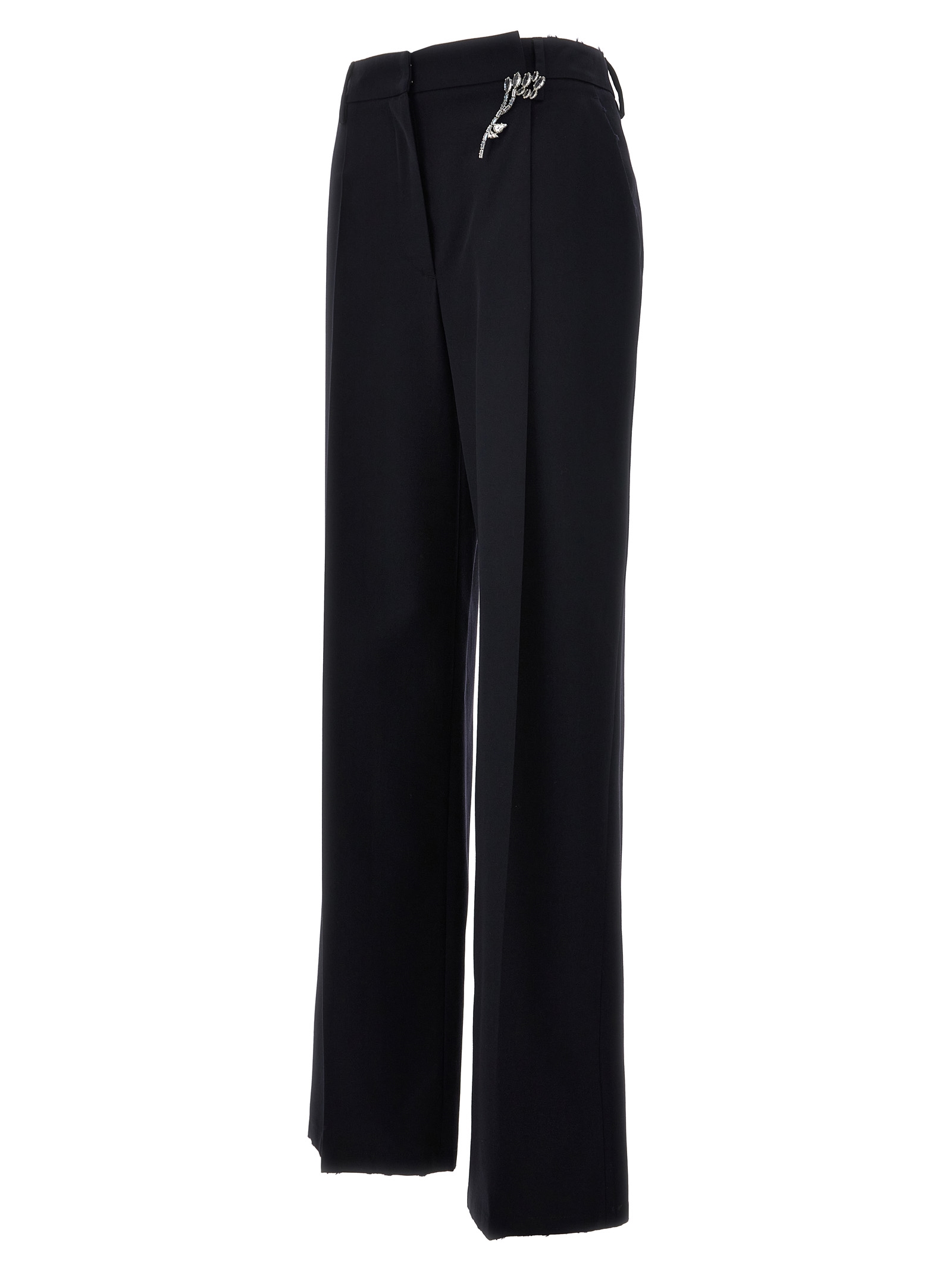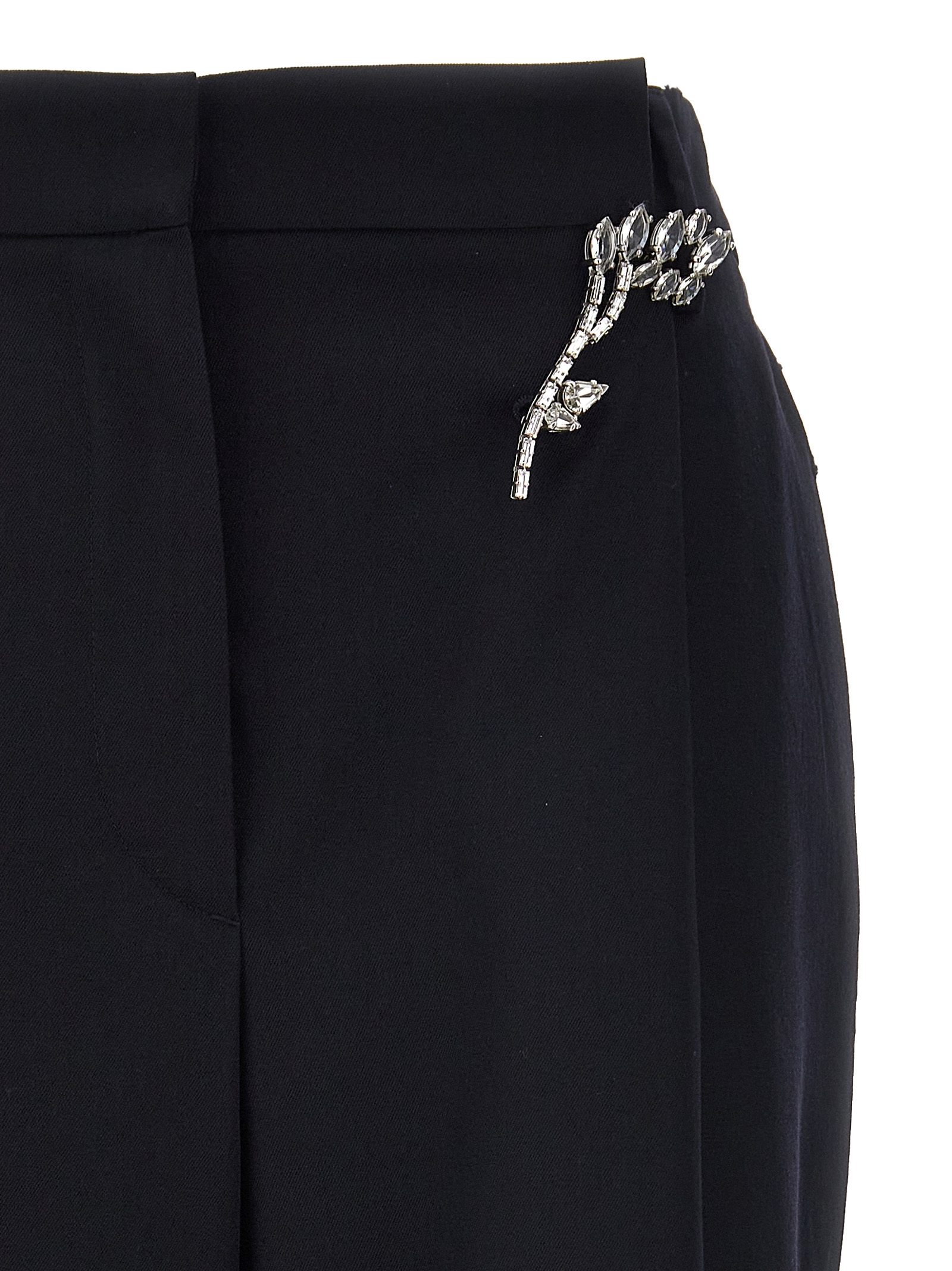 Wool gabardine pants, hook and button zip closure, pockets, straight leg with stretched crease and used-effect hem, jewel brooch detail.