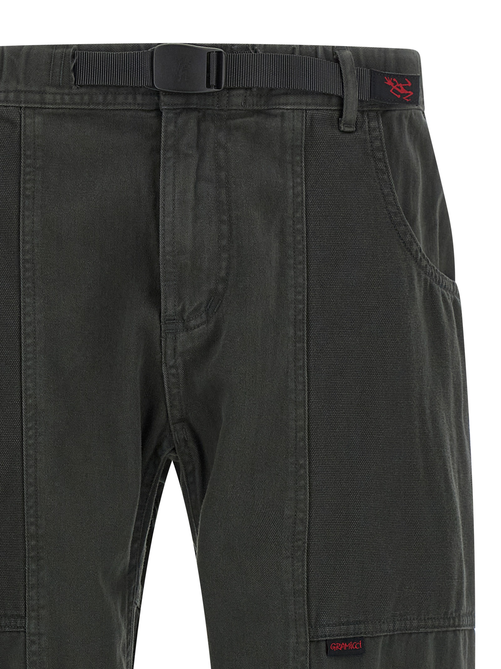 ‘Gadget’ cotton twill trousers with high resistance washed vintage effect, low waist, slightly cropped model, elastic waistband with integrated Gramicci belt system with adjustable ribbon cord, zip and front button closure, large pockets in resistant canvas dyed in tone-on-tone garment.