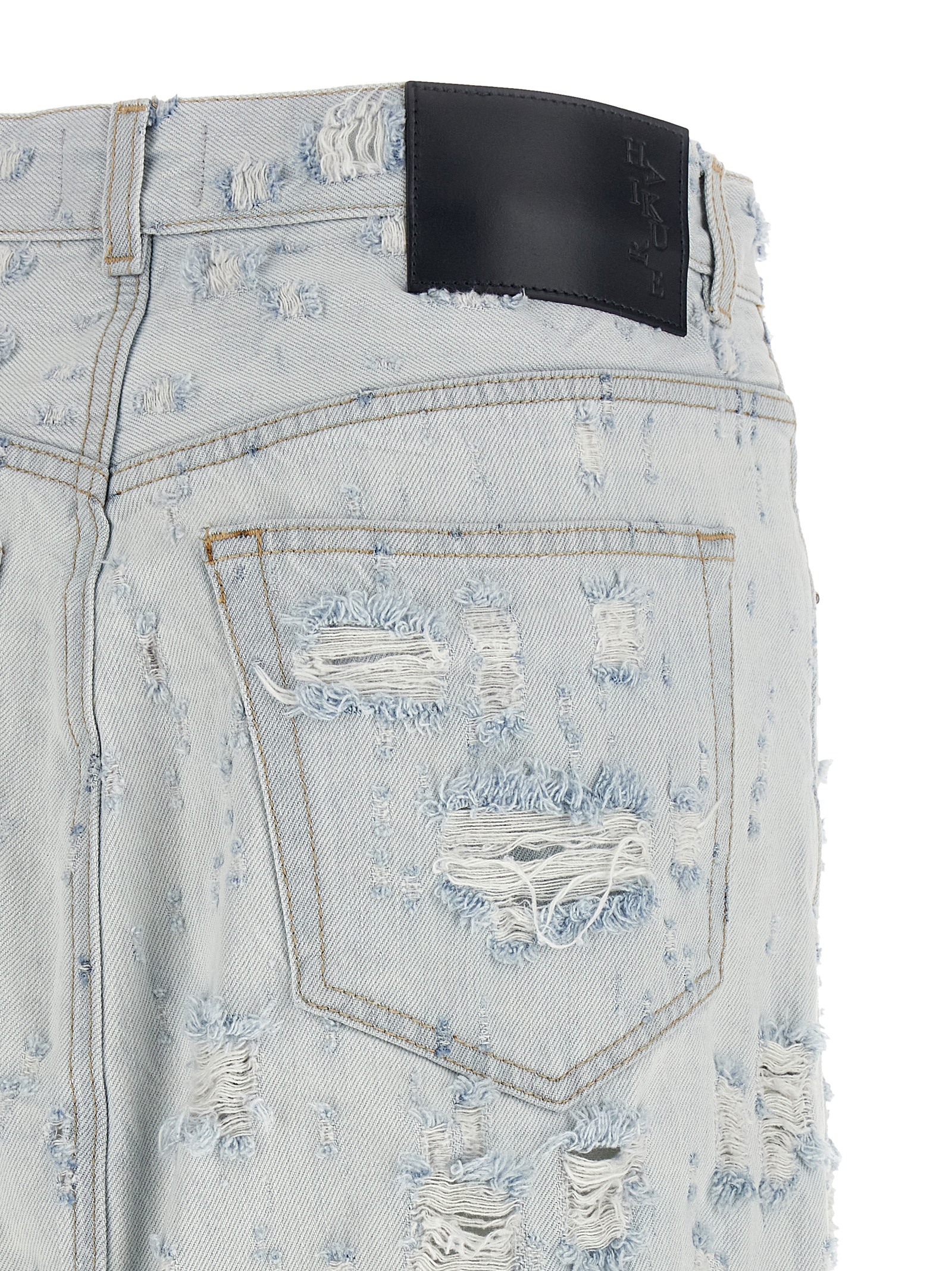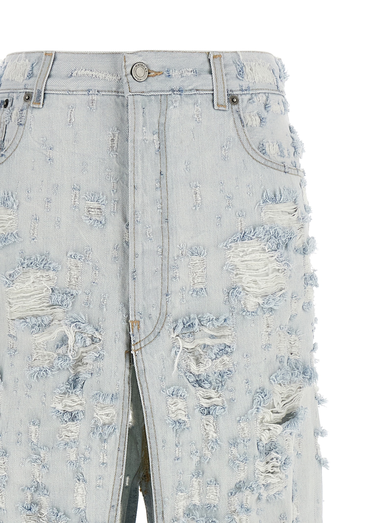 ‘Gana’ long skirt in destroyed cotton denim with all-over rips and fraying, contrast stitching, wide front and back split, regular waist, front button closure, five pockets, back leather logo tag, garment with frayed raw cut hem.
