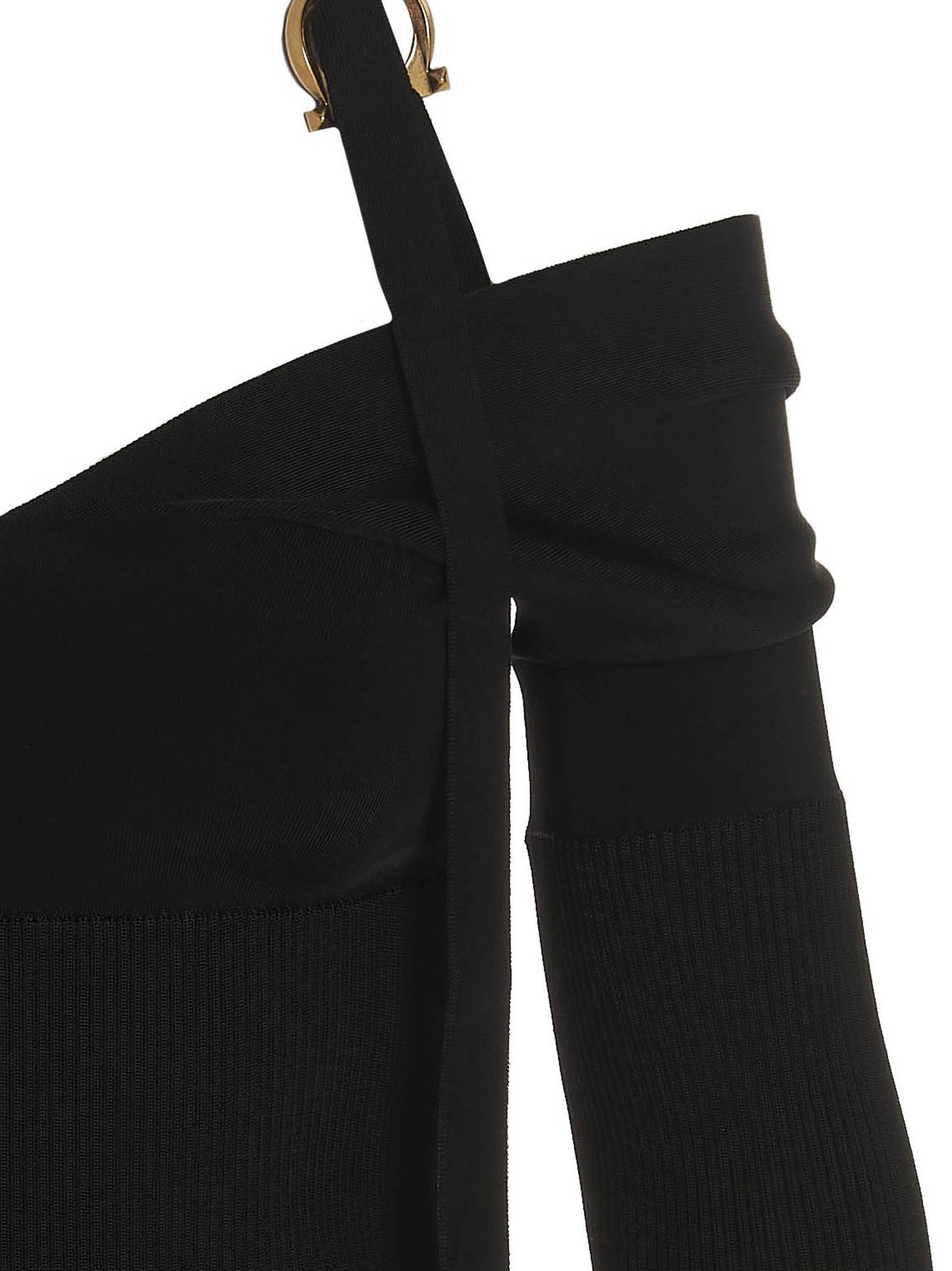 Stretch viscose dress with wide neckline, bare shoulders and back, ribbed insert on the chest and on the elbow, tape on the neckline with ‘Gancini’ buckle in an antique gold finish. JULIAN SUSTAINABLE: The viscose of this dress comes from responsible sources.