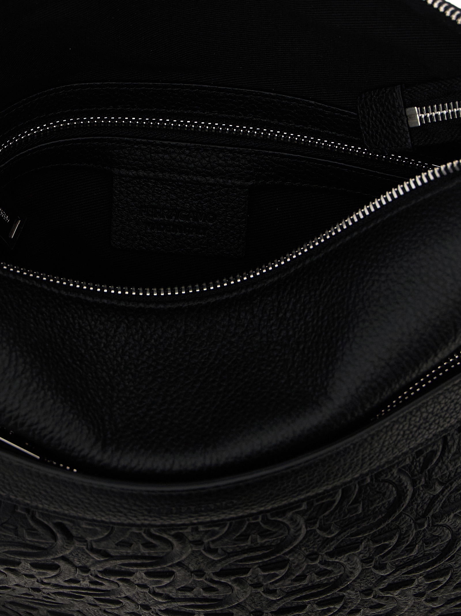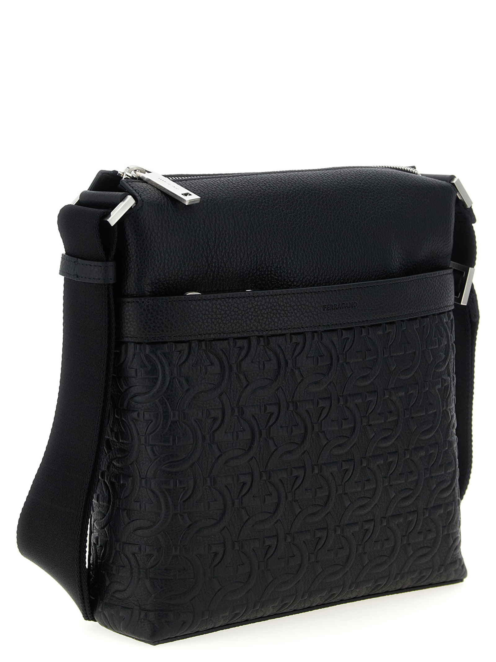 Hammered calf leather shoulder strap with front ‘Gancini’ embossed insert, top zip closure, front zip pocket, adjustable fabric shoulder strap.