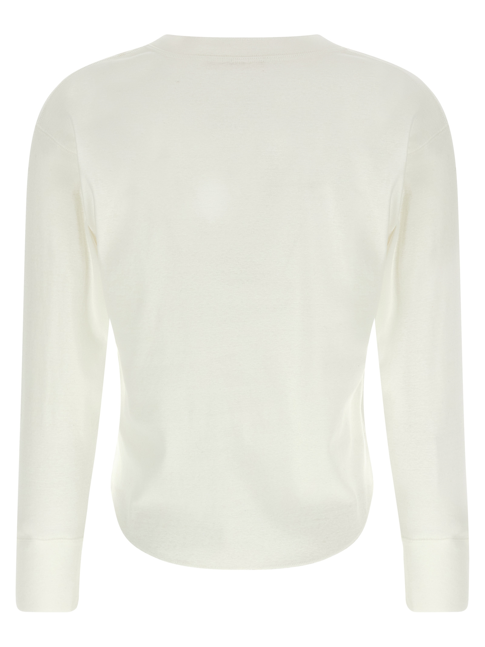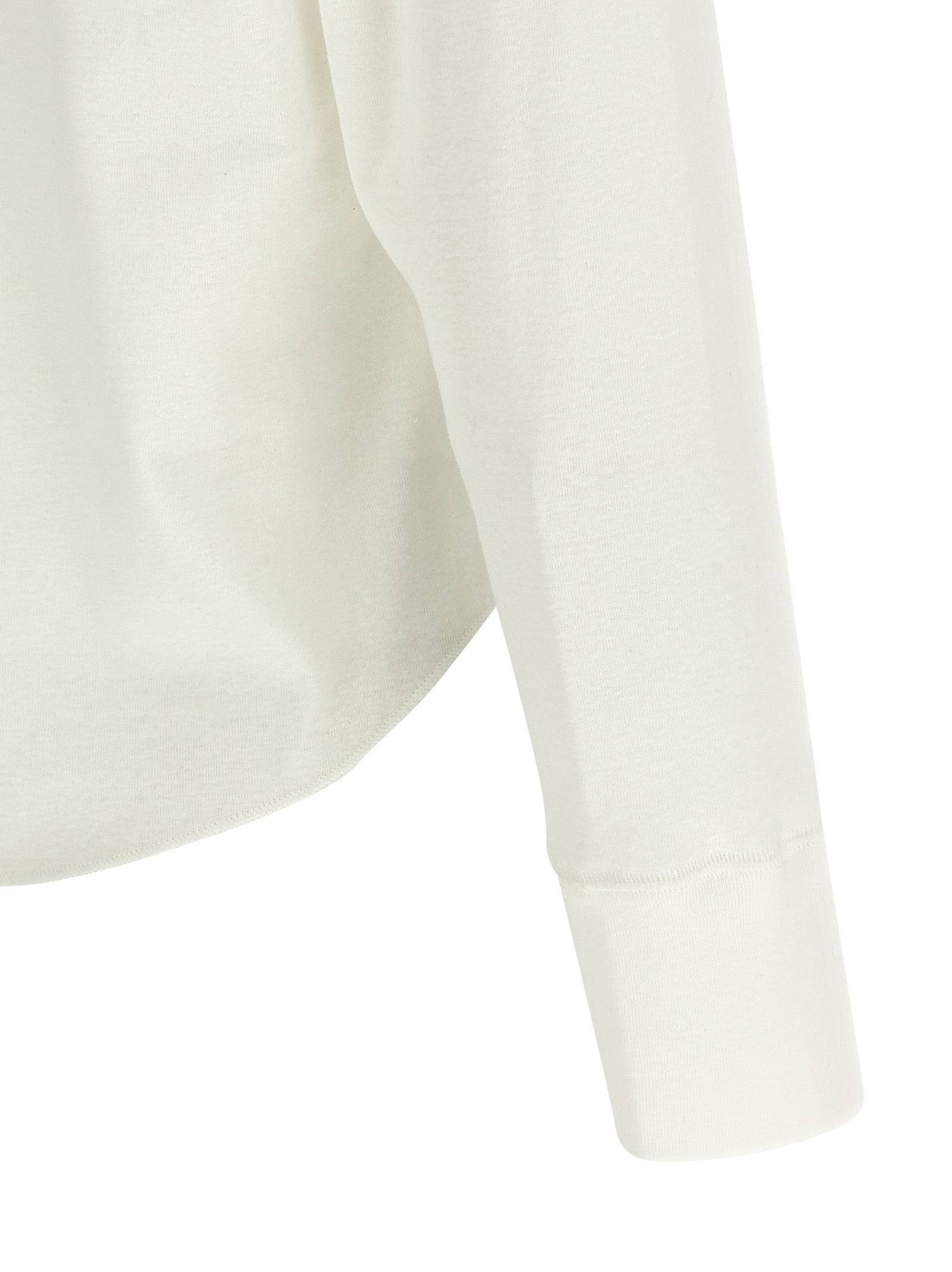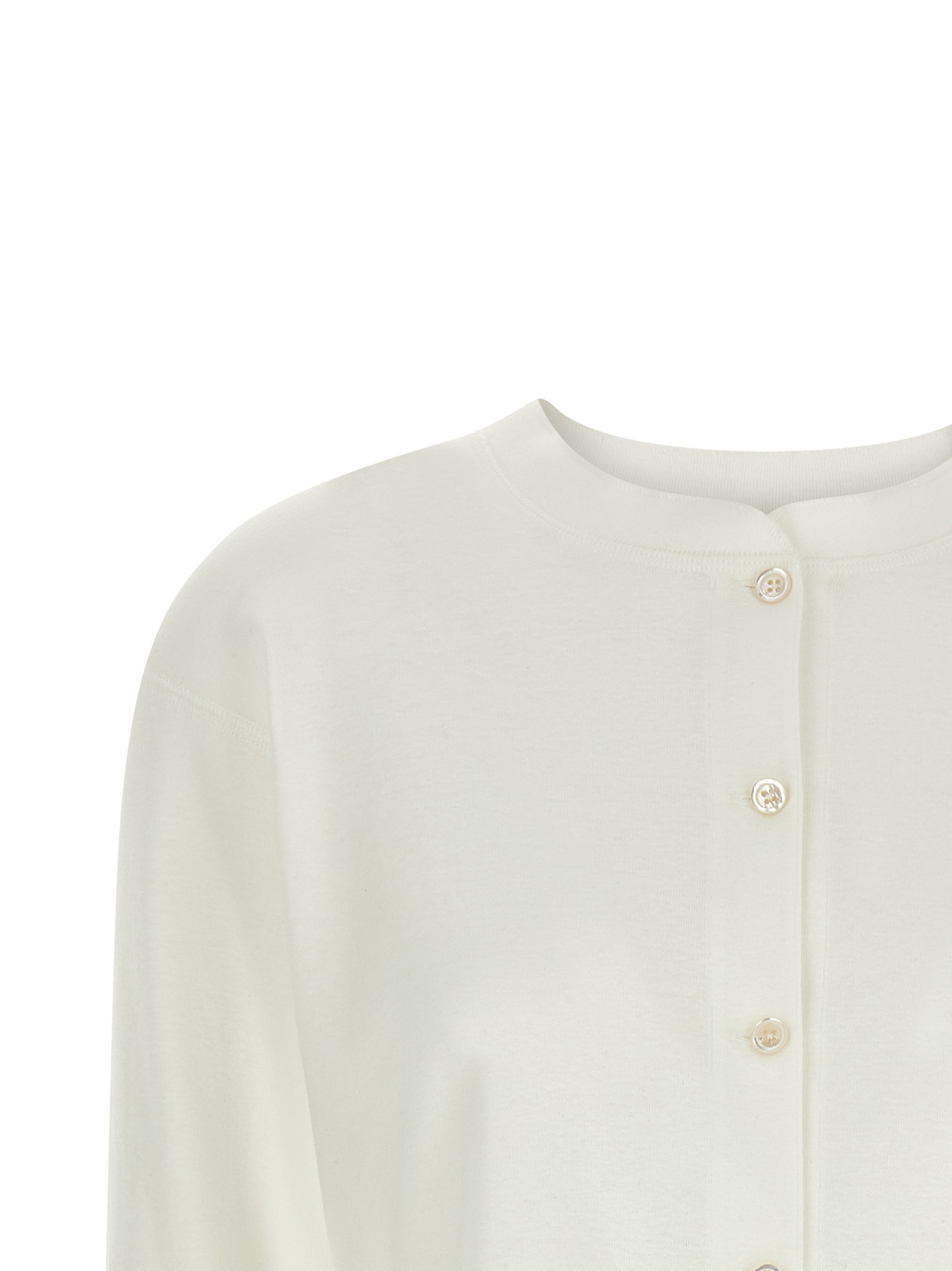 ‘Gano’ crop top in Japanese cotton jersey with tone-on-tone cross-stitch stitching, crew neck, front mother-of-pearl button closure, long cuffed sleeves, rounded and asymmetrical hem.