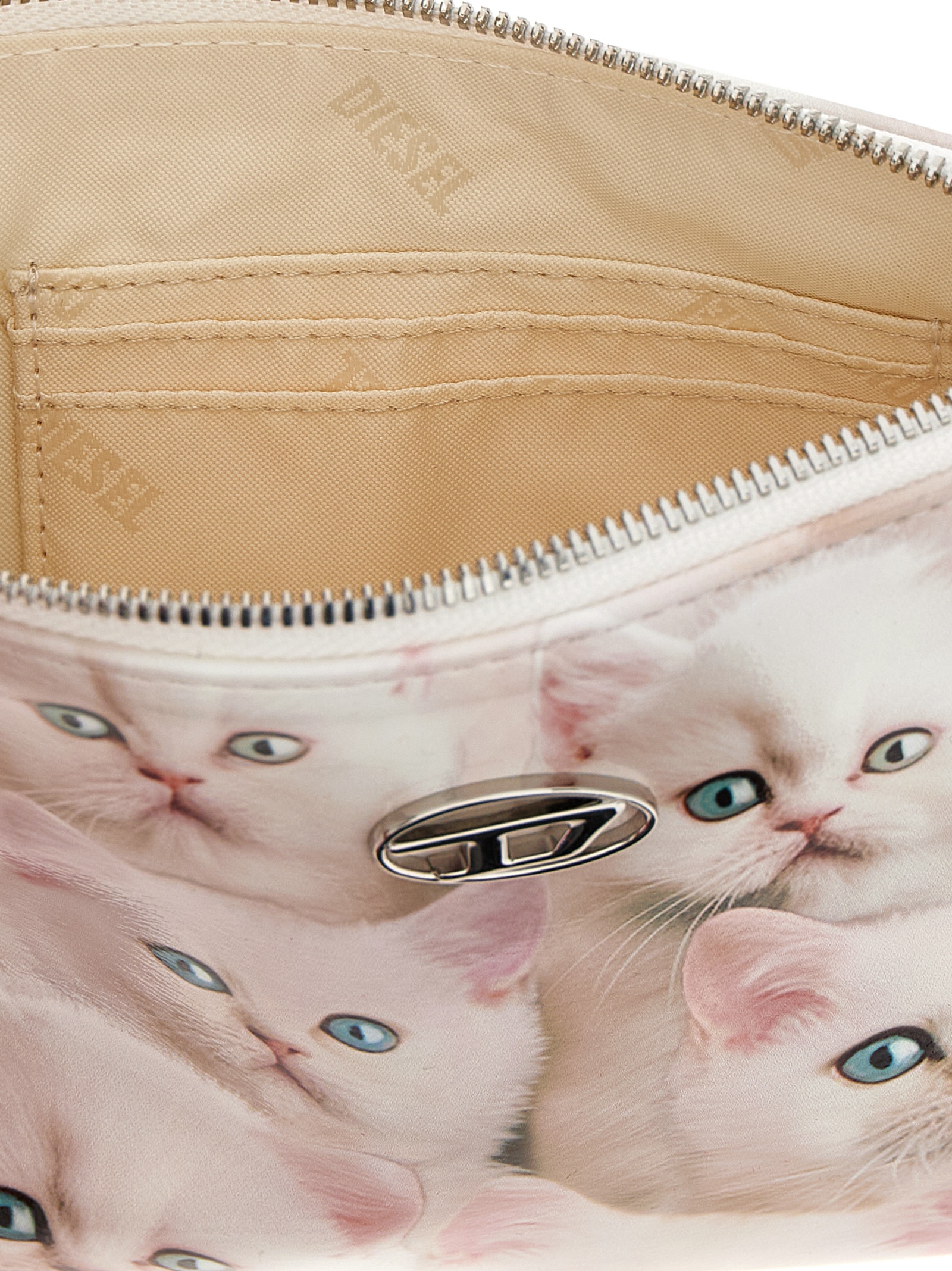Flat clutch bag in glossy fabric with all-over ‘Gatti’ print, zip closure, front logo patch.