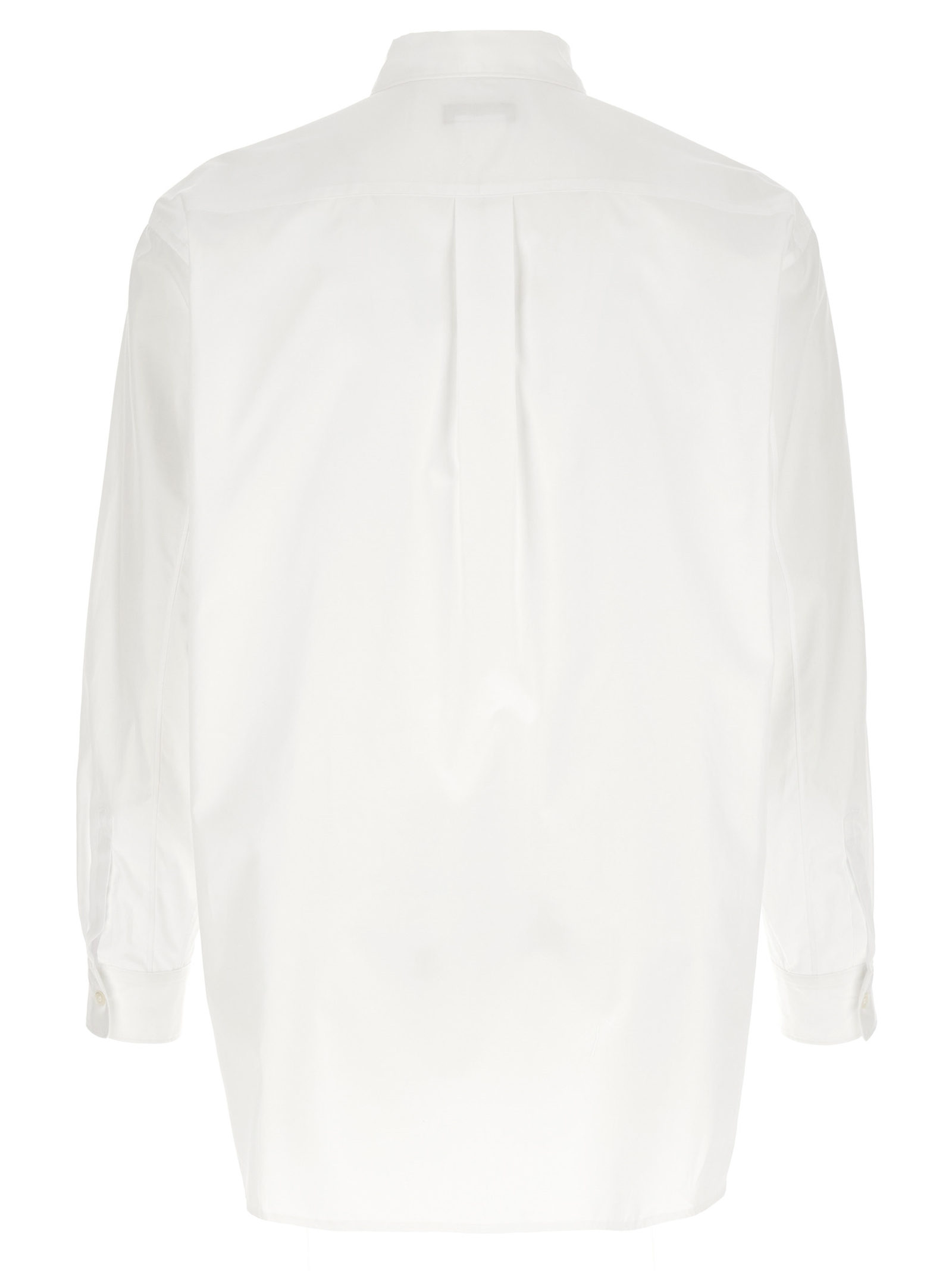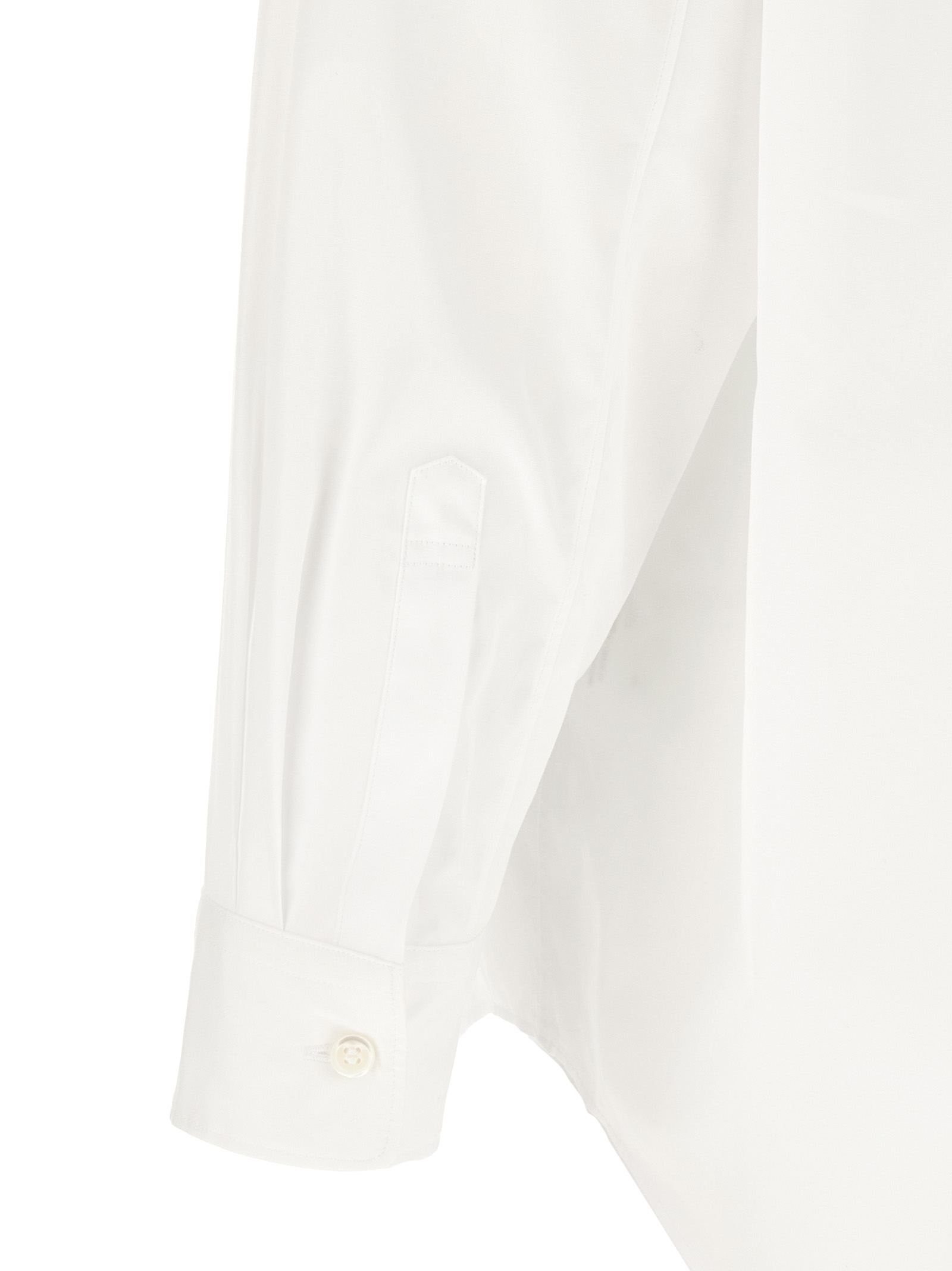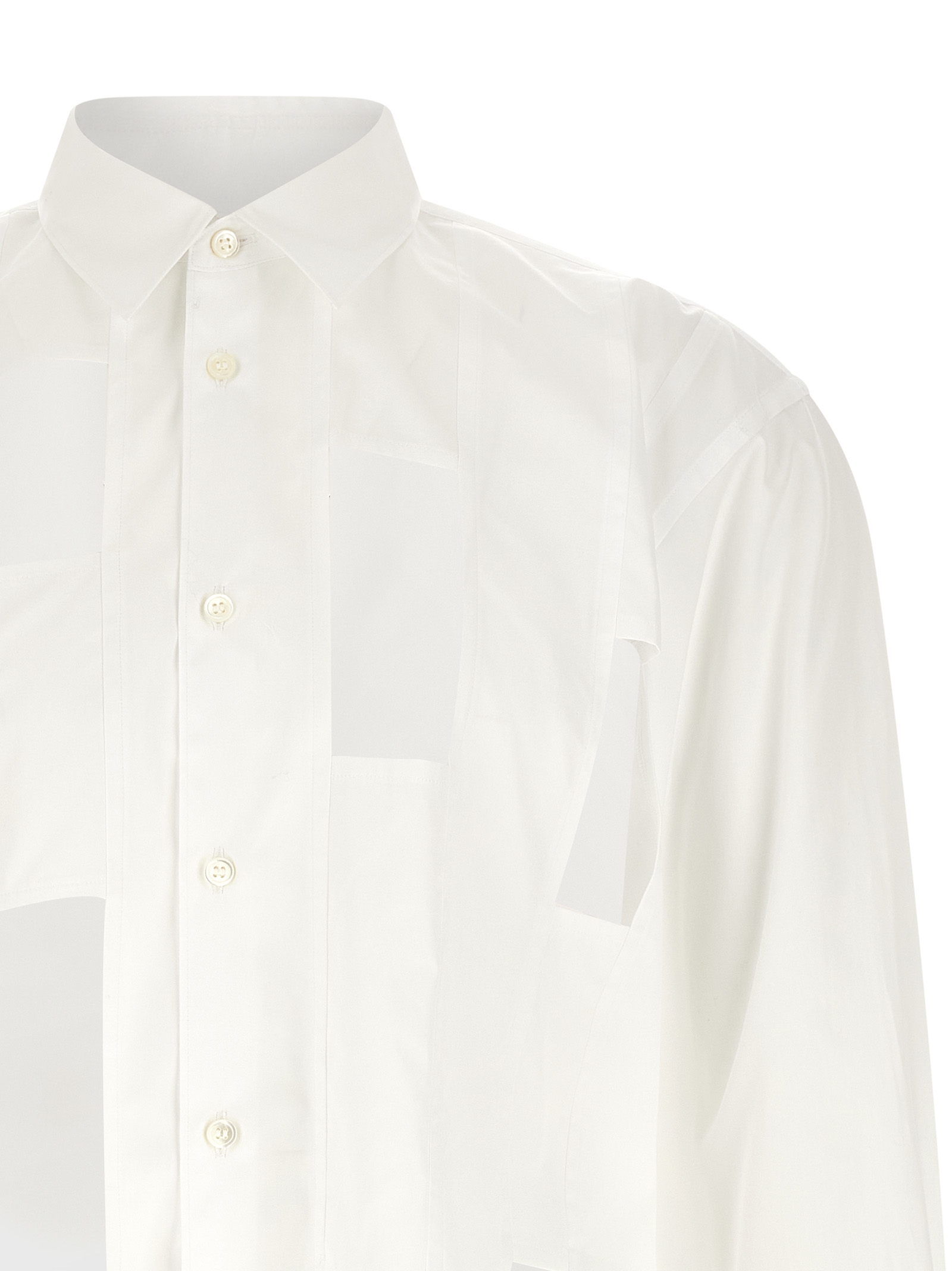 Light cotton poplin shirt with geometric front cut-outs, pointed collar, mother-of-pearl button closure, long sleeves with cuffs and dropped shoulders, rounded and asymmetrical hem.