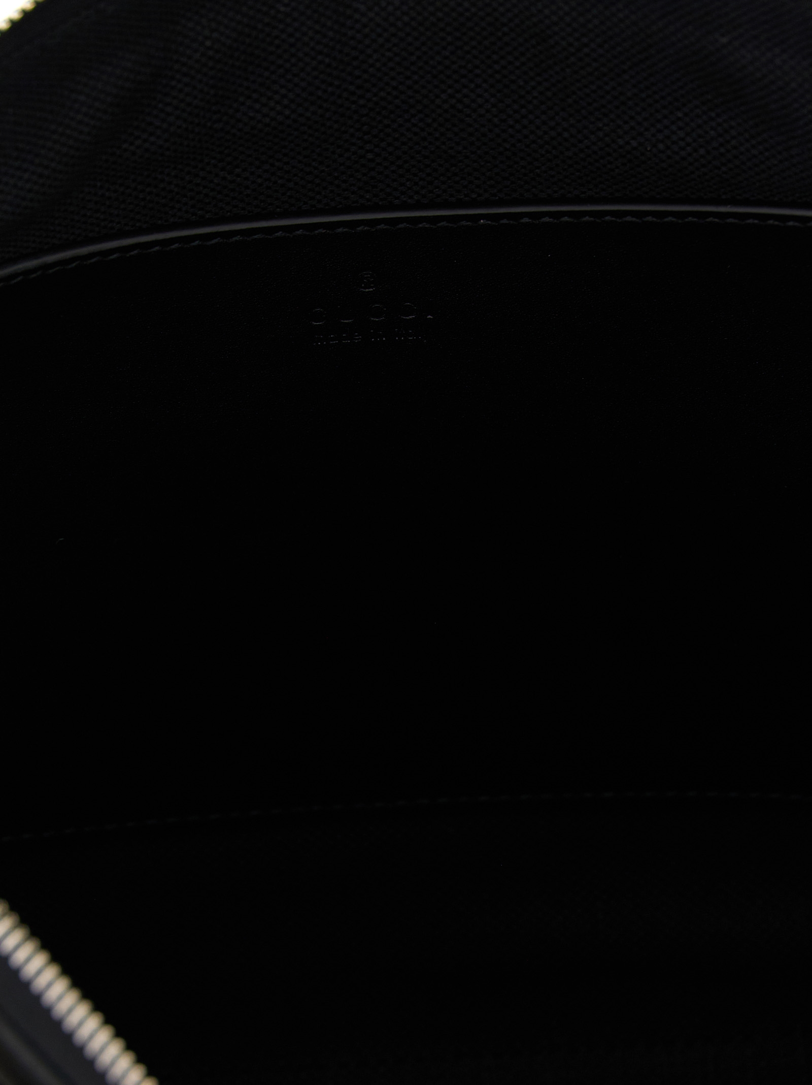 GG Emblem’ leather pouch with embossed GG pattern, cotton and linen lining, zip closure, wrist strap with removable Web ribbon detail.