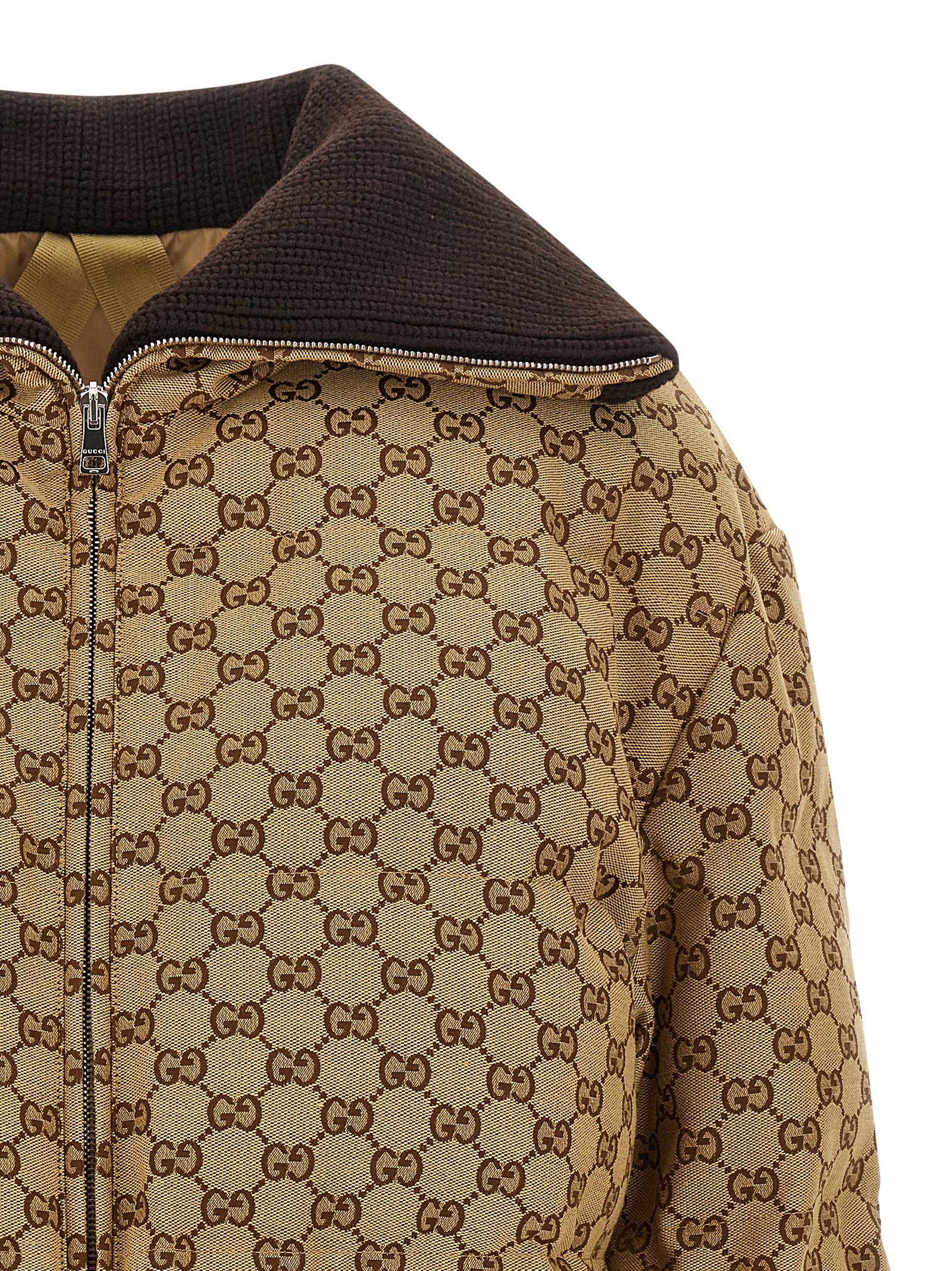 GG Original fabric ski jacket with ribbed knit details, padded quilted nylon lining, foldable turtleneck, front zip closure, pockets, drawstring at the waist, long cuffed sleeves, inner gaiter.