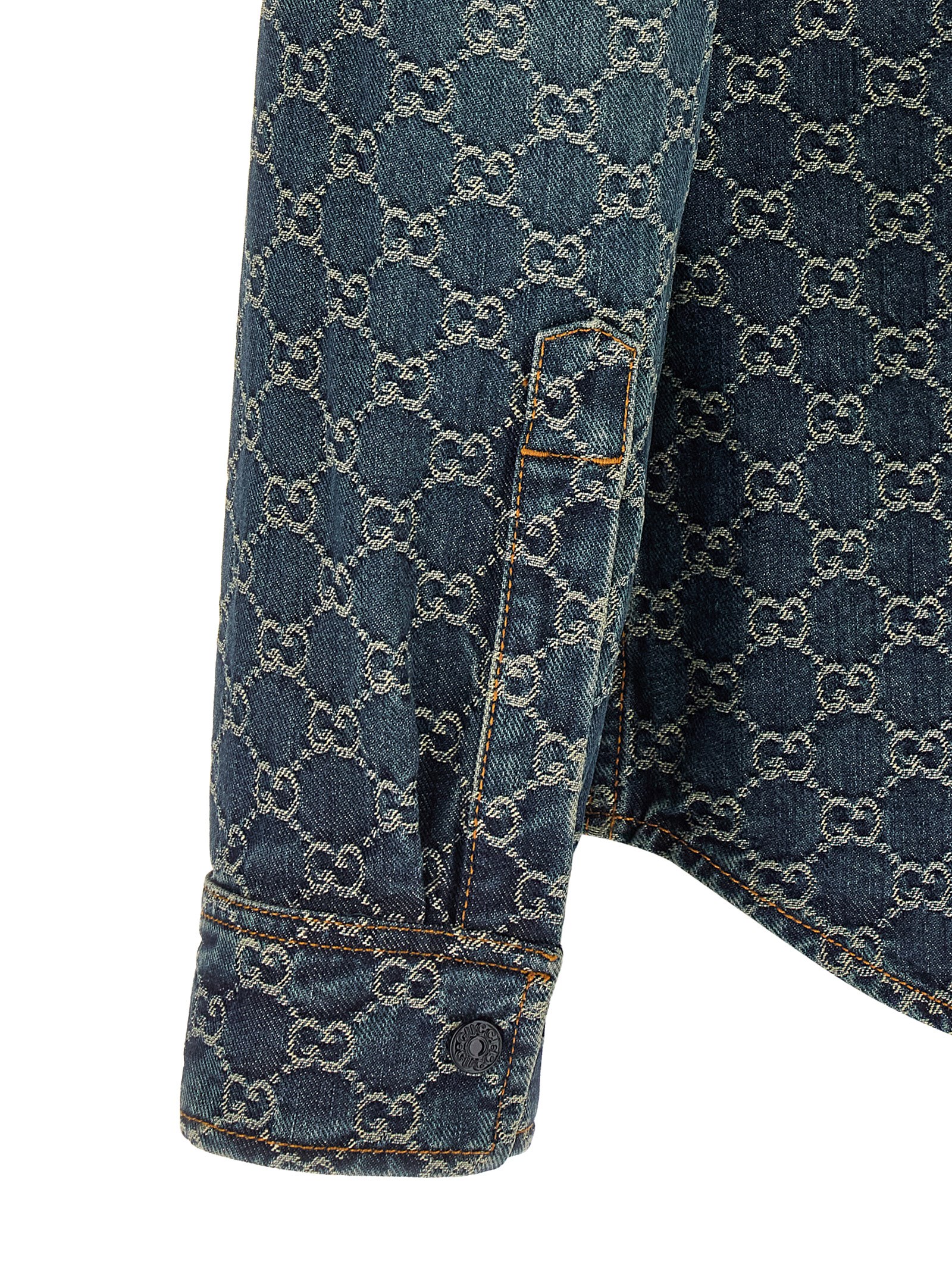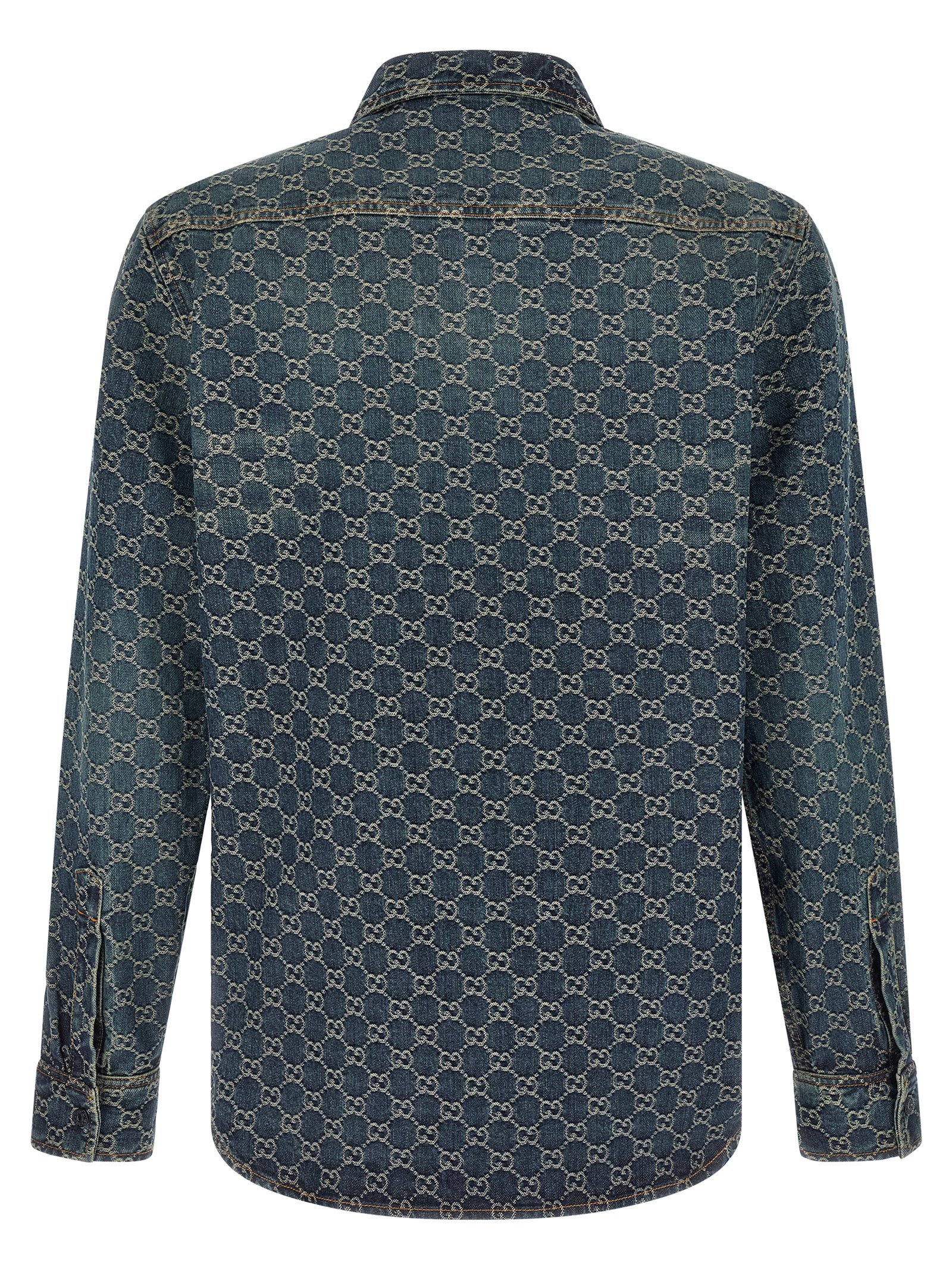 GG jacquard cotton denim shirt with délavé effect, contrast stitching, pointed collar, front snap button closure, long cuffed sleeves, rounded hem.
