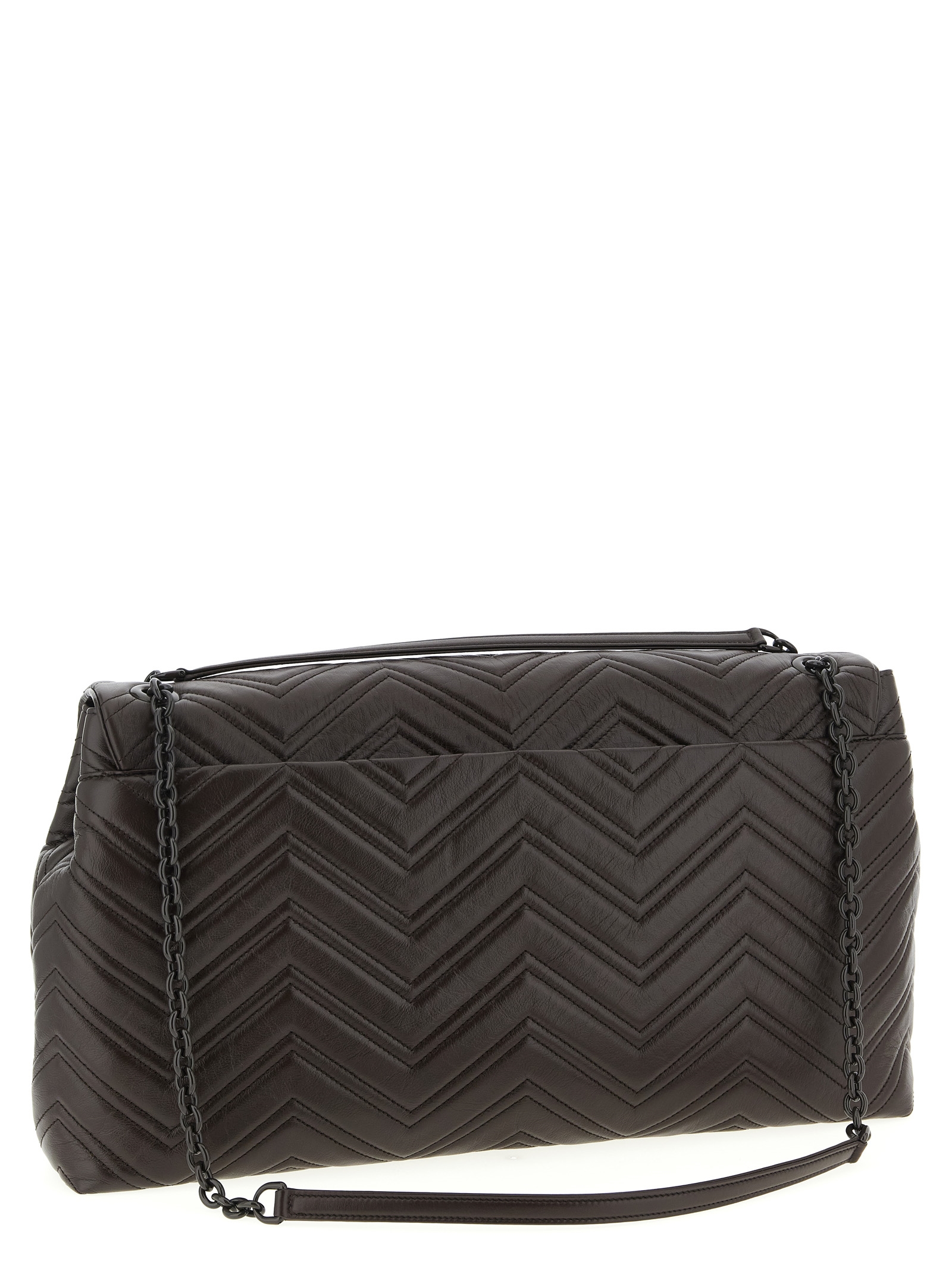 ‘GG Marmont’ large shoulder bag in quilted matelassé leather with chevron pattern, sliding enameled chain shoulder strap with leather handles.