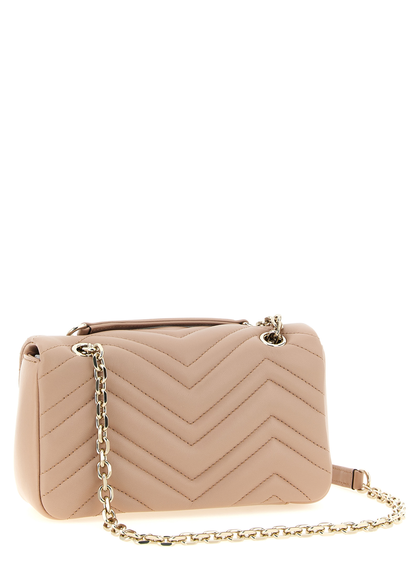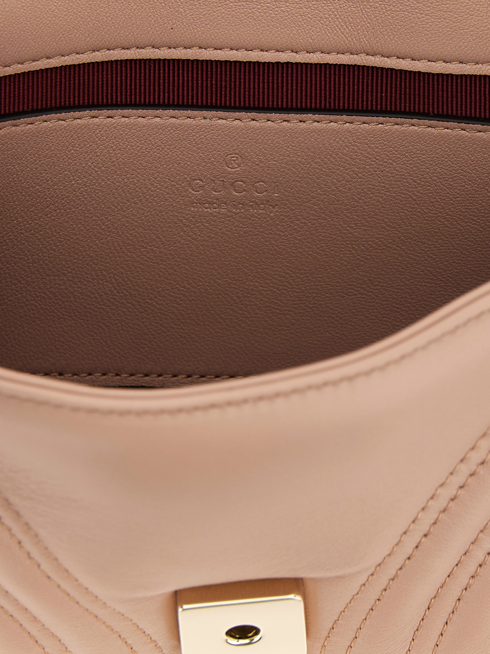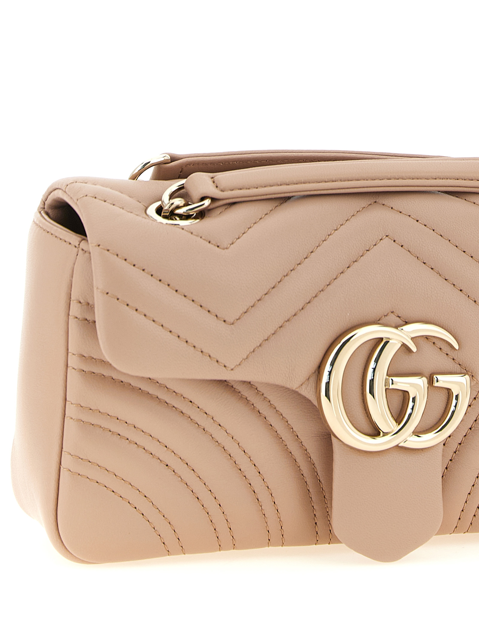 Small ‘GG Marmont’ shoulder bag in chevron matelassé lambskin leather, viscose lining, inner pocket, magnetic flap closure with front metal ‘Doppia G’ detail, and sliding faceted chain shoulder strap with leather protection.
