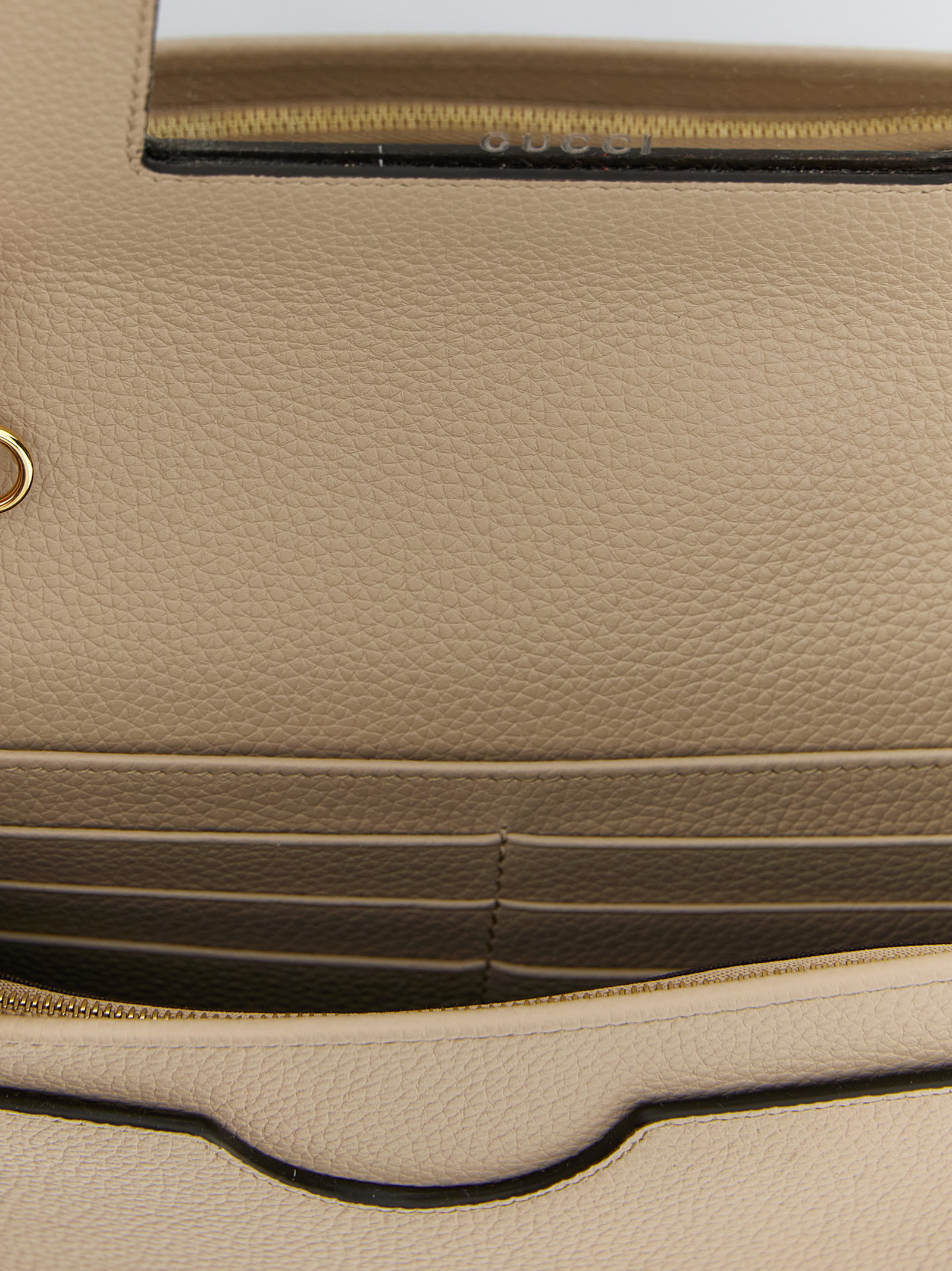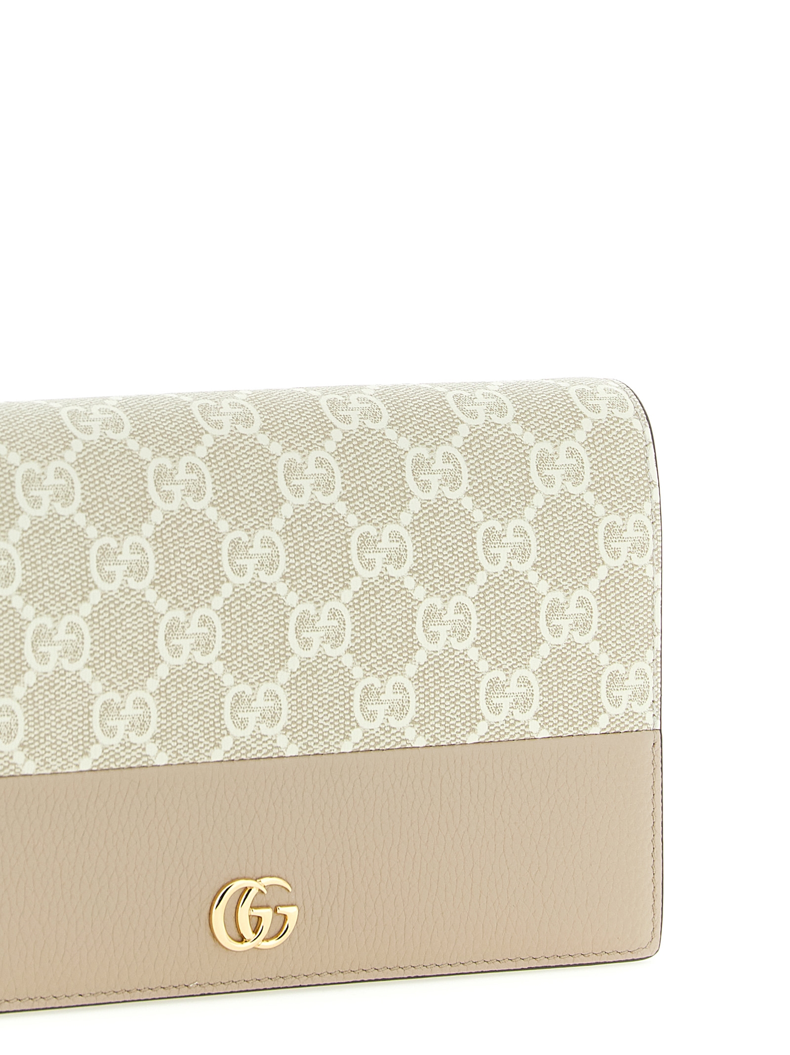 ‘GG Marmont’ leather and ‘GG Supreme’ wallet on chain, taffeta lining, flap closure with snap button and metal ‘Doppia G’ detail on the front, removable chain shoulder strap.