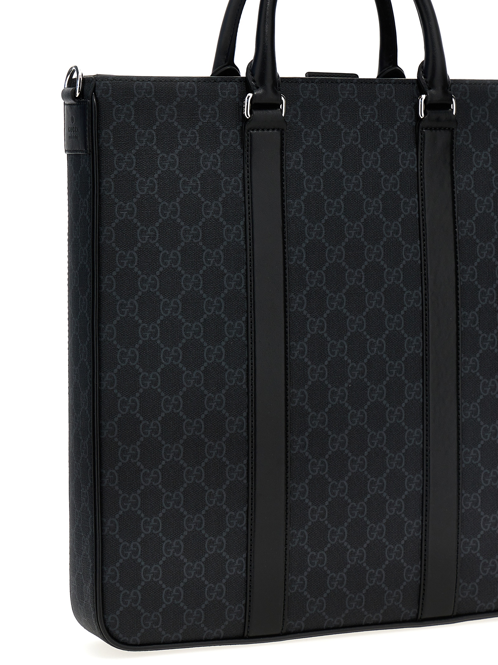 ‘GG’ media’ shopping bag in GG Supreme fabric with leather details, double handle, adjustable shoulder strap and removable web tape.