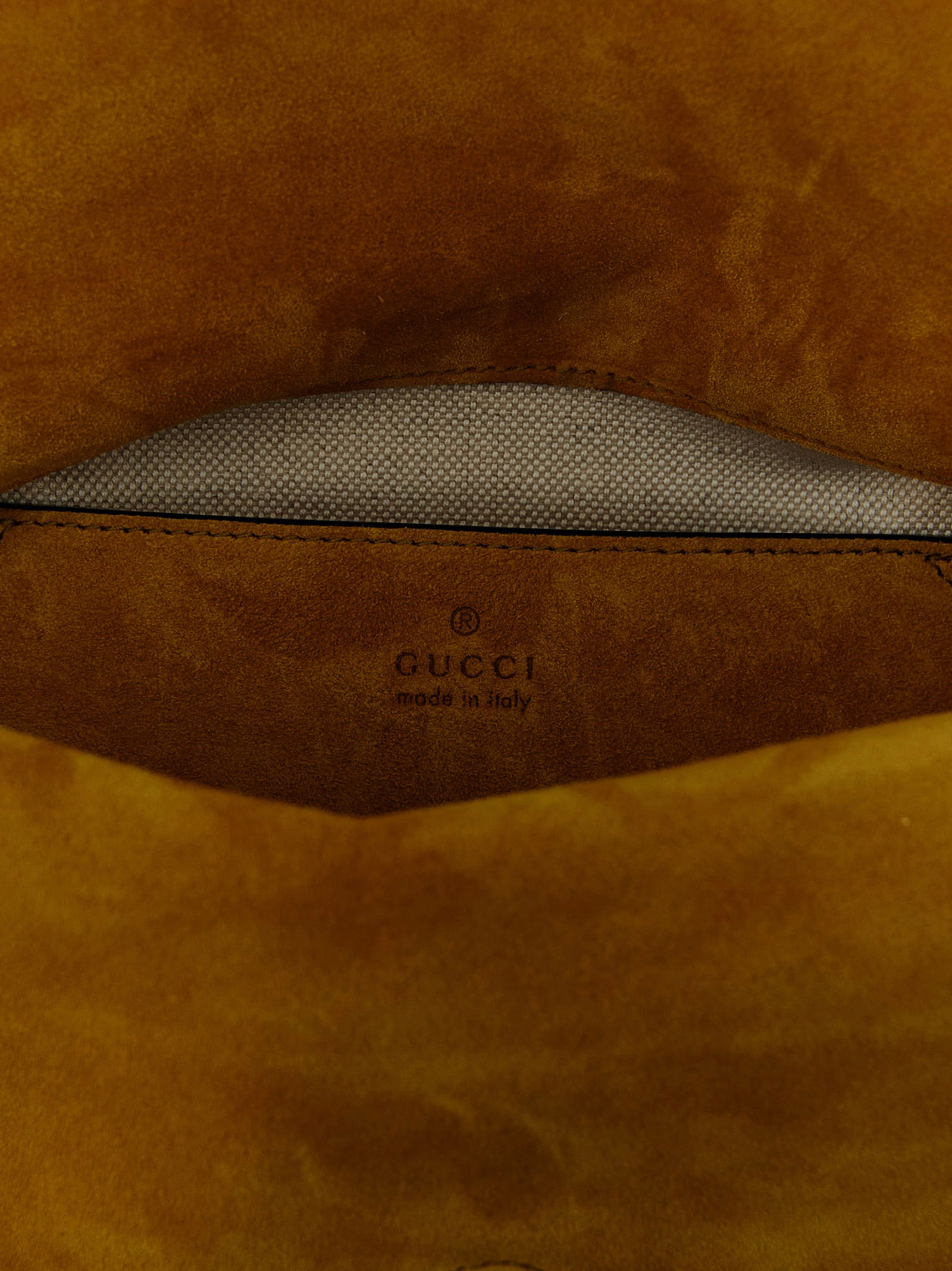 Medium suede shoulder bag with embossed GG, cotton and linen lining, two-bellows construction, magnetic flap closure, antiqued effect chain handle with fixed ‘Incrocio GG’ detail, adjustable and removable leather shoulder strap.