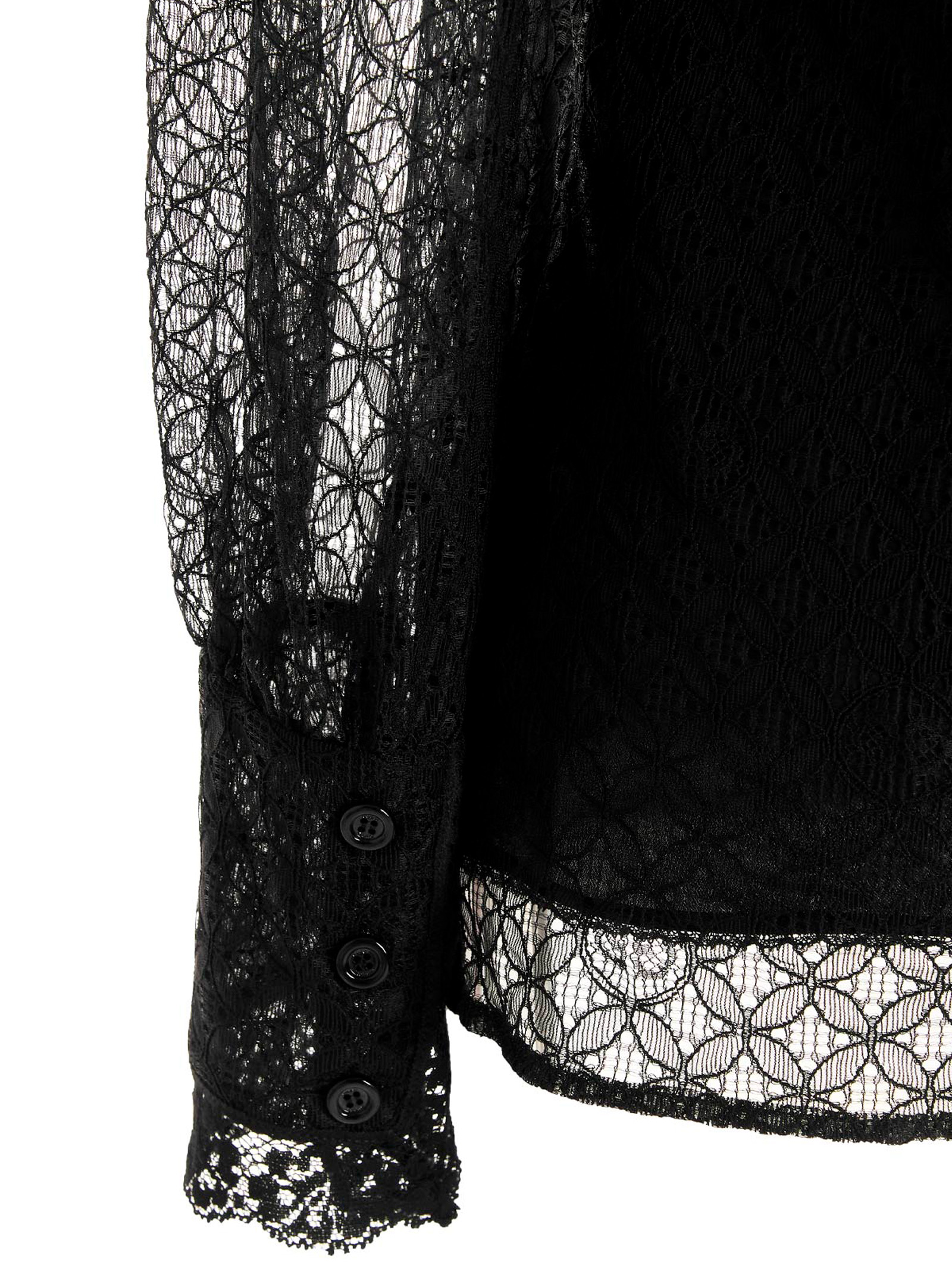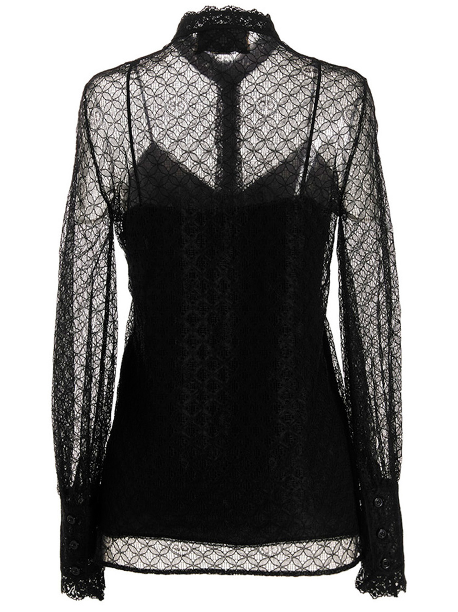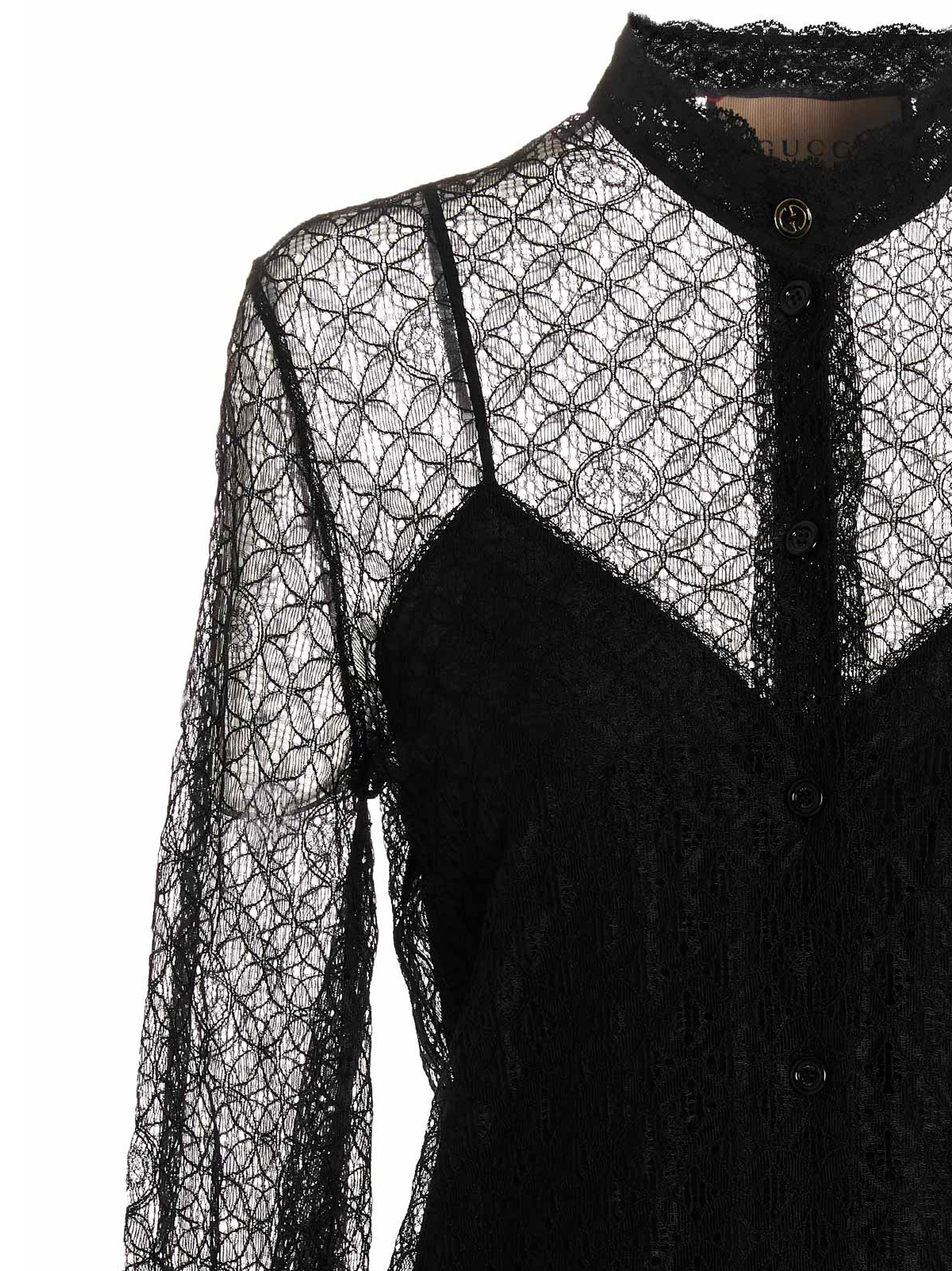 GG’ geometric lace shirt with removable tank top, high neck, long puff sleeves and a button closure.