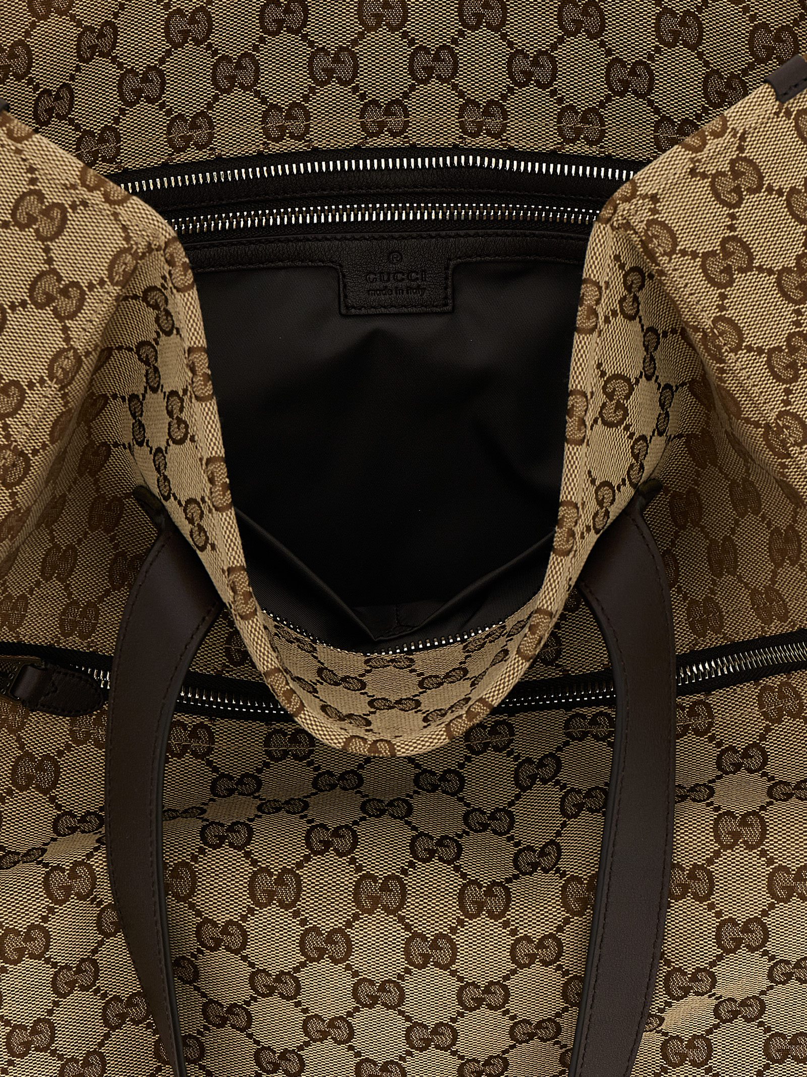 GG fabric shoulder bag, double fixed leather handle, top zip closure, front zip pocket and Web ribbon detail, nylon lining.
