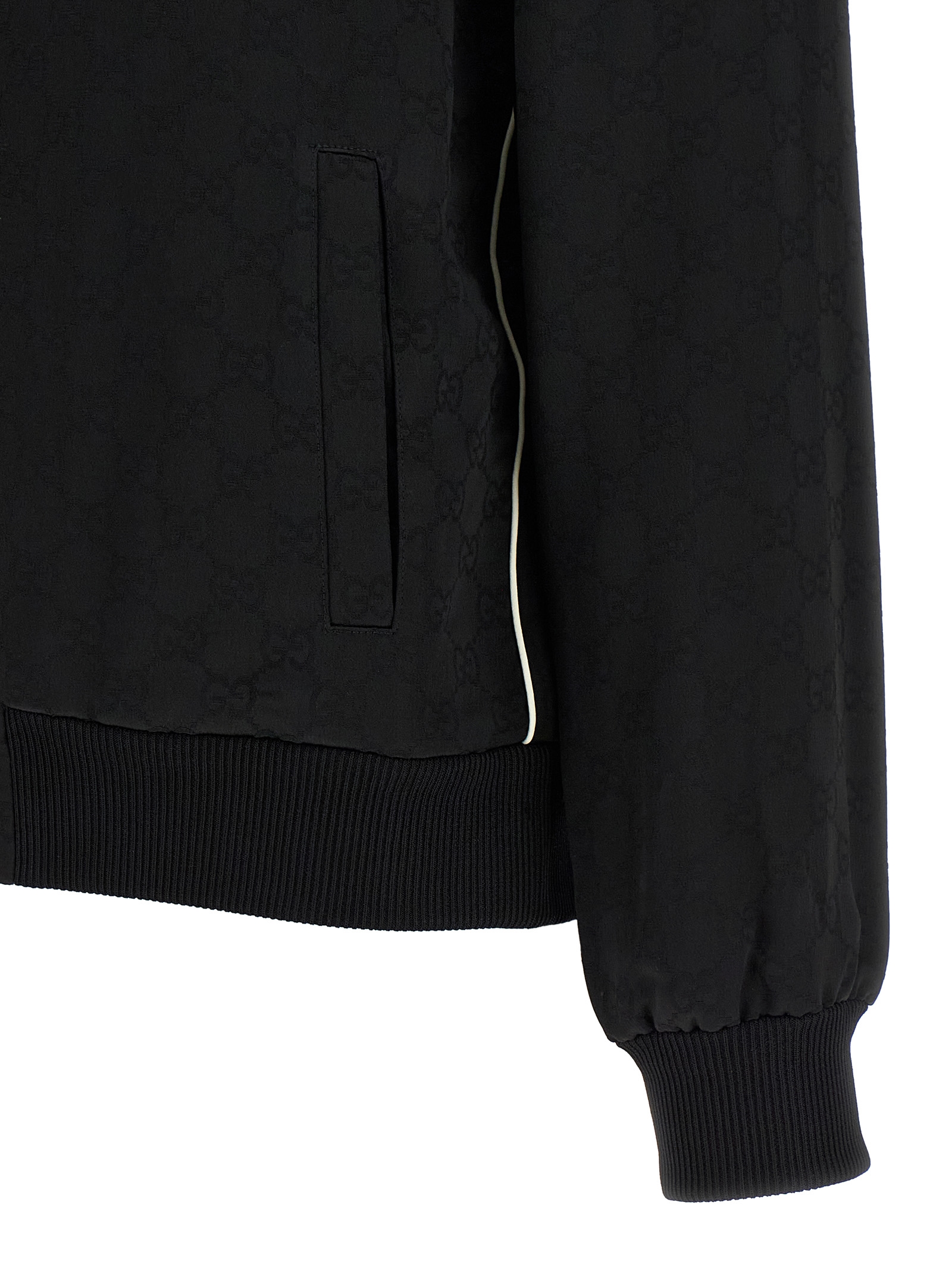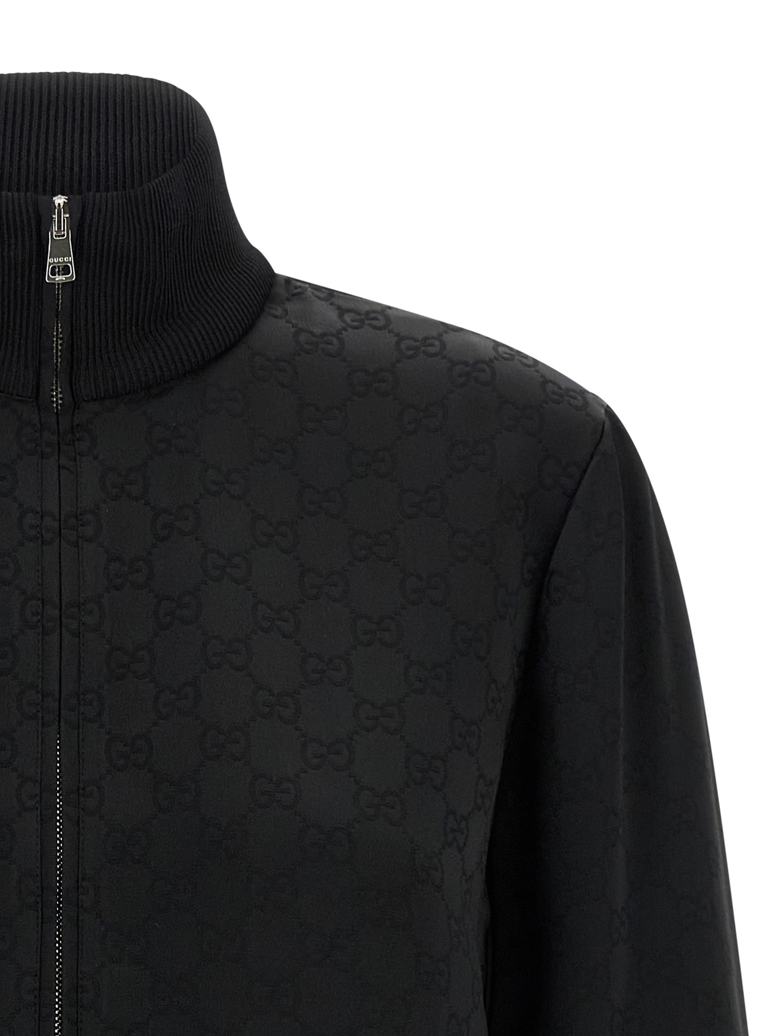Silk-effect viscose satin sweatshirt, all-over GG print, front zip closure, high neck, cuffs, ribbed knit hem, side contrast piping, pockets.