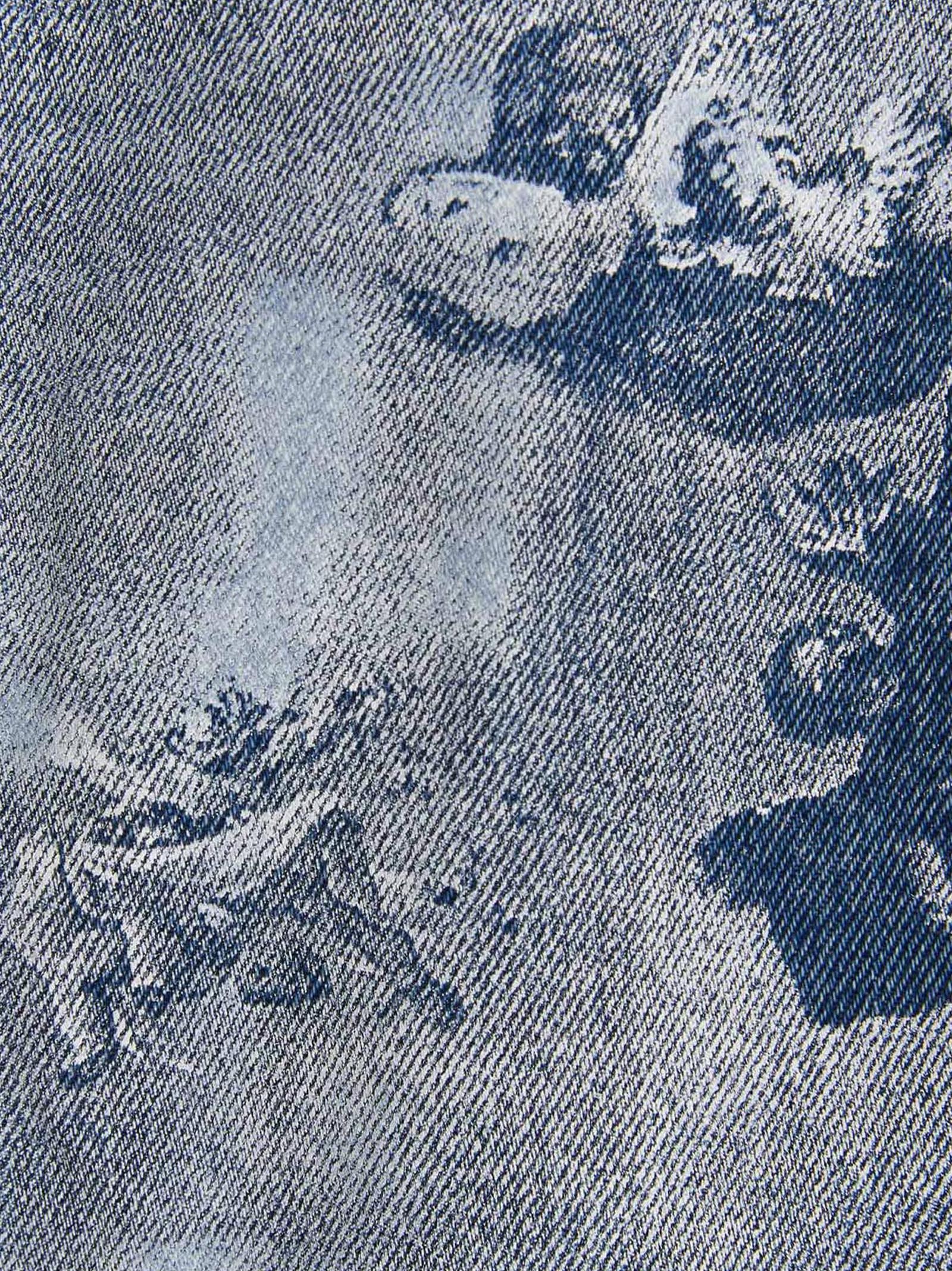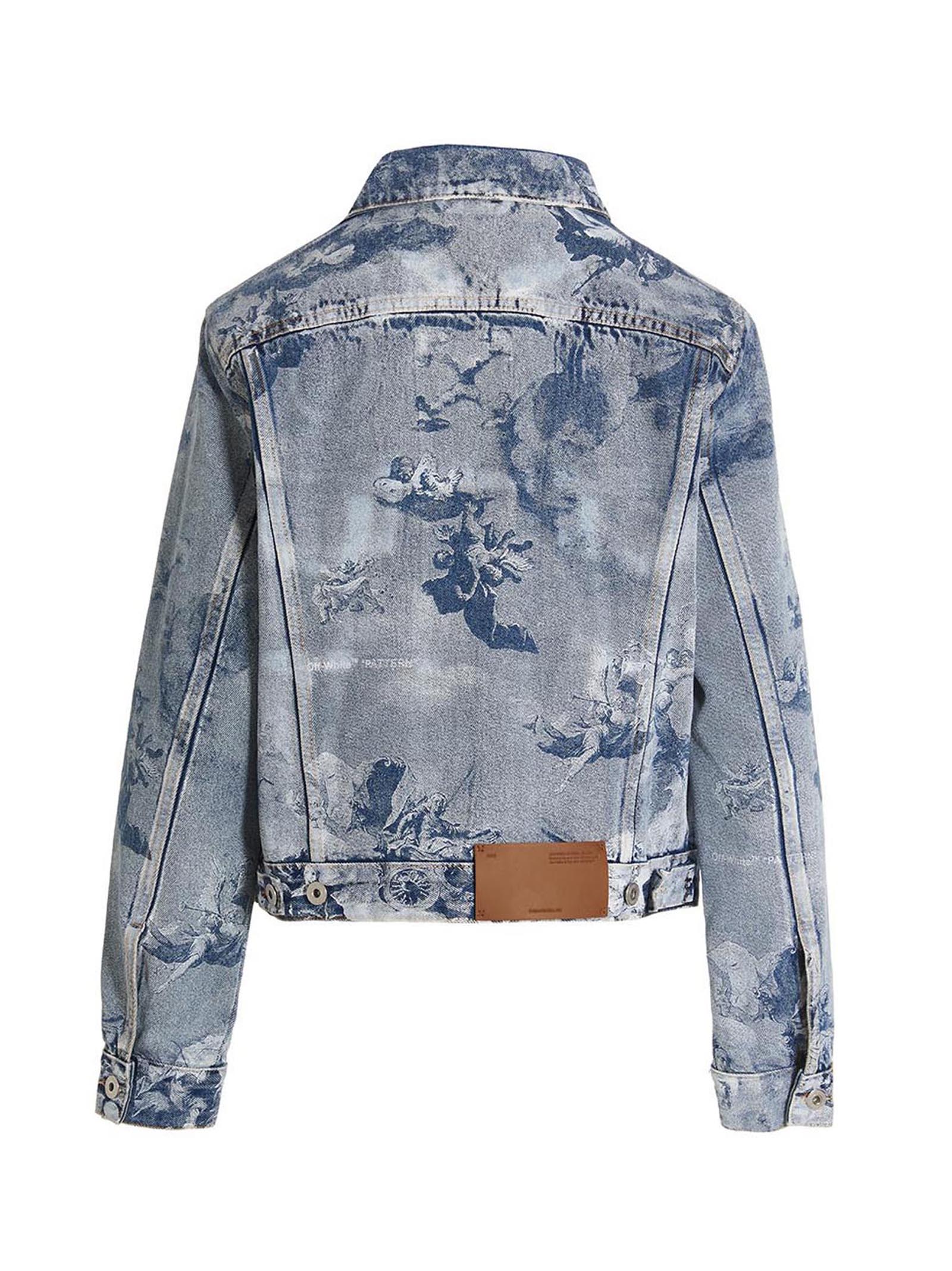 Giacca in denim ‘Sky meteor’ effetto devorè all over, texture gommata, modello con cut out e chiusura bottoni.